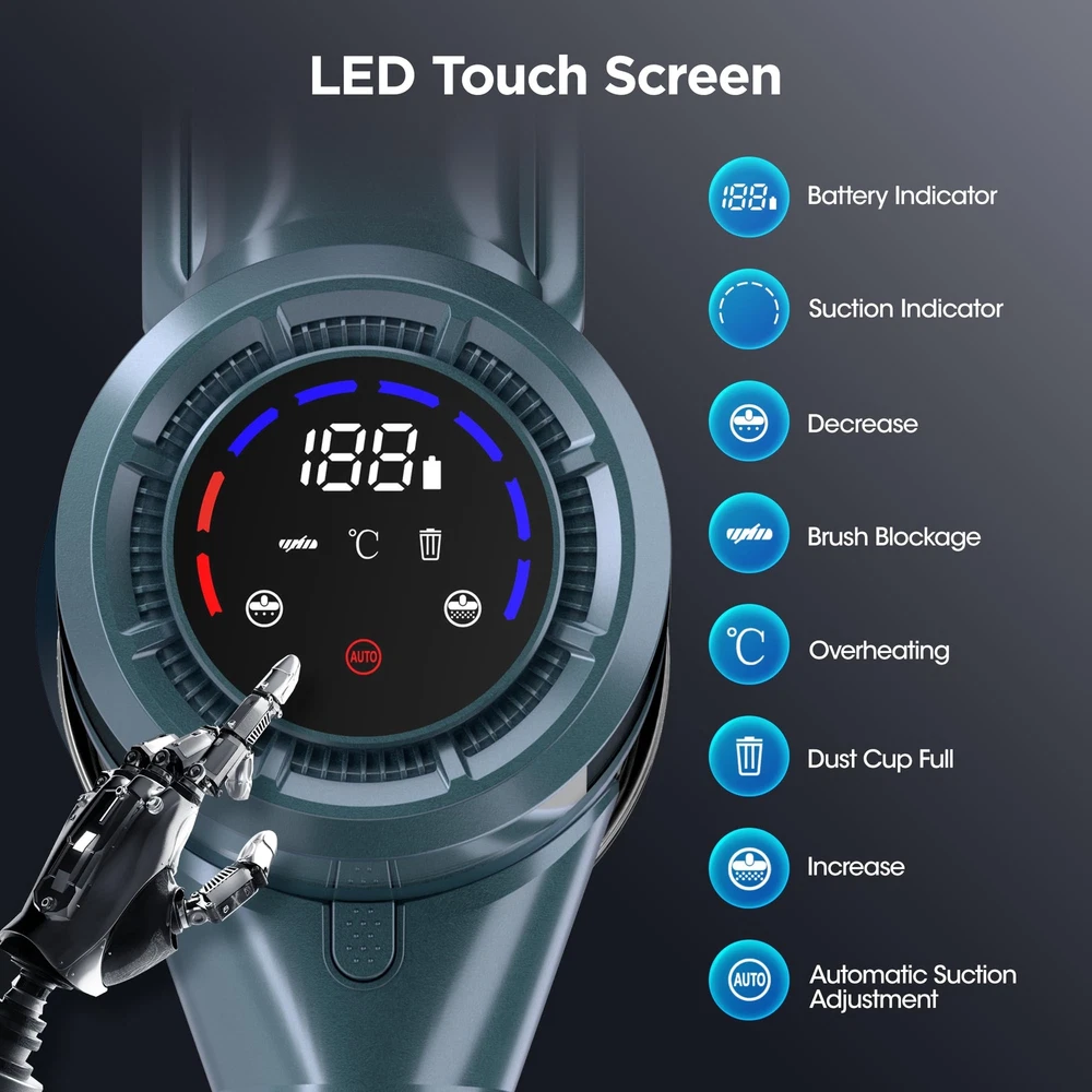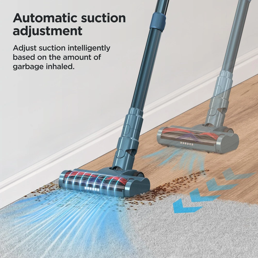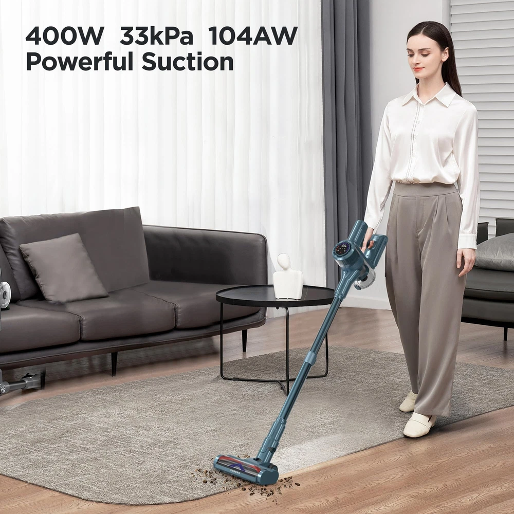 【Adaptive Suction Adjustment Technology】Cordless stick vacuum cleaner has a built-in smart sensor in the ventilation duct, which can sense the amount of dust and automatically adjust the suction power. Save yourself the trouble of adjusting the suction power and effectively save energy. 【Strong Suction Power】Cordless vacuum cleaner is equipped with a brushless motor with a power of 400W speed 107600rpm. The operating noise of the motor is less than 63 decibels. This motor can provide 33kPa vacuum and 104AW inhalation power, which can easily cope with various domestic garbage. 【Tangle-Free Floor Brush】Floor brush is equipped with a 25W 7500RPM high-speed motor, and the V-shaped bristles can effectively solve the problem of hair tangles and facilitate cleaning. Stick Vacuum is equipped with 6 LED lights. The cordless vacuum also supports 180 Degree horizontal rotation and 90 Degree vertical rotation. 【Color LED Touch Display】This cordless vacuum features a color LED touch screen that allows you to control the suction power and activate the adaptive suction adjustment function. It also includes indicators for battery level, suction strength, high temperature, full dust cup, and brush blockage. 【Efficient Air Duct Design】Stick vacuum adopts multi-channel separated air duct design, which can effectively solve the problems of HEPA clogging and suction attenuation in a single air duct, and can reduce the number of HEPA cleaning times, so that the HEPA can be cleaned once every 2 months. 【5-Level High-efficiency Filtration】The wireless vacuum cleaner for home adopts multiple air channels and a 5-level filtration system, which prevents clogging and improves battery life. It effectively captures 99.9 Percent of fine dust particles and releases fresh air. 【Warranty and After-sales Service】offers you 2-year free after-sales warranty program and 24-hour customer support. 's professional team is always ready to help you with any of your product maintenance needs, so please feel free to contact us.