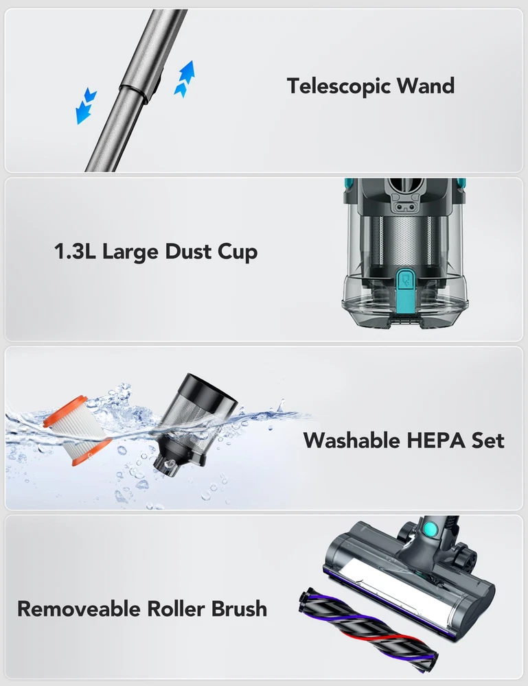 23Kpa Powerful Vacuum Cleaner: The cordless vacuum cleaner is designed to provide you with the ultimate convenience and efficiency in cleaning your home. With its 23KPa powerful suction, you can effectively remove dirt, dust, pet hair, and debris from various surfaces including hardwood floors, carpets, and upholstery Large Capacity for Longer Cleaning: Featuring a 1.3L capacity, the stick vacuum allows you to clean for longer periods without the need to frequently empty the dust canister. Say goodbye to interruptions during your cleaning sessions and enjoy uninterrupted cleaning power Versatile Cleaning Modes: The vacuum cleaners for home offers 2 modes - low power mode for light cleaning and high power mode for tackling tougher dirt and debris. Whether you need to quickly clean up everyday messes or tackle stubborn pet hair or dirt, this vacuum cordless has got you covered Extended Runtime for Complete Cleaning: With up to 30 minutes of runtime on a single charge, this cordless vacuum cleaner ensures that you can clean your entire home without any interruptions. No more running out of battery in the middle of your cleaning session, allowing you to complete your cleaning tasks efficiently Ideal for Pet Hair, Hardwood Floors, and Carpets: This rechargeable stick vacuum is specifically designed to tackle pet hair, hardwood floors, and carpets. Whether you have furry friends at home or multiple flooring types, this vacuum cleaner is an ideal choice. Experience hassle-free cleaning like never before with cordless vacuum cleaner