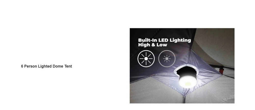 Get ready for an exciting camping adventure with the Core Equipment 6-Person Lighted Dome Tent. This spacious and durable tent is perfect for groups who want to stay comfortable and dry during their outdoor travels. The tent features a waterproof and lightweight design, making it easy to transport and set up. With a capacity of 6 people, this double skin tent is ideal for larger groups who want to stay protected from the elements. The tent's gray color and dome shape add a touch of elegance to your camping gear. The tent also comes with a carrying case, making it easy to transport to your next camping destination. Get ready for a comfortable and fun camping experience with the Core Equipment 6-Person Lighted Dome Tent. Features: Dimensions: 10 ft x 9 ft Sleeps 6 People Built-In LED Lighting Sleeps 6 or Fits 2 Queen Air Mattresses Specifications Brand: CORE Color: Gray Dimensions: W x L x H9 ft. x 10 ft. x 66 in. Model40223 Sleeping Capacity6 Person Tent Material Polyester Type Dome