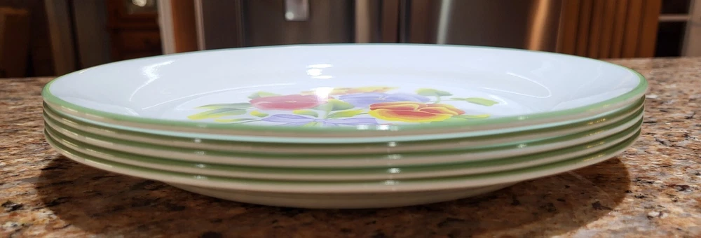 Elevate your dining experience with the timeless elegance of Corelle's Summer Blush luncheon plates. Each plate in this set of five showcases a delicate array of multicolor pastel florals and pansies, bringing a touch of nature's beauty to your table. Crafted from durable glass, these plates are not only decorative but also highly functional, designed to withstand the rigors of daily use. With a generous 9-inch diameter, they provide ample space for your favorite salads and lunch dishes. Their glossy finish and fused glass production style ensure a sleek, seamless appearance. These plates are stackable for easy storage, microwave and dishwasher safe, and can be gently machine washed at up to 140°F to maintain their charm. Whether for everyday use or special occasions, these Corelle plates are a testament to classic American craftsmanship. Excellent condition set of plates! Add them to your kitchen. Great for replacements, daily use or display!