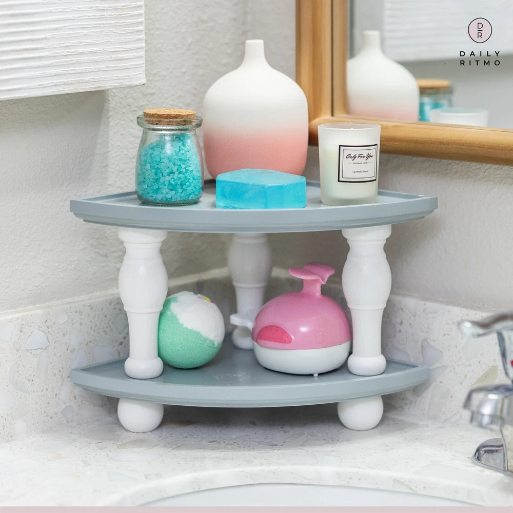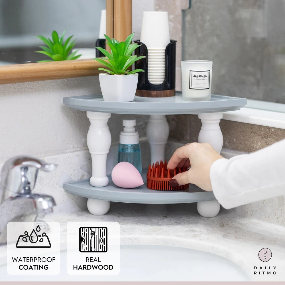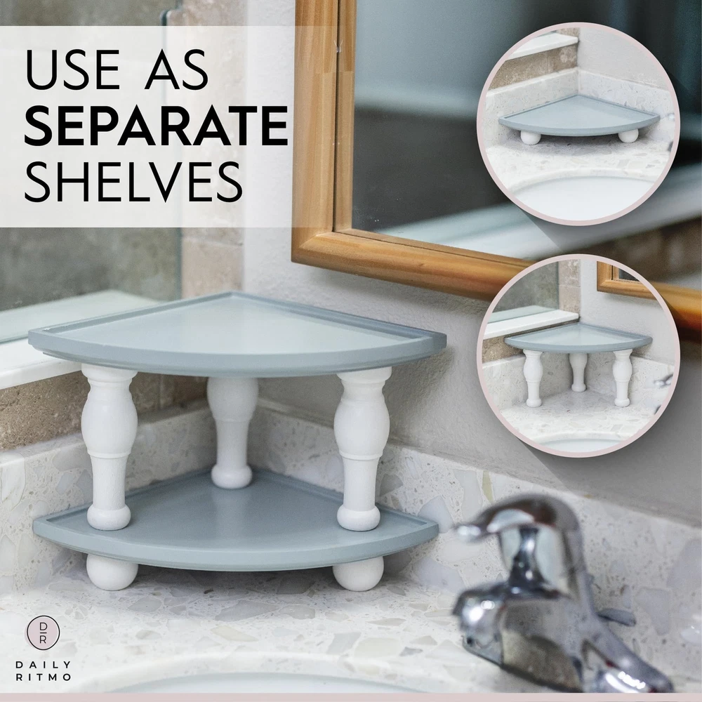✅ GREY WOOD CORNER SHELF 2PC SET: Perfect for organizing spice jars, toiletries & more, this home decorating bundle includes a pair of stackable corner shelves (one with 2" round feet, one with 5.5" brown spindle legs). ✅ MOSTLY PRE-ASSEMBLED; EASY DIY: Assembling the 8” deep shelving units couldn’t be easier. Since the wood shelves are already pre-assembled for the most part, all you’ll have to do is screw in the legs. Quick & easy DIY. The shelving set includes 2 top pieces, 1 set (3pc) of 2" ball legs and 1 set of 5" legs (3pc). ✅ CRAFTED OUT OF SOLID RUBBER WOOD: Both carved out of solid exotic rubber wood, these wooden bathroom counter shelves are strong, study, durable & easy to wipe clean. No frail, flimsy plastic. No metal accents to worry about rusting. ✅ MODERN FARMHOUSE CHIC FINISH: The top & bottom footed riser shelves in this kit have both been dressed up with a grey finish for an clean modern effect. Pair them with farmhouse décor, primitive décor, etc. ✅ ALL PURPOSE WOOD CORNER SHELVES: Each having a 15lb capacity, our stacking corner shelves can be used to organize & decoratively display skincare products, cooking spices, toiletries, coffee bar supplies & more.