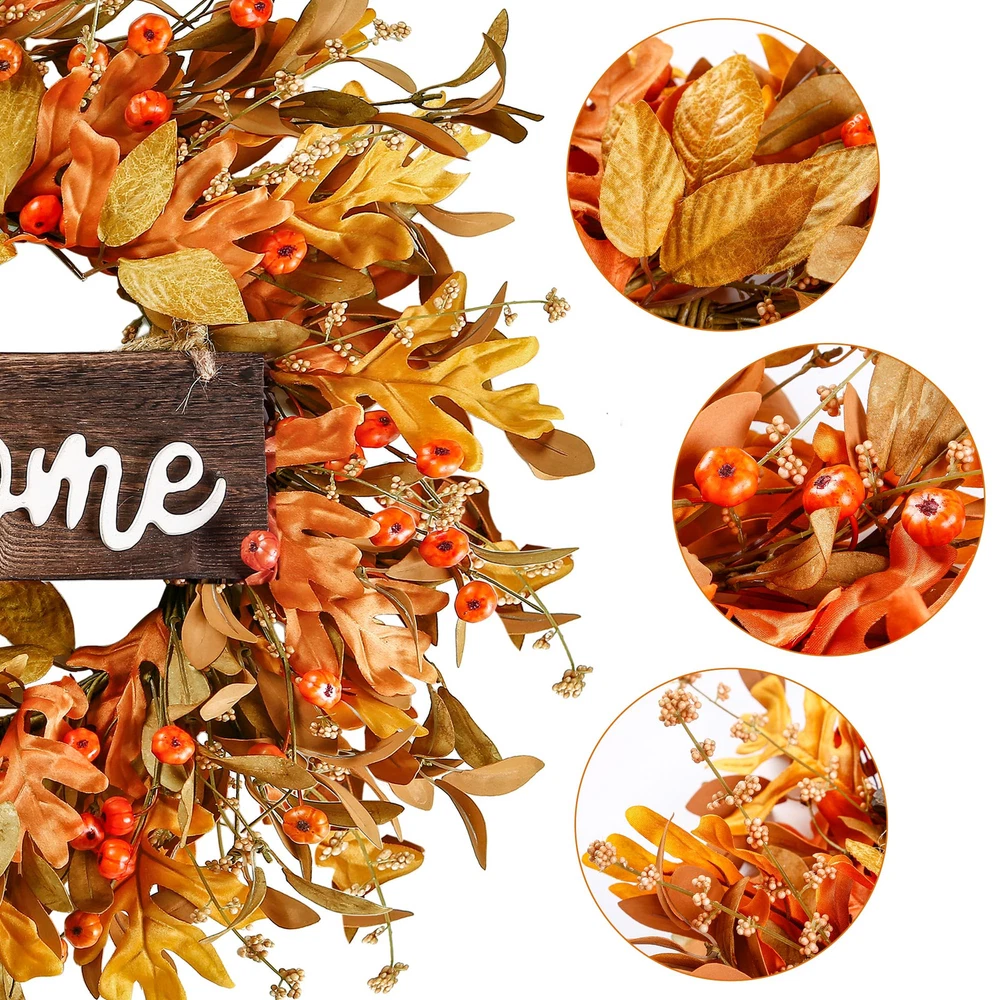 Product specification: Materials: foam and silk Size: Outer diameter: 18’’ Color: Orange Application:front door, wall, indoors,outdoors,window,fireplace,farmhouse, living room, porch, centerpiece party, wedding, holiday and autumn, Thanksgiving, fall festival celebration, etc. Features: This Harvest wreath has a longer compared to the real , the shape and color will stay fresh even a few years later, no need to water or sunlight. This autumn leaves wreath can be used as a gift for front door, wall, indoors,outdoors,window,fireplace,farmhouse, porch, wedding, holiday and autumn, Thanksgiving, fall festival,etc. This handmade fall wreath has special design, made of foam with purely manual process. The appearance of the wreath is very natural, just like the real . Warm Notice: The wreath looks so small, not as described. 1.The wreath may be squeezed during transportation. The size is actually measured after fluffing, they will reach the size as described. Please shape it according to our picture instruction before hanging. What if the leaves fall off? 2. Due to fully hand-made, it is normal if some small item or leaves fall off, it does not affect the overall image of the wreath. You can use the glue and manually stick the flower to the original place. Can it be used outdoors? 3.If used outdoors, please make sure to hang it under the cover to avoid rain and snow. Are the color exactly the same as the picture? 4.All of our picture are actually shoot, we try our best to revert the real color for customer. Due to the shooting light and screen display, slightly color differences may exist. Package Included: 1×Fall wreath in a box 1×Wooden welcome sign [HIGH QUALITY WREATH]: This artificial fall wreath is made of small size pumpkins,autumn leaves,cluster of berries full of rich texture. The entirely realistic wreath is vivid and vibrant. [PROPER SIZE]: 18 inches after fluffing. Since the wreath is packed in a relatively small box to satisfy transportation requirement, you need to expand the branches and adjust the leaves into best shape and you'll get a 18 inch full wreath of enough size. We provide you with 1 double sided sticky hook to help you hang on the door. [VERSATILE DECOR]:This autumn front door wreath is suitable for front door, wall, indoors,outdoors,window,fireplace,farmhouse, living room, porch, centerpiece party, wedding, holiday and autumn, Thanksgiving, fall festival celebration. It will provide your home a strong atmosphere, warm and elegant. [EASY CLEAN]: This Harvest wreath is convenient to clean, just wipe it with a try towel to make the wreath like brand new. The pumpkins and leaves are not easily falling apart. This wreath can be used for a long time. [NOTES]: If used outdoors, please make sure to hang it under the cover to avoid rain and snow. Please don’t hesitate to us if you have any questions, we will try our best to help you!