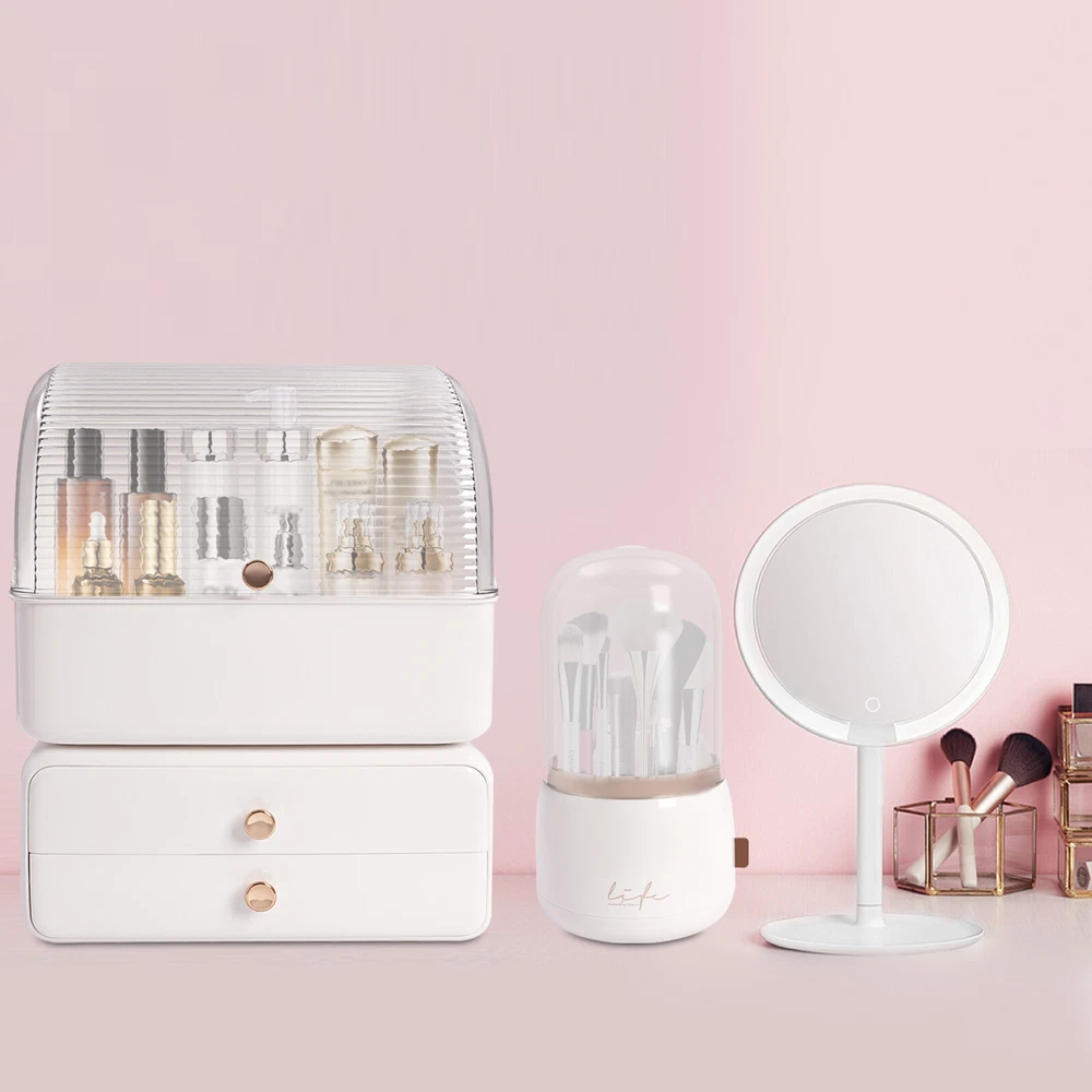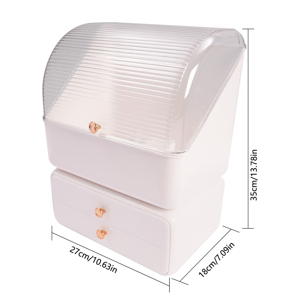 Cosmetic Storage Organizer Makeup Storage Box With Brush Holder Lid And Drawers Description The makeup organizer boasts ample space with its multi-compartment design, featuring a top compartment and 2 drawers, ensuring your cosmetics, skincare products, and jewelry are not only neatly arranged but also protected from dust. Complementing the set is a dedicated brush holder, with individual slots for each brush, it promotes quick drying after cleaning and easy selection during your daily routine, turning your morning prep into a breeze. Whether you're a professional makeup artist or a dedicated beauty enthusiast, this set will streamline your preparations and add a touch of sophistication to your vanity. Key Features Made to Last: The material of this makeup organizer is hard and durable plastic, which is environmentally friendly, non-toxic and odorless, and will not be easily deformed or damaged for long-term and safe use. Keep Tidy&Organized: It makes good use of the vertical space to store all kinds of cosmetics and skincare products neatly and it would be a great addition to your bedroom, bathroom, counter, dresser, and vanity to keep them a lot neater looking. Ample Storage Space: The 2 drawer can accommodate lipsticks, eyebrow pencils, face masks, and other items that can be placed flat. The top storage box can store most bottles on the market. Additionally, we also provide you with a rotatable makeup brush holder with 7 compartments to keep your makeup brushes standing upright, maintaining their shape and integrity and allowing for easy access. It can also be used as a pen holder to meet your diversified use needs. Thoughtful Helper: The makeup organizer features a thoughtful zoning design, so you can place products with different functions in the appropriate areas. The compartmentalized design not only makes full use of the space in the cosmetic case but also makes it easy to access. Considerate Design: The clear flip stays upright on its own to free your hands while the large opening of the box makes the retrieval and storage of cosmetics very convenient. It also adopts a dustproof cover and a closed drawer, which can effectively protect your cosmetics from water and dust. Wonderful Gift: The beautiful appearance and simple design make it a great gift. You can give it to your family members, colleagues, or friends to enhance their relationship with each other. Beautiful Appearance: The classic white color scheme with gold accessories highlights the product's unique image of luxury and vintage. Its simple and stylish appearance is generous, which is suitable for any decorative style of the room and is a good desktop decoration. Easy to Clean: Simple structure and smooth product surface make it easy to clean. You just need a dry/wet wipe to make it look new again. Installation-free : The makeup organizer you receive is already installed, you can get it and start using it right away. Details Pull-out Drawers: The bottom two drawers can be pulled out completely for easy access and cleaning. Exquisite Handle: The exquisite gold handle is not only a beautiful decoration but also makes the flip of the lid and the push and pull of the drawer more convenient. Non-slip Pads: They ensure the safety and stability of the cosmetic storage and display arrangement. Rounded Corners: The rounded corners can effectively avoid collisions and frictional injuries, thus providing you with a higher level of safety in use. Application It is suitable for use on the dressing table, bedroom, bathroom, bedside table, or living room to place your various cosmetics, such as water lotion, sunscreen, blocking cream, jewelry, lipstick, foundation, makeup brushes, eyeliners, eye shadow, nail polish, perfume, and other cosmetics. Specification Color: White Style: Modern Material: Plastic Process: Injection Molding Assembly Required: No Number of Pieces: 2 Mounting Type: Tabletop, Freestanding Gross Weight: 1.5kg/3.31lbs Net Weight: 1.3kg/2.87lbs Brush Holder Size (D*H): 13*24cm/5.12*9.45inch Cosmetic Case Size: 27*18*35cm/10.63*7.09*13.78inch Package Size: 35*26*18cm/13.78*10.24*7.09inch Package Included 1* Makeup Organizer 1* Brush Holder Notes Please pay attention to avoiding the makeup case from being scratched by sharp objects, or hit by heavy objects. Please avoid exposing it to the sun for a long time. Please allow the slight color difference caused by the shooting light and 1-3cm error due to manual measurement, and make sure you do not mind before ordering. Payment Delivery details Terms of sales About us Contact us Payment We accept ebay payment 。 Fees such as import duties, taxes are not included in the item price or shipping costs. These charges are the buyer's responsibility. Delivery details Shipping: 2-9 working days to: USA Terms of sales We maintain high standards of excellence and strive for hundred percent customer satisfaction. Feedback is very important to us. We hope that you contact us immediately before you give neutral or negative feedback, so that we can address your concerns. It is impossible to address issues if we do not know about them! About us Your satis faction is our ultimate goal. We work hard to earn your trust and future business. Our certified technicians have tested each item before shipping. The unit comes with 1 year limited warranty on all manufacturing defects. a) If you receive a defective item, you may return it or ask for a discount. Please contact us within 14 days after you receive the package. b) What you returned must be intact and in its original packaging as re? u. Customer is responsible for shipping costs of the returned item. c) We will cover the cost of shipping back t with the shipping rate indicated in the registration page. We will send you a new unit or refund the full payment you paid. Thank you. Contact us Business Hour Business Hour: Monday To Friday: 8:30 AM to 5:00 PM (Beijing China time) Due to time zones, our reply to your questions may not be immed