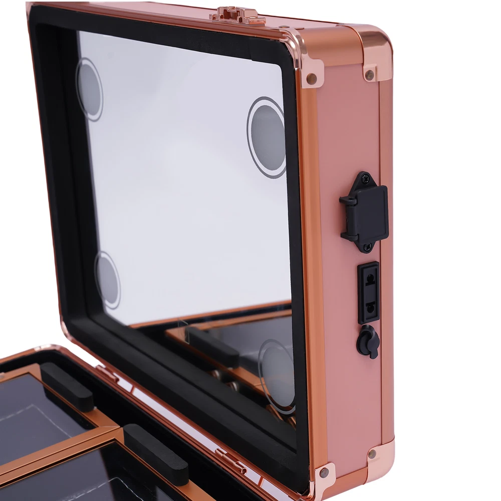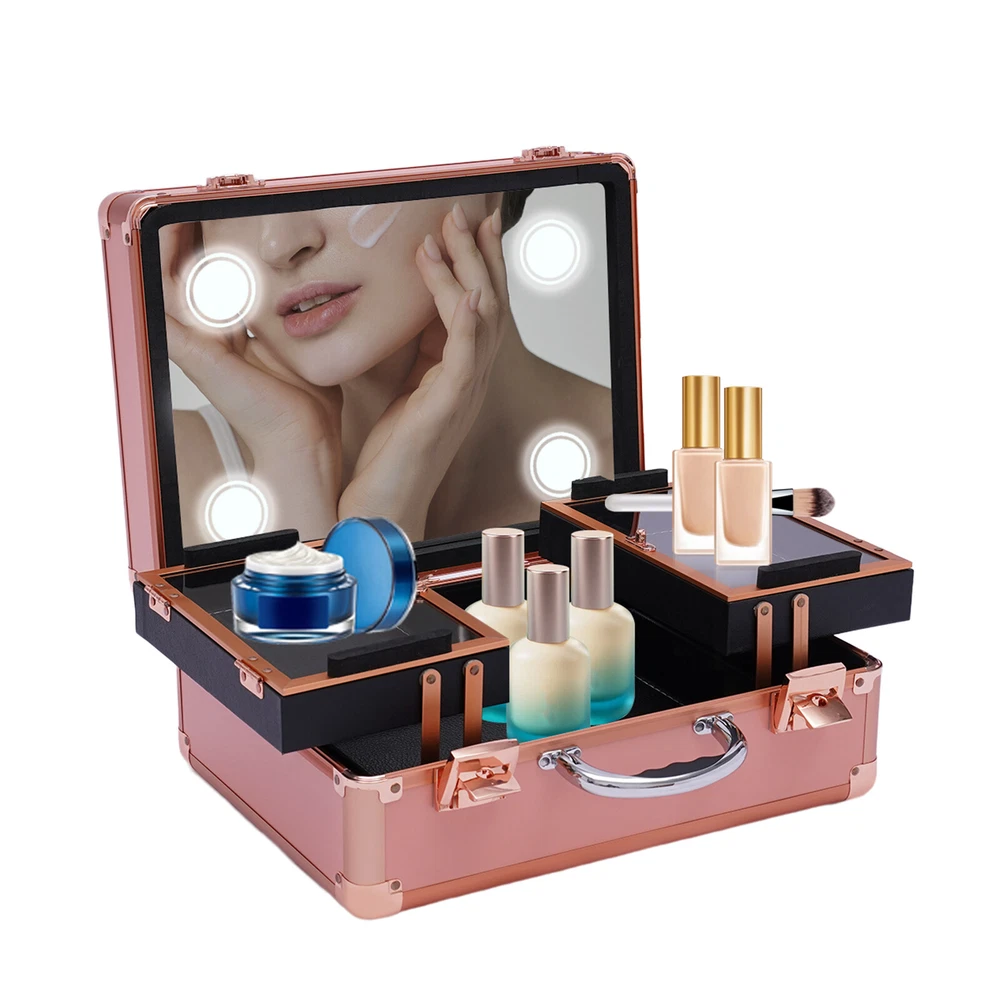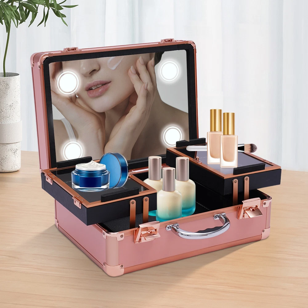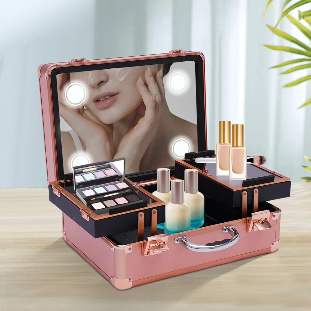 Specification Main Material: ABS Color: Rose Gold Plug Type: US Light Source: LED Light Color: Cold White, Warm White and Natural Light Voltage: 110-240v, 50-60Hz Power Cord Length: 1.8m/5.91ft Package Size: 40*21*35cm/15.75*8.27*13.78in Top Cover Mirror Size: 37*28*6.5cm/14.6*11*2.6in Bottom Tray Size: 37*28*9.5cm/14.6*11*3.7in Overall Case Size: 37*28*16cm/14.6*11*6.3in Center Tray Size: 15*22*4cm/5.9*8.7*1.6in Gross Weight: 4kg/8.82lbs Net Weight: 3kg/6.61lbs Package Included 1*Makeup Train Case 1* Power Cord Cosmetic Storing Organizer Box Makeup Cosmetic Storage Makeup Case w/Mirror Description Whether traveling or on business, we all want to show our most sophisticated appearance. But we are always annoyed because the cosmetics are too fragmented and not well stored. Therefore, we have customized this makeup train case for you. It comes with 4 dimmable LED lights and a mirror, making it a self-contained portable vanity. Many features such as compartmentalized storage and sophisticated appearance make it stand out. Key Features Large Capacity Zoned Storage: It has two layers. The upper layer consists of 2 separate trays of 5.9*8.7*1.6inch for your usual lipsticks, brushes, blushes, etc. The lower layer is a 14.6*11*3.7in a one-piece tray that provides more space for your nail polish, essential oils, foundation, etc, so you can say goodbye to a cluttered desktop. Elegant Look: It is made in rose gold style with all the components matching that color and keeping in line with the specially made handles for an impressive look. Makeup Assistant: It comes with 4 LED lights designed in the corners of the lid and a top mirror. The LED lights can adjust the light color between cold white, warm white and natural light, and the brightness of the makeup lights can be adjusted by touching the screen, allowing you to apply makeup anytime and anywhere. Security Protection: It comes with 2 locks to protect privacy and security during travel. Therefore, it is also suitable for holding watches, bracelets and some other valuables. Considerate Design: This make-up case comes with a 12V rechargeable jack, an external power supply jack, and a power jack. And the power cord can be used for an external curling iron, mobile phone, and hairdryer power when it is powered up to meet your needs while working. High Quality: It is made of high-quality ABS material, which is sturdy and durable, and the metal reinforced corners have good wear resistance. It can be used for many years. Easy to Clean: ABS stain-proof plastic is easy to clean. If the tray gets dirty with cosmetics, just wipe it with a damp cloth and it will be as good as new. Humanized Design: In addition to the makeup fire compartment itself which is closed, the two separate trays on the upper level also have their separate lids, which can effectively prevent dust and stains on your cosmetics. Ideal Gift: This elegant makeup train case is what every girl needs, so it is a great gift for girls. Portable: It is designed as a mini suitcase with dimensions of 5.9*8.7*1.6in and weighs only 6.61lbs. The curved grip makes it easy to hold and carry on your journey. Details Enhanced Corners: Durable aluminum material for long-term use can hold all your daily cosmetics and tools and keep their shape. Glass Lids: The two separate trays on the upper level feature clear glass lids, making it easy for you to be able to find your cosmetics at a glance. 5.91ft Power Cord: It comes with a 5.91ft power cord, allowing you to have plenty of length at your disposal. Therefore, it is more convenient for you to use it. Application This product is suitable for storing cosmetics and skin care products, as well as jewelry, such as necklaces and earrings. Besides, it also can be used in dark places for makeup. Specification Main Material: ABS Color: Rose Gold Plug Type: US Light Source: LED Light Color: Cold White, Warm White and Natural Light Voltage: 110-240v, 50-60Hz Power Cord Length: 1.8m/5.91ft Package Size: 40*21*35cm/15.75*8.27*13.78in Top Cover Mirror Size: 37*28*6.5cm/14.6*11*2.6in Bottom Tray Size: 37*28*9.5cm/14.6*11*3.7in Overall Case Size: 37*28*16cm/14.6*11*6.3in Center Tray Size: 15*22*4cm/5.9*8.7*1.6in Gross Weight: 4kg/8.82lbs Net Weight: 3kg/6.61lbs Package Included 1*Makeup Train Case 1* Power Cord Notes Please allow the slight color difference caused by the shooting light and 1-3cm error due to manual measurement, and make sure you do not mind before you order. Payment Delivery details Terms of sales About us Contact us Payment We accept ebay payment 。 Fees such as import duties, taxes are not included in the item price or shipping costs. These charges are the buyer's responsibility. Delivery details Shipping: 2-9 working days to: USA Terms of sales We maintain high standards of excellence and strive for hundred percent customer satisfaction. Feedback is very important to us. We hope that you contact us immediately before you give neutral or negative feedback, so that we can address your concerns. It is impossible to address issues if we do not know about them! About us Your satis faction is our ultimate goal. We work hard to earn your trust and future business. Our certified technicians have tested each item before shipping. The unit comes with 1 year limited warranty on all manufacturing defects. a) If you receive a defective item, you may return it or ask for a discount. Please contact us within 14 days after you receive the package. b) What you returned must be intact and in its original packaging as re? u. Customer is responsible for shipping costs of the returned item. c) We will cover the cost of shipping back t with the shipping rate indicated in the registration page. We will send you a new unit or refund the full payment you paid. Thank you. Contact us Business Hour Business Hour: Monday To Friday: 8:30 AM to 5:00 PM (Beijing China time) Due to time zones, our reply to your questions may not be immediately. But within above working time, we will