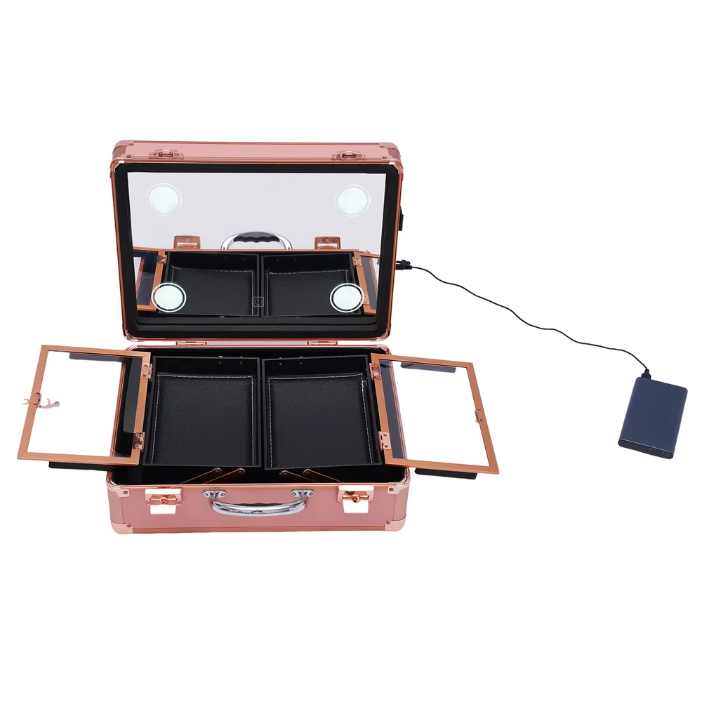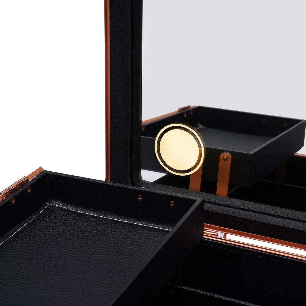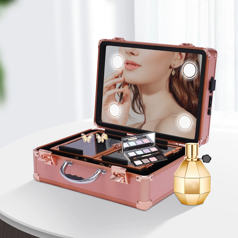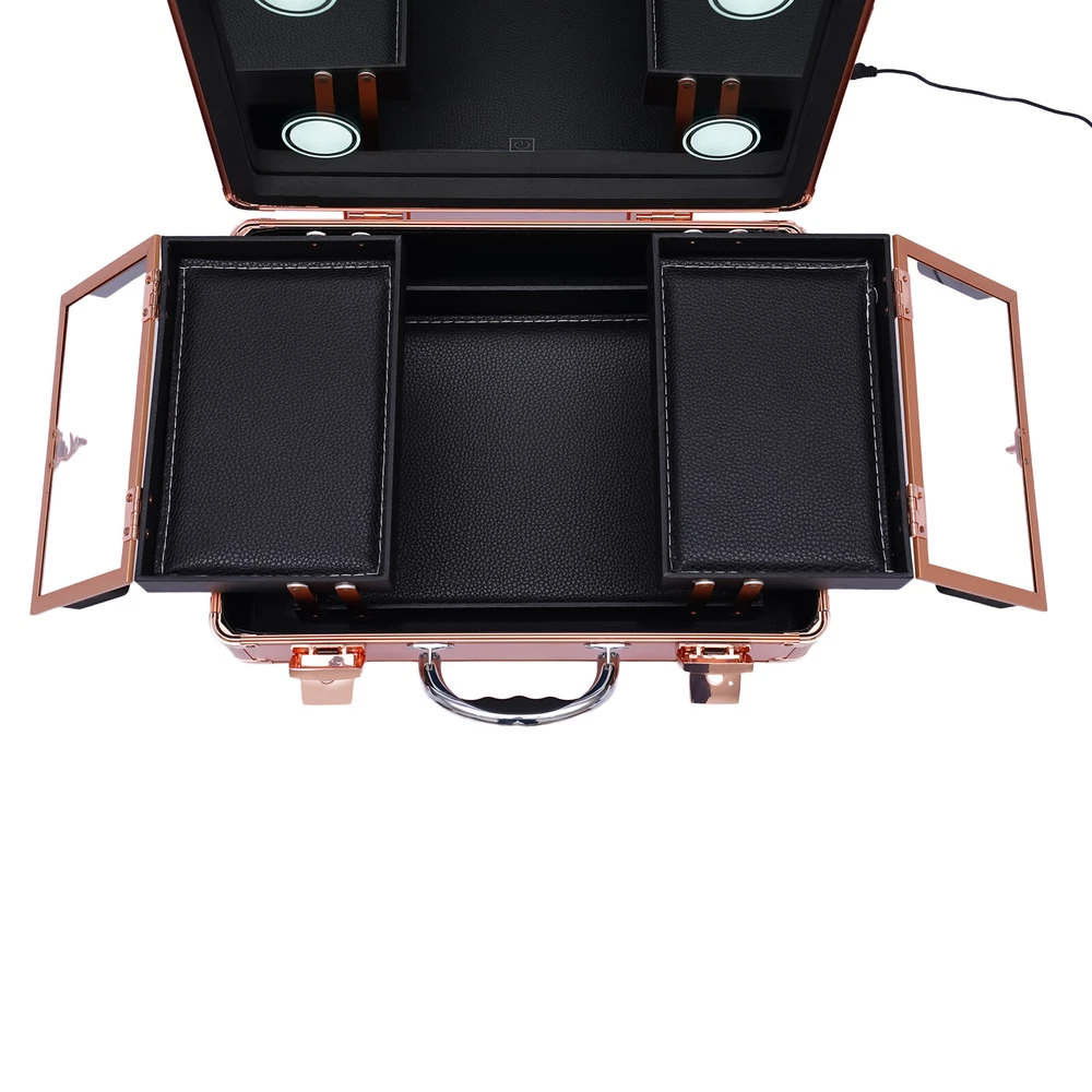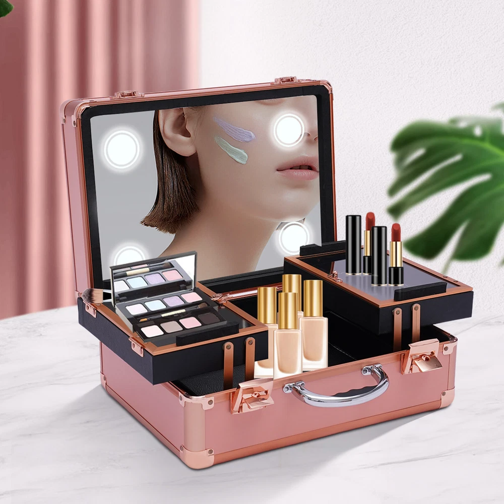 Specification Main Material: ABS Color: Rose Gold Plug Type: US Light Source: LED Light Color: Cold White, Warm White and Natural Light Voltage: 110-240v, 50-60Hz Power Cord Length: 1.8m/5.91ft Package Size: 40*21*35cm/15.75*8.27*13.78in Top Cover Mirror Size: 37*28*6.5cm/14.6*11*2.6in Bottom Tray Size: 37*28*9.5cm/14.6*11*3.7in Overall Case Size: 37*28*16cm/14.6*11*6.3in Center Tray Size: 15*22*4cm/5.9*8.7*1.6in Gross Weight: 4kg/8.82lbs Net Weight: 3kg/6.61lbs Package Included 1*Makeup Train Case 1* Power Cord Cosmetic Storing Organizer Box Makeup Cosmetic Storage Makeup Case w/Mirror Description Whether traveling or on business, we all want to show our most sophisticated appearance. But we are always annoyed because the cosmetics are too fragmented and not well stored. Therefore, we have customized this makeup train case for you. It comes with 4 dimmable LED lights and a mirror, making it a self-contained portable vanity. Many features such as compartmentalized storage and sophisticated appearance make it stand out. Key Features Large Capacity Zoned Storage: It has two layers. The upper layer consists of 2 separate trays of 5.9*8.7*1.6inch for your usual lipsticks, brushes, blushes, etc. The lower layer is a 14.6*11*3.7in a one-piece tray that provides more space for your nail polish, essential oils, foundation, etc, so you can say goodbye to a cluttered desktop. Elegant Look: It is made in rose gold style with all the components matching that color and keeping in line with the specially made handles for an impressive look. Makeup Assistant: It comes with 4 LED lights designed in the corners of the lid and a top mirror. The LED lights can adjust the light color between cold white, warm white and natural light, and the brightness of the makeup lights can be adjusted by touching the screen, allowing you to apply makeup anytime and anywhere. Security Protection: It comes with 2 locks to protect privacy and security during travel. Therefore, it is also suitable for holding watches, bracelets and some other valuables. Considerate Design: This make-up case comes with a 12V rechargeable jack, an external power supply jack, and a power jack. And the power cord can be used for an external curling iron, mobile phone, and hairdryer power when it is powered up to meet your needs while working. High Quality: It is made of high-quality ABS material, which is sturdy and durable, and the metal reinforced corners have good wear resistance. It can be used for many years. Easy to Clean: ABS stain-proof plastic is easy to clean. If the tray gets dirty with cosmetics, just wipe it with a damp cloth and it will be as good as new. Humanized Design: In addition to the makeup fire compartment itself which is closed, the two separate trays on the upper level also have their separate lids, which can effectively prevent dust and stains on your cosmetics. Ideal Gift: This elegant makeup train case is what every girl needs, so it is a great gift for girls. Portable: It is designed as a mini suitcase with dimensions of 5.9*8.7*1.6in and weighs only 6.61lbs. The curved grip makes it easy to hold and carry on your journey. Details Enhanced Corners: Durable aluminum material for long-term use can hold all your daily cosmetics and tools and keep their shape. Glass Lids: The two separate trays on the upper level feature clear glass lids, making it easy for you to be able to find your cosmetics at a glance. 5.91ft Power Cord: It comes with a 5.91ft power cord, allowing you to have plenty of length at your disposal. Therefore, it is more convenient for you to use it. Application This product is suitable for storing cosmetics and skin care products, as well as jewelry, such as necklaces and earrings. Besides, it also can be used in dark places for makeup. Specification Main Material: ABS Color: Rose Gold Plug Type: US Light Source: LED Light Color: Cold White, Warm White and Natural Light Voltage: 110-240v, 50-60Hz Power Cord Length: 1.8m/5.91ft Package Size: 40*21*35cm/15.75*8.27*13.78in Top Cover Mirror Size: 37*28*6.5cm/14.6*11*2.6in Bottom Tray Size: 37*28*9.5cm/14.6*11*3.7in Overall Case Size: 37*28*16cm/14.6*11*6.3in Center Tray Size: 15*22*4cm/5.9*8.7*1.6in Gross Weight: 4kg/8.82lbs Net Weight: 3kg/6.61lbs Package Included 1*Makeup Train Case 1* Power Cord Notes Please allow the slight color difference caused by the shooting light and 1-3cm error due to manual measurement, and make sure you do not mind before you order. Payment Delivery details Terms of sales About us Contact us Payment We accept ebay payment 。 Fees such as import duties, taxes are not included in the item price or shipping costs. These charges are the buyer's responsibility. Delivery details Shipping: 2-9 working days to: USA Terms of sales We maintain high standards of excellence and strive for hundred percent customer satisfaction. Feedback is very important to us. We hope that you contact us immediately before you give neutral or negative feedback, so that we can address your concerns. It is impossible to address issues if we do not know about them! About us Your satis faction is our ultimate goal. We work hard to earn your trust and future business. Our certified technicians have tested each item before shipping. The unit comes with 1 year limited warranty on all manufacturing defects. a) If you receive a defective item, you may return it or ask for a discount. Please contact us within 14 days after you receive the package. b) What you returned must be intact and in its original packaging as re? u. Customer is responsible for shipping costs of the returned item. c) We will cover the cost of shipping back t with the shipping rate indicated in the registration page. We will send you a new unit or refund the full payment you paid. Thank you. Contact us Business Hour Business Hour: Monday To Friday: 8:30 AM to 5:00 PM (Beijing China time) Due to time zones, our reply to your questions may not be immediately. But within above working time, we will