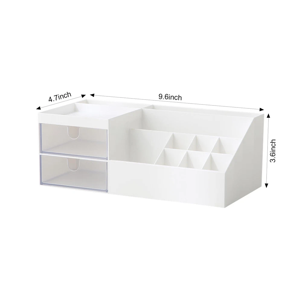 Material: Makeup organizer is made of ABS plastic. Easily Find What You Need: Makeup Organizer with 10 Compartments and 2 Transparent Drawers. Size: 9.6*4.7*3.6 inches. Versatile Design: This Desktop storage is not only perfect for storing your makeup brushes, nail polishes, Liquid Foundation, lipsticks and other small personal items but also great for storing your desktop stationery such as paper clips, pencil, scissors, binder clips and many other office supplies; you can put any other daily necessities on the Desktop storage. Widely Used: Fits Bedroom Countertop Bathroom and office, especially the makeup table.
