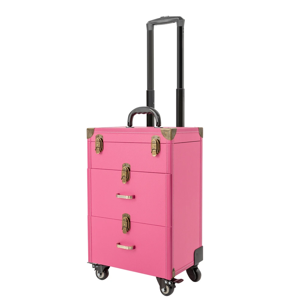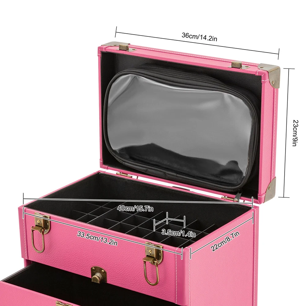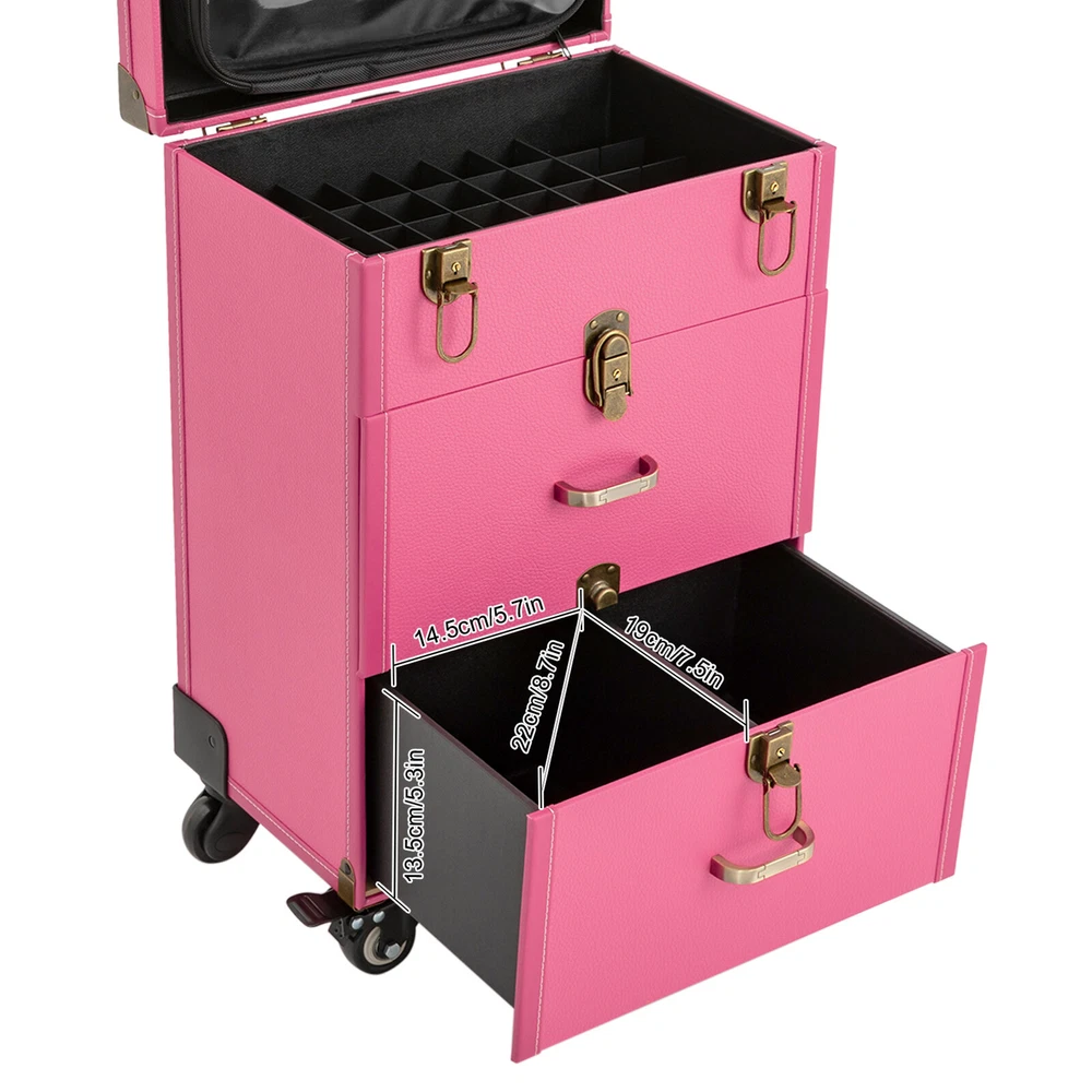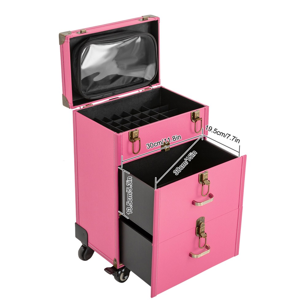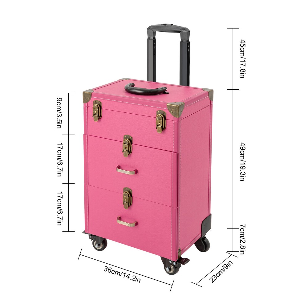 Cosmetics Rolling Cases Travel Makeup Rolling Organizer Nail Polish Storage Box Makeup Train Case, Rolling Makeup Trolley Case, Nail Polish Organizer, Jewelry Travel Cosmetic Train Case w/ 4 Wheels, Rose Description If you are troubled by storing all your hairdressing tools in order and finding them easily, our makeup train case can be of great help to you. Featuring high durability, attractive appearance, large capacity, universal wheels, humanized handles, a telescopic rod, and more, this product is easy to carry outside while keeping practical and beautiful. It is an ideal choice for young manicurists, make-up artists, and hairdressers/cosmetics lovers to store various cosmetics. Application It is good for manicurists, makeup artists, both beginner and professional, freelance makeup artists, wedding makeup artists, celebrity makeup artist, and cosmetic trainees. Specification Target Audience: Unisex Adult Caster Type: Swivel Mounting Type: Free Standing Material: PU, PVC, Zinc Alloy, Aluminum Alloy Color: Rose Shape: Rectangular Number of Tiers: 3 Number of Wheels: 4 Max. Load-bearing Capacity: 40kg/88.2lbs Number of Keys: 2 Lid Size: 36*23cm/14.2*9inch Wheel Height: 7cm/2.8inch Telescopic Rod Length (Min.): 38cm/14.9inch Telescopic Rod Length (Max.): 86cm/33.8inch Second Tier Inside Size: 30*19.5*13.5cm/11.8*7.7*5.3inch Each Compartment of Top Tier Size(L*W): 3.5*3.5cm/1.4*1.4inch Each Compartment of Third Tier Size: 14.5*19*13.5cm/5.7*7.5*5.3inch Top Tier Height: 9cm/3.5inch Second&Third Tier Height: 17cm/6.7inch Overall Case Body Size: 36*23*49cm/14.2*9*19.3inch Overall Product Size: 36*23*101cm/14.2*9*39.76inch Package Size: 63*32*41cm/ 24.8*12.6*16.14inch Gross Weight: 10kg/22.04 lbs Product Weight: 9kg/19.84 lbs Key Features Beautiful Appearance: Elegant Rose color combined with a rectangular frame, smooth lines, and delicate lychee texture gives this product a stylish and beautiful look. High-quality bronze hardware and exquisite stitching also add to its appearance. Durable and Sturdy: This product is constructed with premium PU, PVC, and reinforced corners, aluminum alloy rod, zinc alloy-wrapped edge , which is waterproof, wear-resistant , and has a long service life. Categorized Storage : The 3-tier and compartment designs, cubicles, and a large clear pocket on the lid give this case a large capacity to hold your daily cosmetics and makeup tools in a categorized way, allowing you to quickly find what you want. And the dividers are removable for organizing different sized bottles. Easy to Move&Carry: 4 universal wheels (2 of which are lockable) ensure that the case can be moved smoothly and silently in all directions and allow for safe fixation to handle different road conditions. The telescopic handle and top handle give it high portability. Easy to Clean: The lid and drawer designs can prevent dust from entering, along with the waterproof surface, making it easy to clean. You just need to wipe off the dirt with a wet cloth. High Safety: The 4 latch locks and waterproof surface provide maximum protection and security for your toiletries, giving you peace of mind while traveling. Excellent Load-bearing Capacity: The sturdy construction and the zinc alloy frame provide the product with an excellent weight-bearing capacity of 88.2 lbs. You can place all kinds of hairdressing and beauty tools in it with confidence. Protective Packaging: To prevent the product from being damaged and bumped during transportation, we pack it with pearl cotton for maximum protection of your products. After-sales Service : We aim to provide quality products and services. If you have any problems, please feel free to contact us, and we will reply and solv e the problem for you as soon as possible. Details Back Buckles: The back of the luggage has two hardware eight-nail back buckles to make the case more stable and to ensure that it remains as good as new when repeatedly opened and closed. User-friendly Drawer Handle: The 2 comfortable drawer handles of the second and third tiers allow for convenient closing/opening of the drawers, thus ensuring easy access to the inside items. Structure Overview The inside of the lid has a makeup bag where you can keep the things you use regularly for quick and easy access. The first tier can be used for nail varnish or other small items. The second tier is suitable for larger items such as hair dryers, curling wands, nail art machines, and more. The third tier has two compartments for medium items, such as cosmetics, hairspray spray. Package Included 1*Makeup Train Case 2*Keys Notes Please note that cosmetics or makeup tools are not included. This product is a carry case only. This product includes two keys. Please allow the slight color difference caused by the shooting light and 1-3 cm error due to manual measurement, and make sure you do not mind before ordering. Key Features Beautiful Appearance: Elegant rose color combined with a rectangular frame, smooth lines, and delicate lychee texture gives this product a stylish and beautiful look. High-quality bronze hardware and exquisite stitching also add to its appearance. Durable and Sturdy: This product is constructed with premium PU, PVC, and reinforced corners, aluminum alloy rod, zinc alloy-wrapped edge , which is waterproof, wear-resistant , and has a long service life. Categorized Storage : The 3-tier and compartment designs, cubicles, and a large clear pocket on the lid give this case a large capacity to hold your daily cosmetics and makeup tools in a categorized way, allowing you to quickly find what you want. And the dividers are removable for organizing different sized bottles. Easy to Move&Carry: 4 universal wheels (2 of which are lockable) ensure that the case can be moved smoothly and silently in all directions and allow for safe fixation to handle different road conditions. The telescopic handle and top handle give it high portability. Easy to Clean: The lid and drawer designs can prevent dust from ent