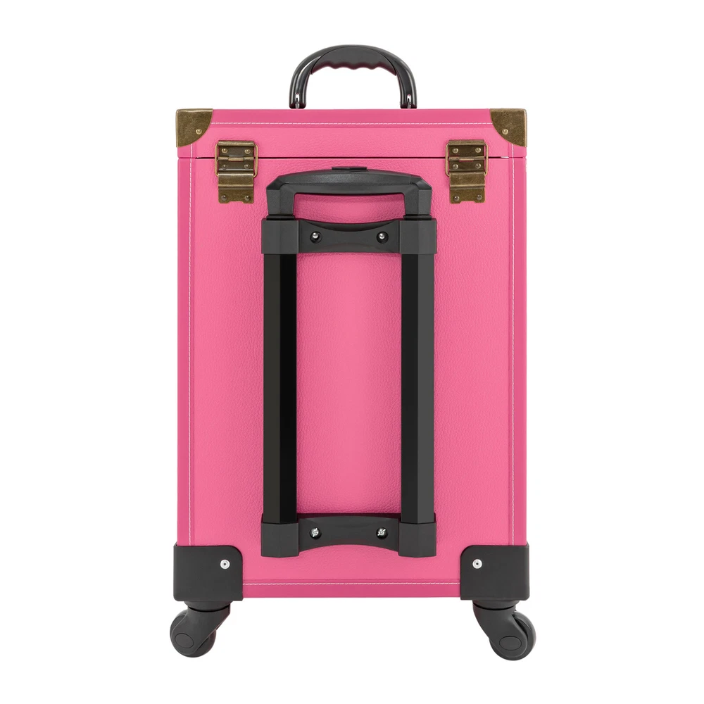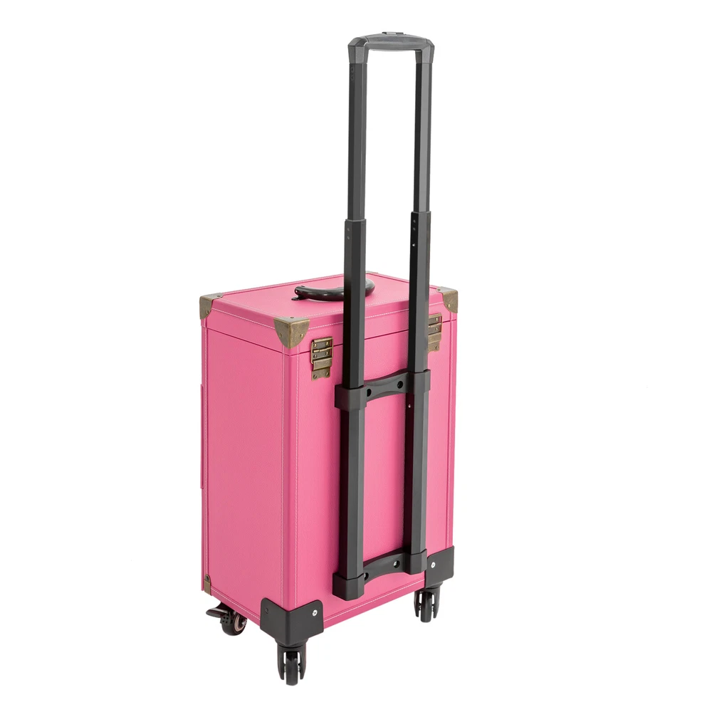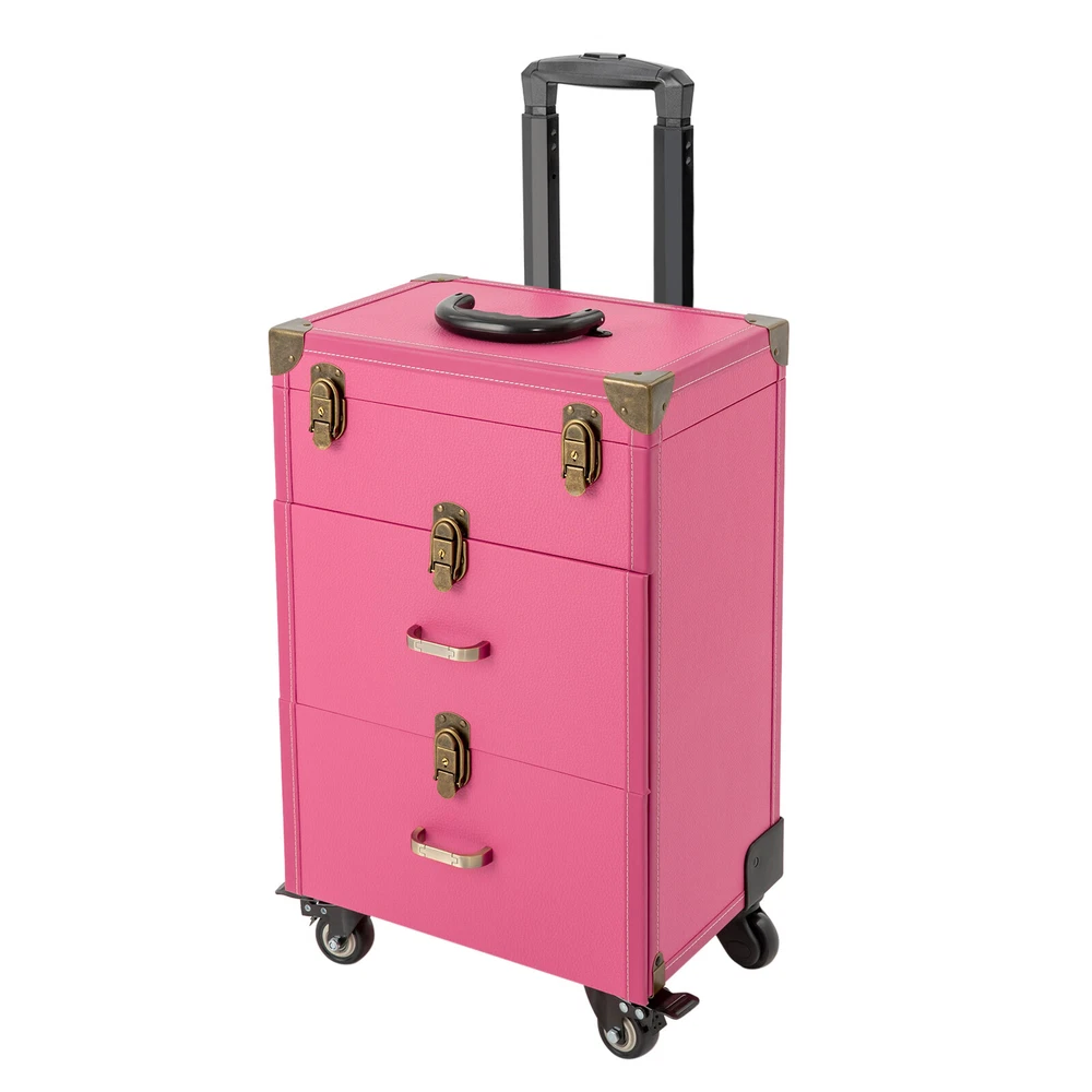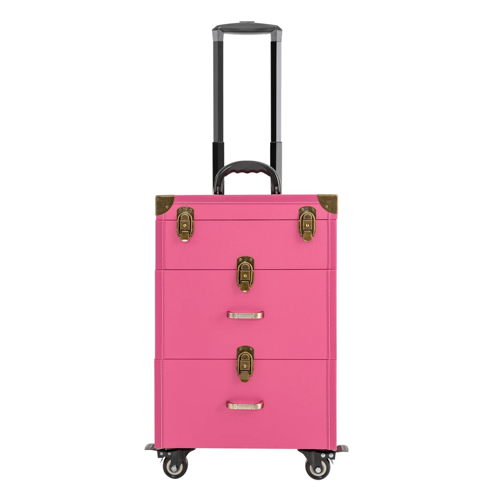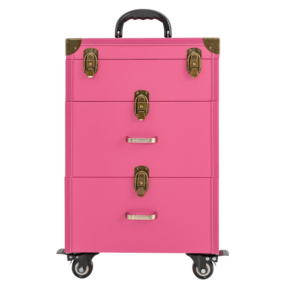 Cosmetics Rolling Cases Travel Makeup Rolling Organizer Nail Polish Storage Box Makeup Train Case, Rolling Makeup Trolley Case, Nail Polish Organizer, Jewelry Travel Cosmetic Train Case w/ 4 Wheels, Rose Description If you are troubled by storing all your hairdressing tools in order and finding them easily, our makeup train case can be of great help to you. Featuring high durability, attractive appearance, large capacity, universal wheels, humanized handles, a telescopic rod, and more, this product is easy to carry outside while keeping practical and beautiful. It is an ideal choice for young manicurists, make-up artists, and hairdressers/cosmetics lovers to store various cosmetics. Application It is good for manicurists, makeup artists, both beginner and professional, freelance makeup artists, wedding makeup artists, celebrity makeup artist, and cosmetic trainees. Specification Target Audience: Unisex Adult Caster Type: Swivel Mounting Type: Free Standing Material: PU, PVC, Zinc Alloy, Aluminum Alloy Color: Rose Shape: Rectangular Number of Tiers: 3 Number of Wheels: 4 Max. Load-bearing Capacity: 40kg/88.2lbs Number of Keys: 2 Lid Size: 36*23cm/14.2*9inch Wheel Height: 7cm/2.8inch Telescopic Rod Length (Min.): 38cm/14.9inch Telescopic Rod Length (Max.): 86cm/33.8inch Second Tier Inside Size: 30*19.5*13.5cm/11.8*7.7*5.3inch Each Compartment of Top Tier Size(L*W): 3.5*3.5cm/1.4*1.4inch Each Compartment of Third Tier Size: 14.5*19*13.5cm/5.7*7.5*5.3inch Top Tier Height: 9cm/3.5inch Second&Third Tier Height: 17cm/6.7inch Overall Case Body Size: 36*23*49cm/14.2*9*19.3inch Overall Product Size: 36*23*101cm/14.2*9*39.76inch Package Size: 63*32*41cm/ 24.8*12.6*16.14inch Gross Weight: 10kg/22.04 lbs Product Weight: 9kg/19.84 lbs Key Features Beautiful Appearance: Elegant Rose color combined with a rectangular frame, smooth lines, and delicate lychee texture gives this product a stylish and beautiful look. High-quality bronze hardware and exquisite stitching also add to its appearance. Durable and Sturdy: This product is constructed with premium PU, PVC, and reinforced corners, aluminum alloy rod, zinc alloy-wrapped edge , which is waterproof, wear-resistant , and has a long service life. Categorized Storage : The 3-tier and compartment designs, cubicles, and a large clear pocket on the lid give this case a large capacity to hold your daily cosmetics and makeup tools in a categorized way, allowing you to quickly find what you want. And the dividers are removable for organizing different sized bottles. Easy to Move&Carry: 4 universal wheels (2 of which are lockable) ensure that the case can be moved smoothly and silently in all directions and allow for safe fixation to handle different road conditions. The telescopic handle and top handle give it high portability. Easy to Clean: The lid and drawer designs can prevent dust from entering, along with the waterproof surface, making it easy to clean. You just need to wipe off the dirt with a wet cloth. High Safety: The 4 latch locks and waterproof surface provide maximum protection and security for your toiletries, giving you peace of mind while traveling. Excellent Load-bearing Capacity: The sturdy construction and the zinc alloy frame provide the product with an excellent weight-bearing capacity of 88.2 lbs. You can place all kinds of hairdressing and beauty tools in it with confidence. Protective Packaging: To prevent the product from being damaged and bumped during transportation, we pack it with pearl cotton for maximum protection of your products. After-sales Service : We aim to provide quality products and services. If you have any problems, please feel free to contact us, and we will reply and solv e the problem for you as soon as possible. Details Back Buckles: The back of the luggage has two hardware eight-nail back buckles to make the case more stable and to ensure that it remains as good as new when repeatedly opened and closed. User-friendly Drawer Handle: The 2 comfortable drawer handles of the second and third tiers allow for convenient closing/opening of the drawers, thus ensuring easy access to the inside items. Structure Overview The inside of the lid has a makeup bag where you can keep the things you use regularly for quick and easy access. The first tier can be used for nail varnish or other small items. The second tier is suitable for larger items such as hair dryers, curling wands, nail art machines, and more. The third tier has two compartments for medium items, such as cosmetics, hairspray spray. Package Included 1*Makeup Train Case 2*Keys Notes Please note that cosmetics or makeup tools are not included. This product is a carry case only. This product includes two keys. Please allow the slight color difference caused by the shooting light and 1-3 cm error due to manual measurement, and make sure you do not mind before ordering. Key Features Beautiful Appearance: Elegant rose color combined with a rectangular frame, smooth lines, and delicate lychee texture gives this product a stylish and beautiful look. High-quality bronze hardware and exquisite stitching also add to its appearance. Durable and Sturdy: This product is constructed with premium PU, PVC, and reinforced corners, aluminum alloy rod, zinc alloy-wrapped edge , which is waterproof, wear-resistant , and has a long service life. Categorized Storage : The 3-tier and compartment designs, cubicles, and a large clear pocket on the lid give this case a large capacity to hold your daily cosmetics and makeup tools in a categorized way, allowing you to quickly find what you want. And the dividers are removable for organizing different sized bottles. Easy to Move&Carry: 4 universal wheels (2 of which are lockable) ensure that the case can be moved smoothly and silently in all directions and allow for safe fixation to handle different road conditions. The telescopic handle and top handle give it high portability. Easy to Clean: The lid and drawer designs can prevent dust from ent