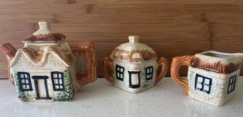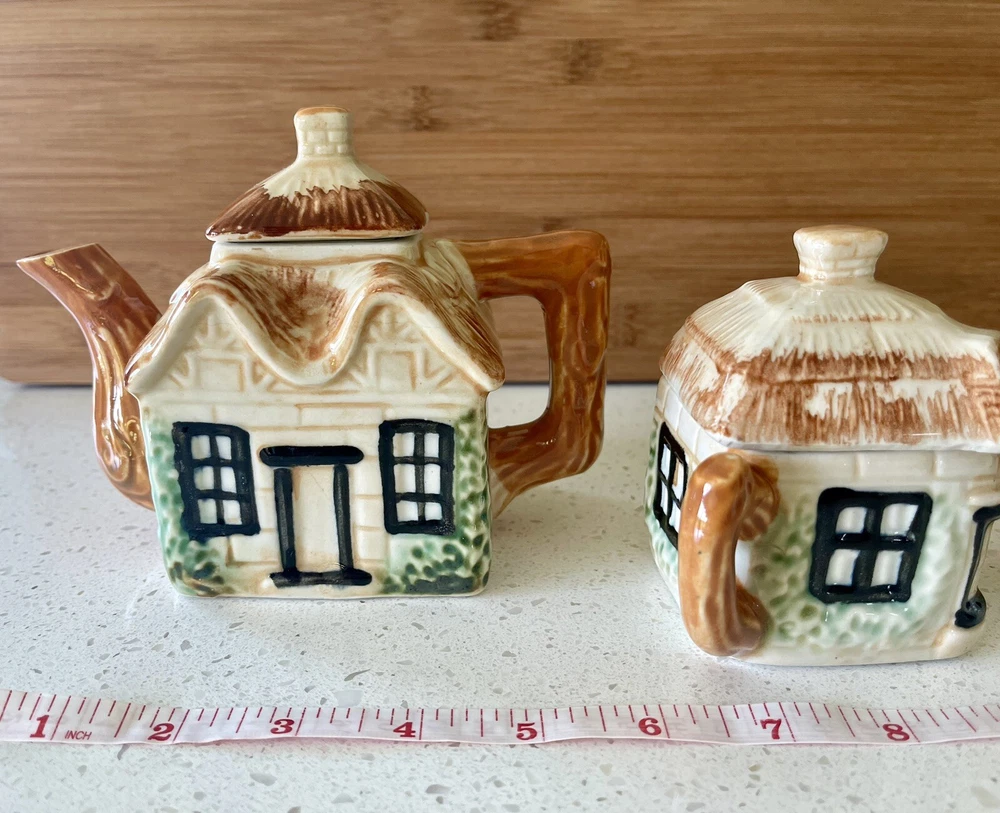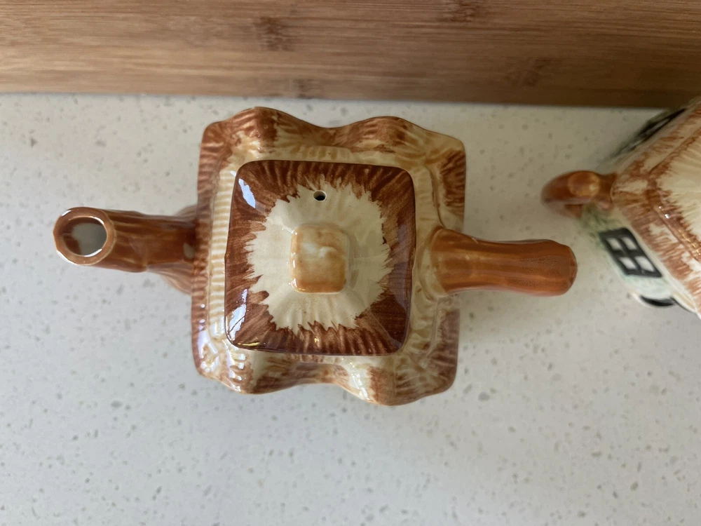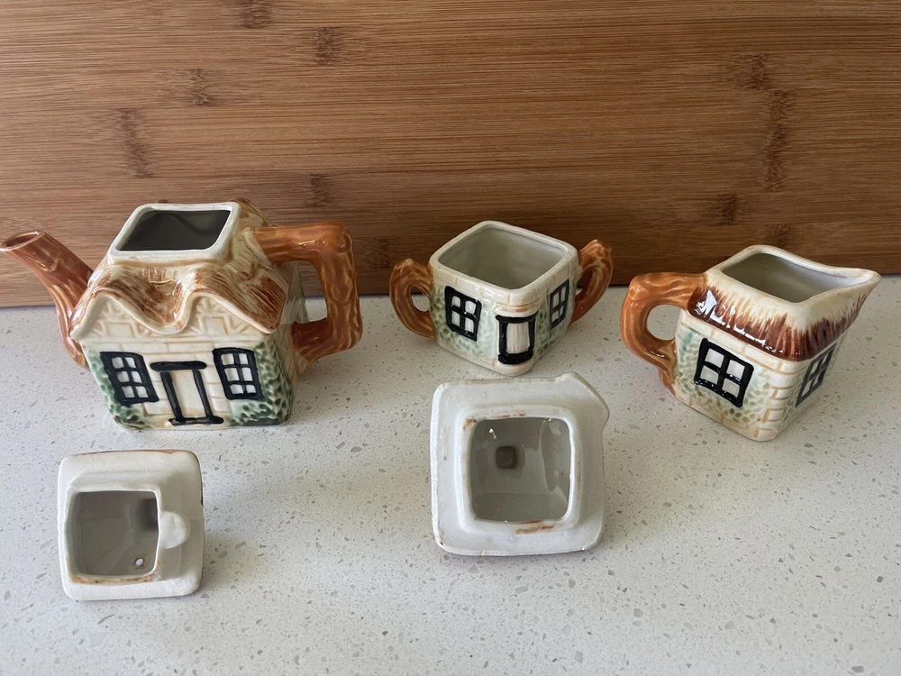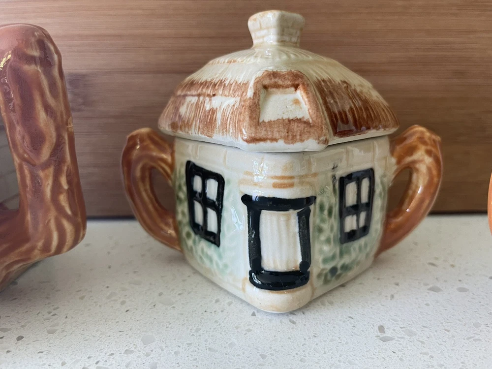 This is a vintage Cottage Ware tea set made in England by Price Kensington in the 1960s. The set includes a teapot, creamer, and sugar bowl, all featuring a brown cottages pattern. The set is an original and made of ceramic. It is a collectible item that would make a great addition to any kitchen or home decor. This set is in excellent condition with no chips or cracks. From smoke free home.