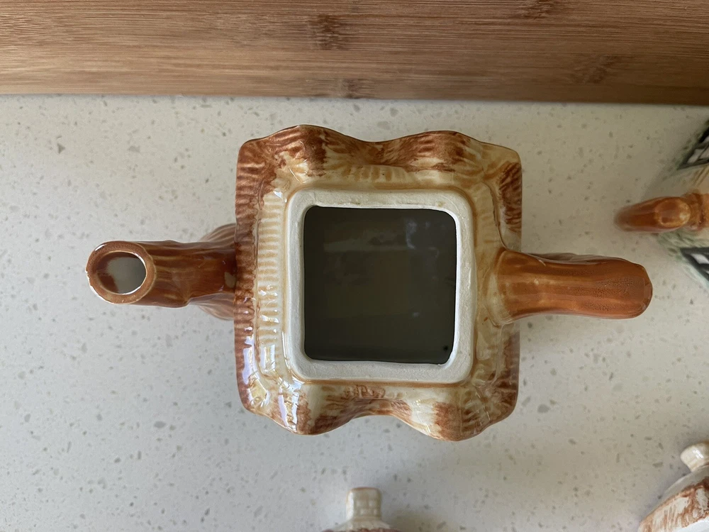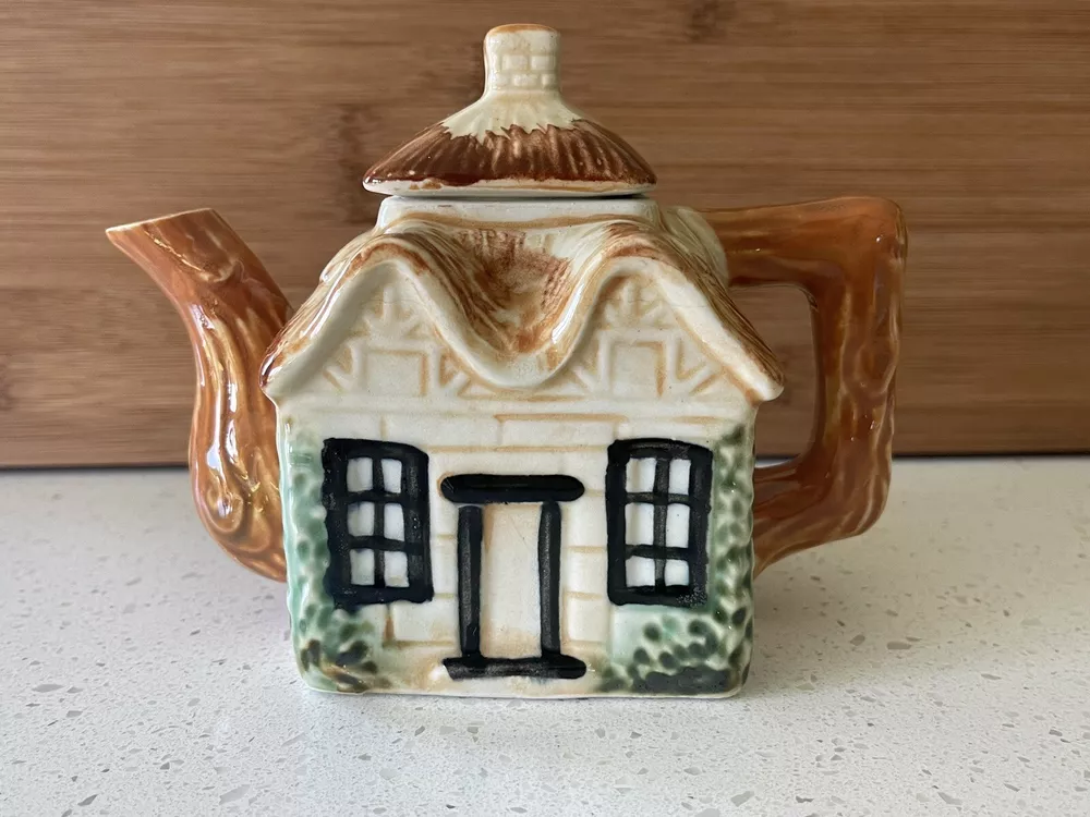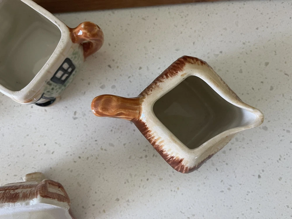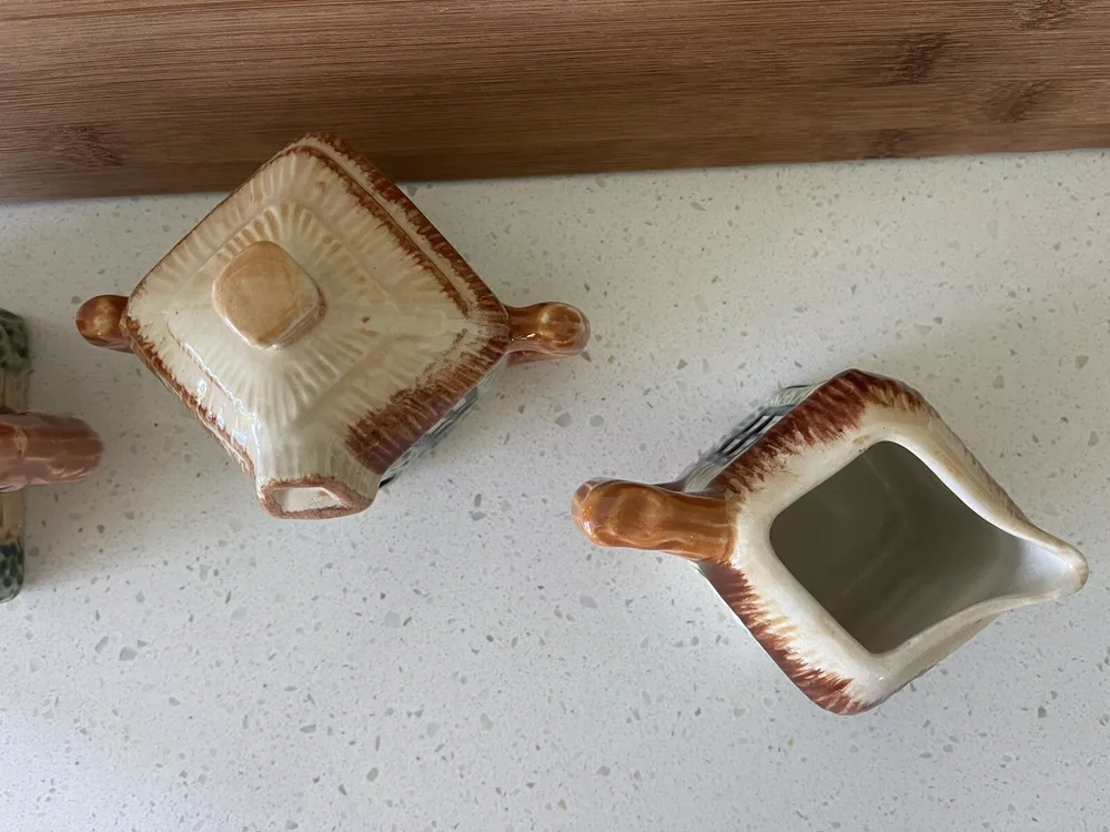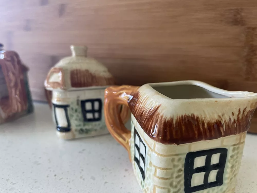 This is a vintage Cottage Ware tea set made in England by Price Kensington in the 1960s. The set includes a teapot, creamer, and sugar bowl, all featuring a brown cottages pattern. The set is an original and made of ceramic. It is a collectible item that would make a great addition to any kitchen or home decor. This set is in excellent condition with no chips or cracks. From smoke free home.