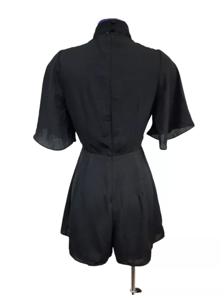 Cotton Candy LA Black Butterfly Sleeve V Plunge Choker Romper Size S Women's. In excellent condition Cotton Candy LA Black Butterfly Sleeve V Plunge Choker Romper Size S Women's. Features hidden back zipper, choker collar with 2 button closure, sheer chiffon butterfly sleeves, deep V plunge neckline, chiffon layers, goth, gothic, whimsygoth Fabric Polyester Measurements laying flat chest 17" length 29" arm inseam 4" waist 13" This is a pre-owned item that may show signs of wear. In excellent condition, No flaws.