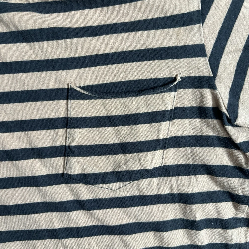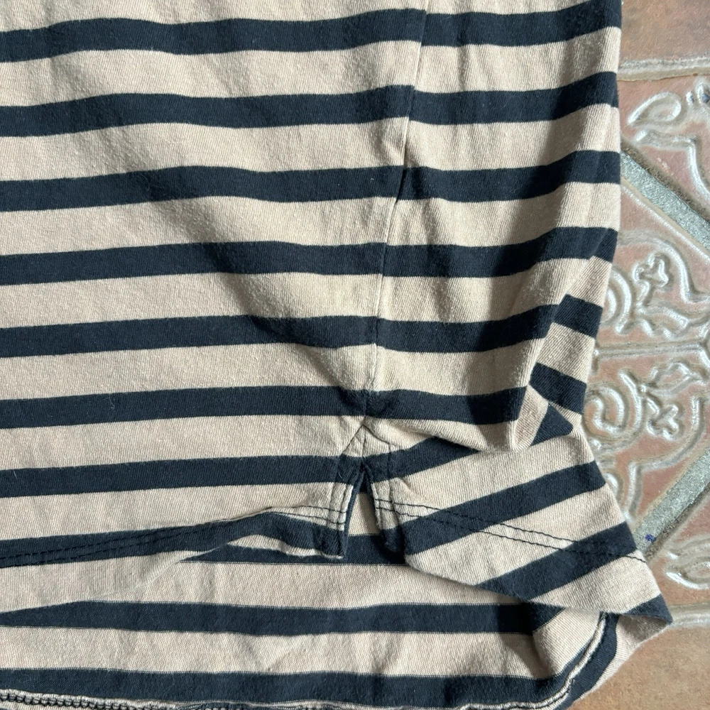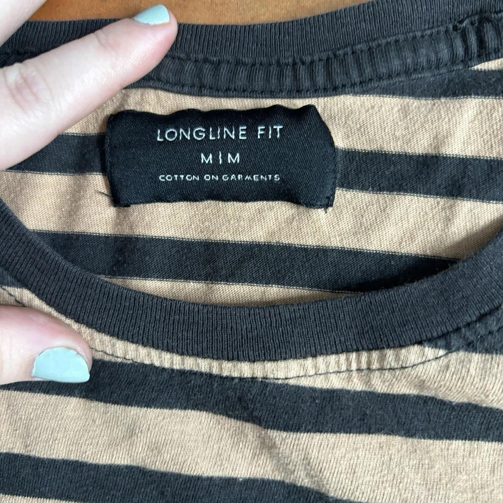 Cotton On Garment Tan Black Striped Longline Fit Men’s Front Pocket Shirt Size M In good overall condition. No tears/holes or stains. Brand label say longline fit and fits men’s size medium. Tan and black horizontal stripes with a front pocket. Some ware/nubbing on fabric from wear. Price reflects this.
