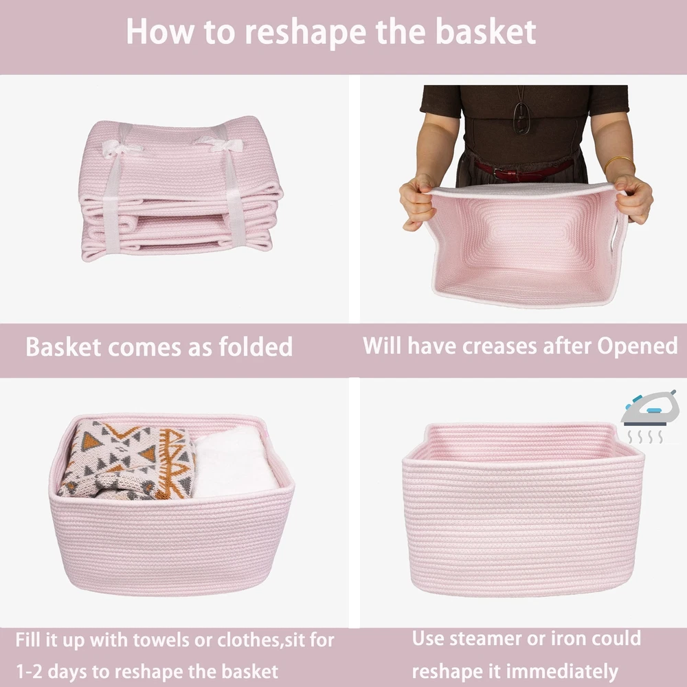 1, Medium to Large rectangle woven basket for storage: Our rope basket with handles size is 14.5”X9.5”X9.3”. Designed as home storage basket for organizing or storage bins. Could use as cube storage bins,nursery bins,toy basket, pet basket, book basket, towel basket, clothes basket, nursery basket, wicker basket for storage and more. Perfect as storage basket for shelves or closet storage bins to store household items. 2, Nature, safe and durable decorative basket for storage: We use heavier and non-toxic coiled cotton rope to make sure the quality of this cute rope basket. Those rope baskets is safe for people and Pet. No odor smell. As its soft, its foldable and easy to store as well. 3, Designed to complement your room and decor : We special chose classic solid color for those rope basket bins. Our rope basket with the solid colors could use as cloth basket and looks good in any room. Those rope shelf basket looks good in your shelves, closet or next to your bed and is an essential item for your daily storage. This cube rope storage basket enhances any room or décor at your home. 4, Between ovel to rectangle storage basket with handles: This cute square rope basket designed with seamless look handles. With the handles, the rope basket is easy move around. As the cloth storage basket made of soft cotton rope, the basket have no sharp edge, will not scratch your furniture. 5, Note:Products comes as folded, will have crease. Fully fill the basket with towels or clothes waiting for 1-2 days could reshape the basket. Steaming or Ironing could reshape the basket as well.