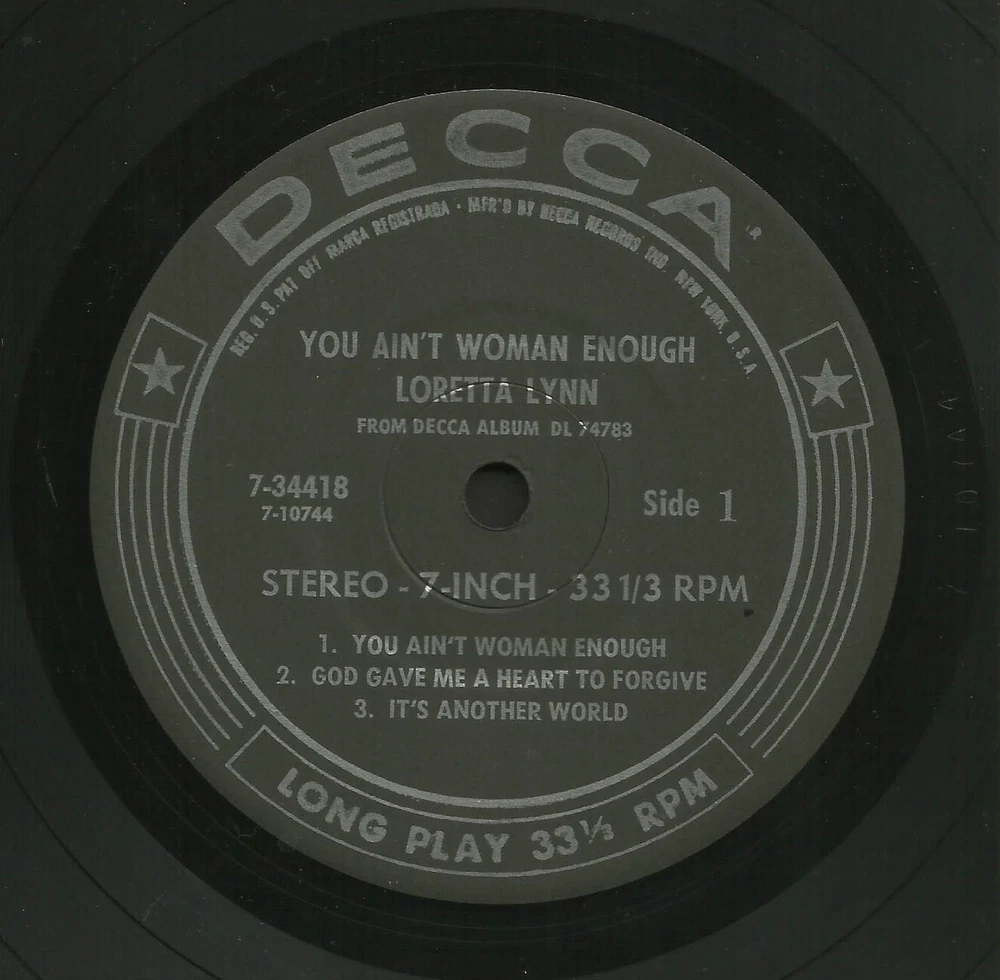 artist Loretta Lynn label Decca 34418 title You Ain't Woman Enough cover condition Mint- no seam splits, lite ring wear record condition VG++ Grading scale: NM / VG++ / VG+ / VG / VG- / G+ / Poor I combine S&H on multiple orders and have no problem starting a stack if you wish to combine S&H for future orders. Please view my other listings for more desirable 45's, 78's and LP's in the country, bluegrass, gospel, rockabilly, rock & roll, teen, instrumental genres.