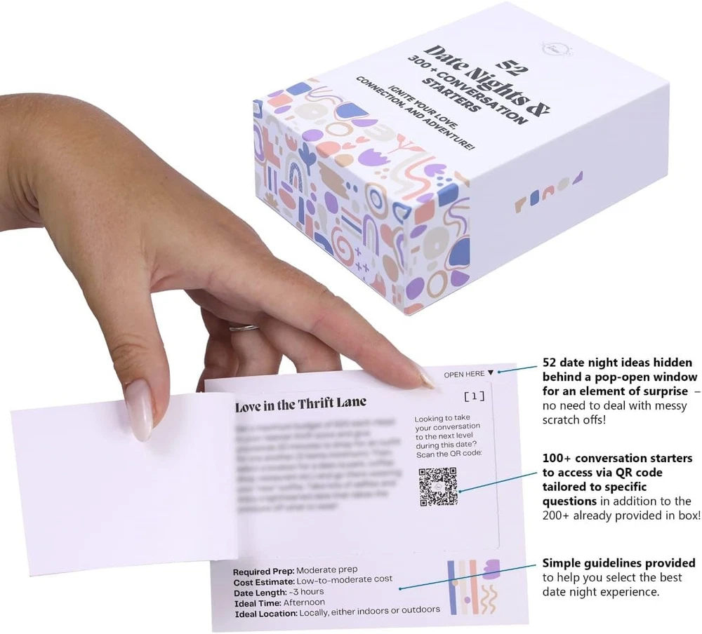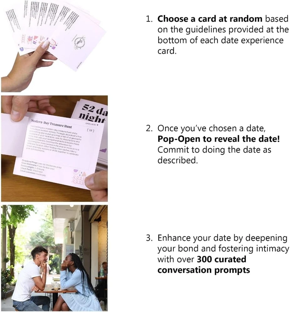 Store New Arrivals Add to Favorite View Feedback Contact Fast deliveries to the customer's home Quality customer service John Make the customers happy! Couples Gift Ideas - 52 Pop-Open Date Night Ideas and 300+ Conversation Starters. Great Card Games for Couples, Men, Women. Boyfriend Gifts, Bride Gifts Description Thoughtful Gifting Made Easy: Stuck in the rut of repetitive christmas presents or the same old wedding gifts? Elevate your gifting game with our unique 52 pop-open date night cards. Each elegantly crafted card surprises with a pop-open window, revealing a specially curated date night idea. For Every Special Moment: This isn't just a gift—it's an experience. Whether you're on the hunt for meaningful anniversary gifts for men, affectionate gifts for boyfriend, or the quintessential engagement gift, our set ensures many unforgettable memories and conversations. Celebrate Relationships At Every Stage: Every card holds the promise of a new adventure. Perfect for those seeking distinct bridal shower gifts or the most heartfelt bride gifts, these cards bridge the gap between young love and lifelong commitment, making them the ideal anniversary gifts for women. More Than Just Dates: Journey together into deep conversations with over 300+ starters in the box. And for those who crave more? A qr code grants access to 100+ additional topics. All of this, without the hassle of scratch-offs. For the ones desiring engaging boyfriend gift ideas or gifts for wife, this is your answer. Crafted With Passion And Precision: Every date idea is meticulously thought out, considering the length and prep time, ensuring a stress-free experience. If you're seeking innovative wedding registry ideas or unique engagement gifts for couples, your search ends here. Dive into an ocean of shared experiences and treasured memories. The adventure awaits! Product Description 1 How It Works: 2 Step 1: 3 Step 2: 4 Step 3: Why Choose Our Date Night Cards? Our set goes beyond just proposing activities. It encourages couples to truly engage, communicate, and understand each other's preferences. Whether it's a cozy night in or an adventurous day out, each card is designed with love and the intent to deepen your connection. Reignite the Spark: Life can sometimes become a monotonous routine, but with our Pop-Open Date Night Cards, you're equipped to reintroduce spontaneity, excitement, and intimacy into your relationship. So why wait? Dive in and make every date a treasured memory! Item model number 52DNC Style Pop Up-Open Language English Product Dimensions 5.9 x 4.5 x 0.1 inches Country of Origin China Item Weight 1.19 pounds Manufacturer recommended age 18 months - 8 years ABOUT US We offer the best prices around on high quality products. Our E-store includes media such as books, movies, music and games while offering electronics, toys, sporting apparel, clothing, tools, general home, garden items and more. SHIPPING We are always working hard to ensure your package arrives as soon as possible. Please understand that some factors like weather, high postal traffic, and the performance of shipping companies are outside of our control. We offer free shipping to the lower 48 states and ship within 2 business days of payment, usually sooner. We do not accept P.O. Boxes. Please provide a physical address. For shipping outside of the continental USA, we only use eBay's Global Shipping Program. The item is shipped to KY and then sent to the rest of the world. International customers are responsible for all duties and taxes. Continue to 'check out' to calculate costs for shipping the item to your country. Messages regarding eBay's Global Shipping Program MUST be directed at eBay EXCLUSIVELY. RETURNS We offer a 30-Day Return Policy on items in which you are not completely satisfied with. You have the option of a full-refund or an exchange of the item. No returns are available on items shipped outside of the USA PAYMENT We accept PayPal. CONTACT US This page content is yet to come Please ad us to your favorite seller and visit again later Thank You CUSTOMER SATISFACTION We try our very best to make sure every customer is completely satisfied. If there's a problem, message us! We're happy to help. WE ACCEPT