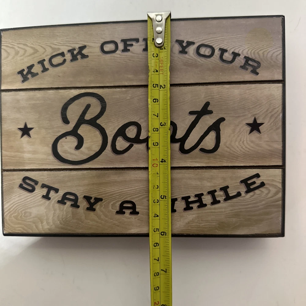 8 x 6 wall plaque says kick off your boots. Stay a while. New with tag still on it. See photos for condition. Please see all pictures for condition as for it is part of the description. Due to lighting, colors can vary slightly from pictures. ***Please take note*** Flat rate shipping is for the 48 inland states only! if you are purchasing and shipping to Alaska, Hawaii or Puerto Rico, please contact me before purchasing to get a shipping rate. Thank you for shopping!