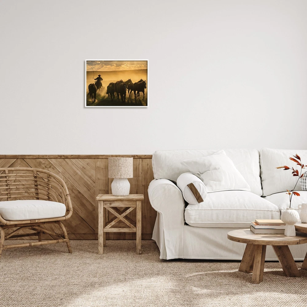Add dimension to any room with our textured Framed Giclee Artwork. Our framed artwork is securely mounted into a 1.5-inch thick wood grain frame and ready to hang. Frames are available in three alluring styles: black, gray farmhouse and white. In addition, you should check out our oversized options if you want a statement piece. Wall Art is made in the USA. Framed Giclee Sizes Include Standard: 14 x 1.5 x 11 Large: 20 x 1.5 x 16 Oversized: 30 x 1.5 x 24 Wall Art is Ready to Hang with Hardware Free Hanging. No installation required. For Easy Set Up Lean or Layer Artwork on Shelf or Against Wall. Our giclée prints are carefully mounted on a durable MDF backing, and then perfectly finished in a 1.5 inch thick woodgrain frame. Mounted frame colors include black, gray farmhouse and white. Made In USA. Artwork Relates To: Animal, Horse, Mammal, Person, Saddle, Halter, Cowboy, Lasso, Rodeo, Photography Design by PBurchettePhoto