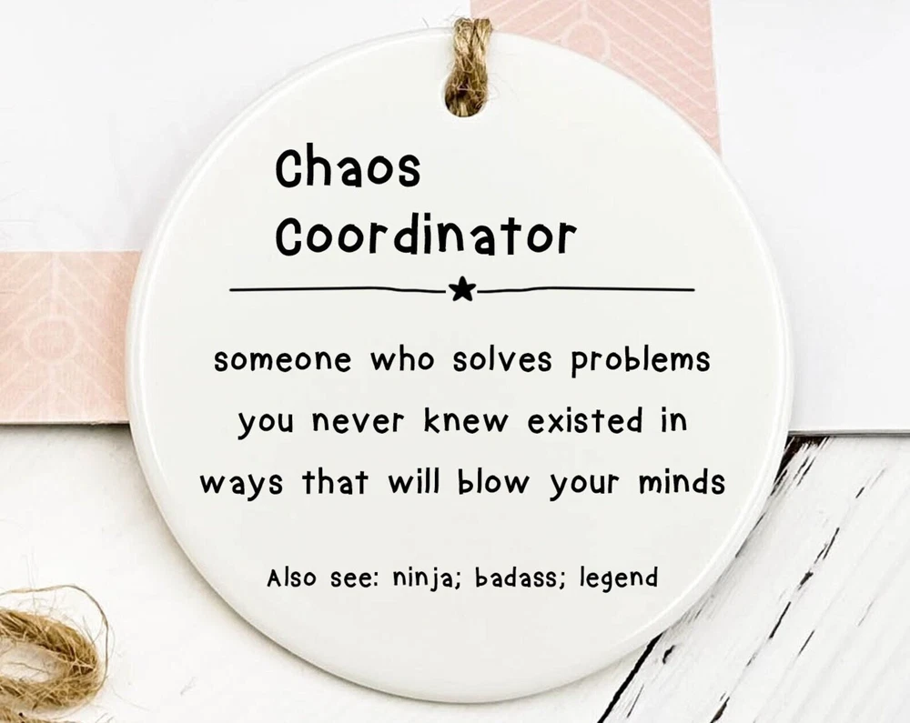 Coworker Gift Organizer Gift Personalized Appreciation Gift Ceramic Ornament Chaos Coordinator Definition Human Resources Gift Material: Ceramic Color: White Shapes: Circle, star, heart and oval Can be printed on both sides Imprint full-color artwork, photos, or logos Hole for hanging string and hanging string included Printed in the USA