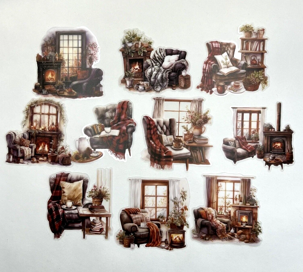 Cozy chair, books, hot drinks and crackling fire in the fireplace. These are large and very detailed stickers. Printed on (PET) thin clear flexible plastic. 10 pieces. The sticker in the last photo measures approx. 3 x 3 inches. I have more stickers, washi tape and paper for sale. If you would like to purchase multiple items please put all the items in the cart and then pay. I do combine shipping and I will refund you the difference in shipping after payment is made. Sorry, eBay will not allow buyers to request a total from sellers with immediate payment. Let me know if you have any questions through eBay messaging. Thank you for stopping by!