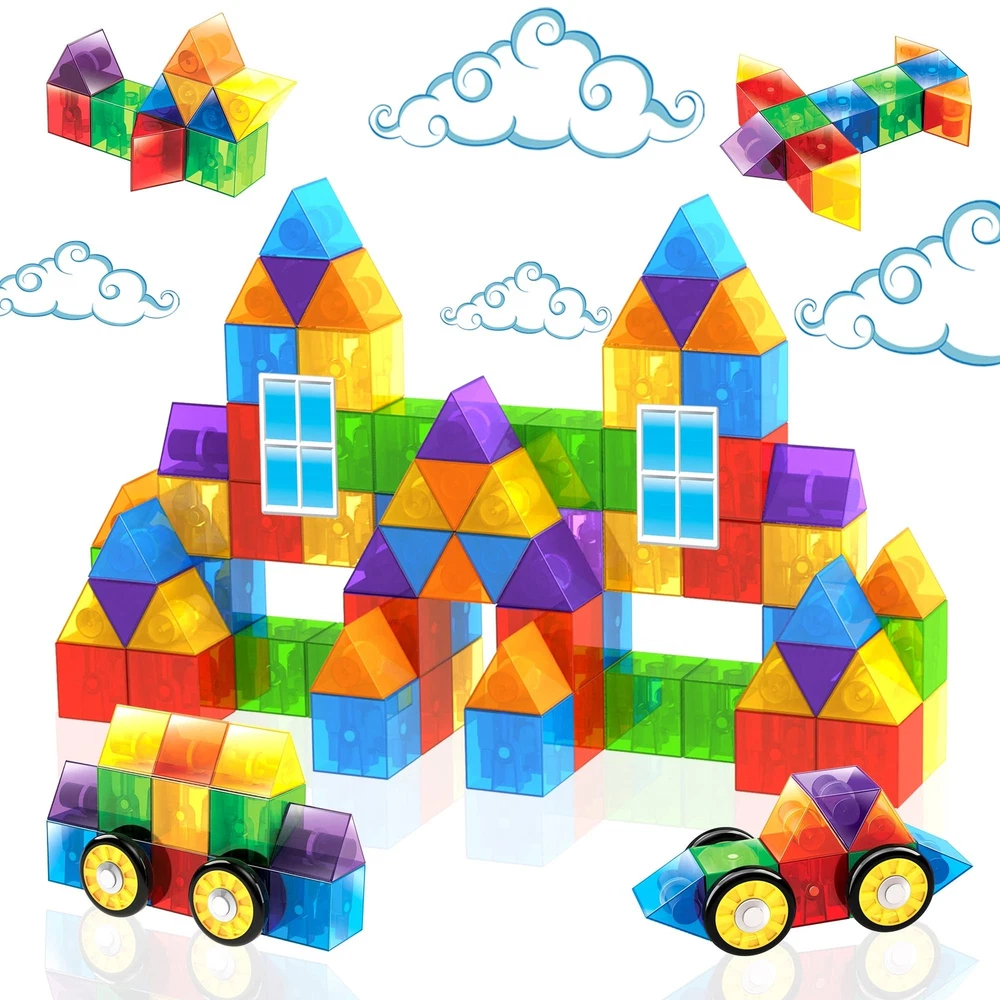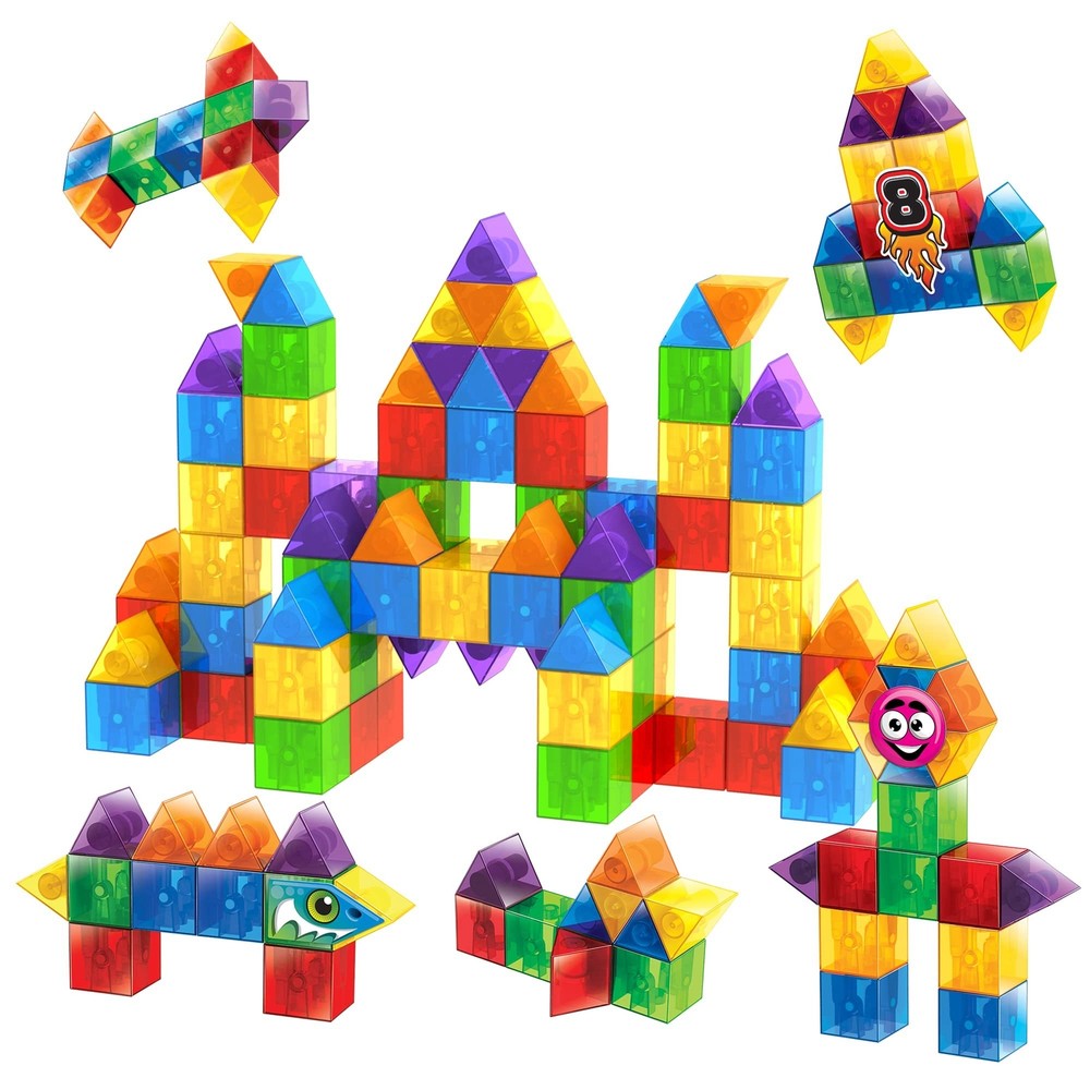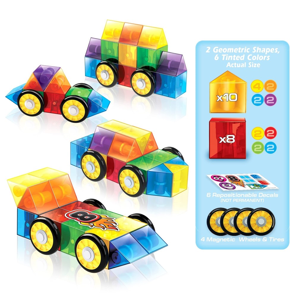 Cra-Z-Art Magrific 3D Magnetic Blocks 28 Piece Set - Colorful Magnet Building Tiles with 3D Blocks, Vehicle Wheels - STEM Skills Imagine, create and build using the magic of magnets – Magrific 28 Piece Set features mega magnetic power, fun tinted colors, 2 geometric shapes and endless play patterns Magrific 28 piece magnetic tile set comes with strong, safe plastic blocks that magnetically snap together Learn as you Build with shaped magnetic 3D blocks that feature magnets on all sides allowing you to build strong 3D shapes and vehicle projects Foster STEM Science and Math skills in a fun and colorful way! Magrific 28 pc magnetic tile set comes with square and triangle geometric shapes in 6 tinted colors; red, purple, green, blue, orange, and yellow and 4 wheels