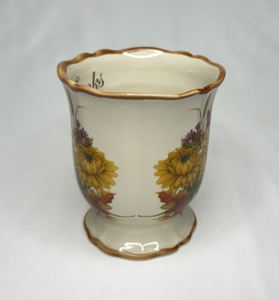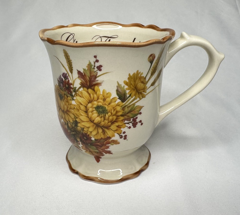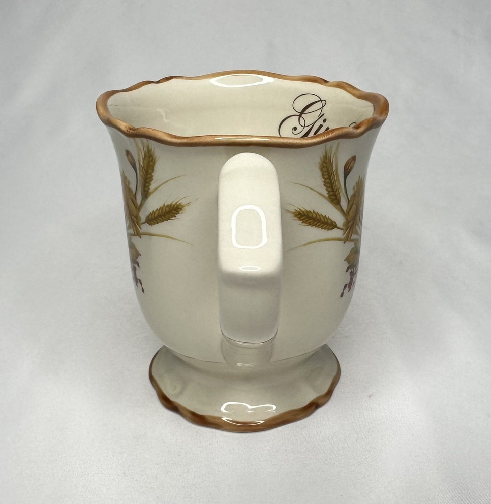 Cracker Barrel Family Blessings Give Thanks with a Grateful Heart Footed Ceramic Mug. Approximately 4 5/8” tall and 4” wide across top rim. Mug is in excellent pre-owned condition.