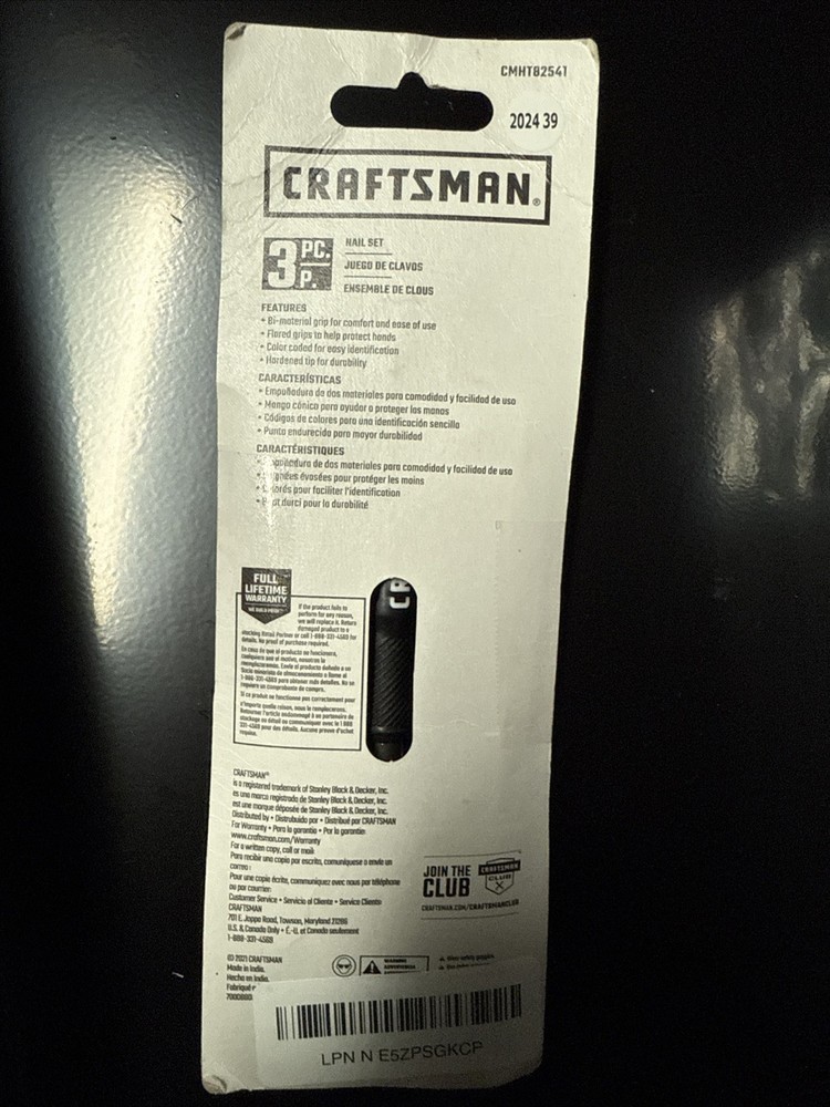 The Craftsman Nail-Set Punch is a versatile tool set designed for setting nails with precision. This set includes three different sizes - 1/32", 2/32", and 3/32" - allowing for a variety of applications. The black color and compact design make it easy to handle and store in your toolbox. Made by Craftsman, a trusted brand in hand tools, this nail punch set is a reliable option for any DIY or professional project.