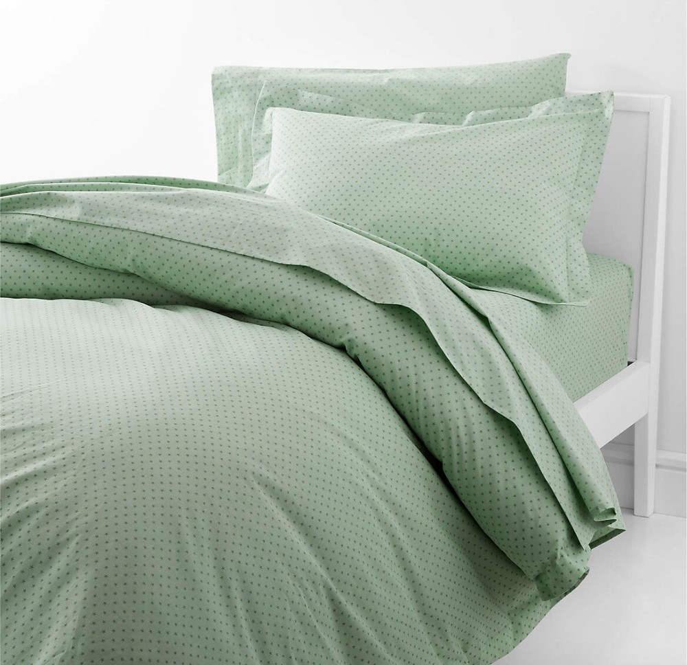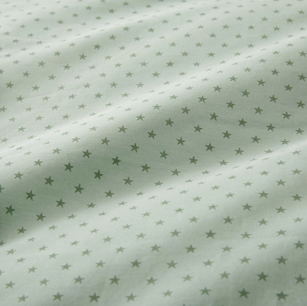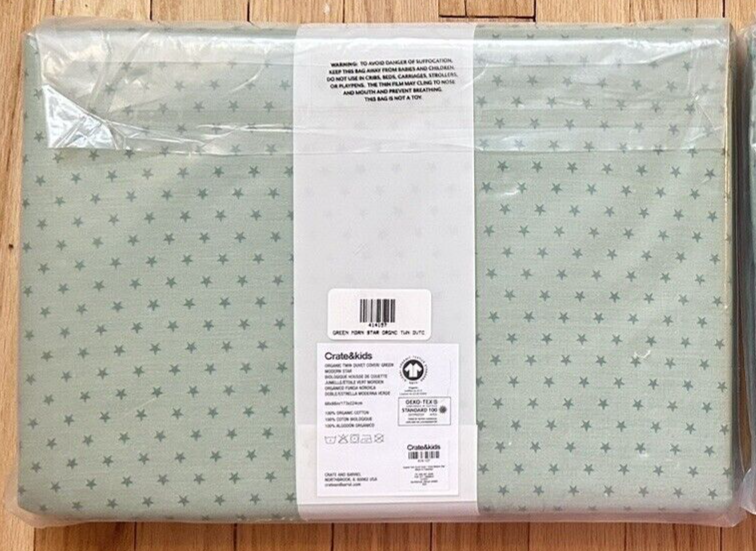 From the Crate and Barrel website: Almost like we plucked it right outta the night sky, our star-spangled bedding collection helps tuck 'em in so they can rise, shine, repeat. Printed in a sea green hue, the organic cotton fabric is brushed to create the buttery-soft-cozy-warmth of a fave t-shirt. (So yeah, the snuggle is real.) The bedding's simple, symmetrical star pattern is a standout but easy to mix with solids and other patterns. Parents will love the responsibly made supersoft brushed organic cotton: Compared to conventional cotton, it can reduce CO2 by 46%, energy consumption by 62% and irrigated water consumption by 90%. •100% organic cotton •Button closure •Reverses to same pattern •Machine wash cold; tumble dry low •Iron on medium heat •Do not bleach or dry clean Modern Star Kids Organic Brushed Cotton Multicolor Twin Duvet Cover 68"W x 88"D Disclaimer: last three photos are from an online source.