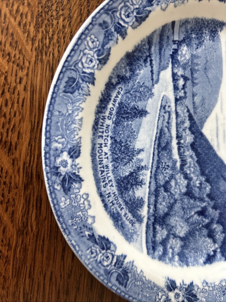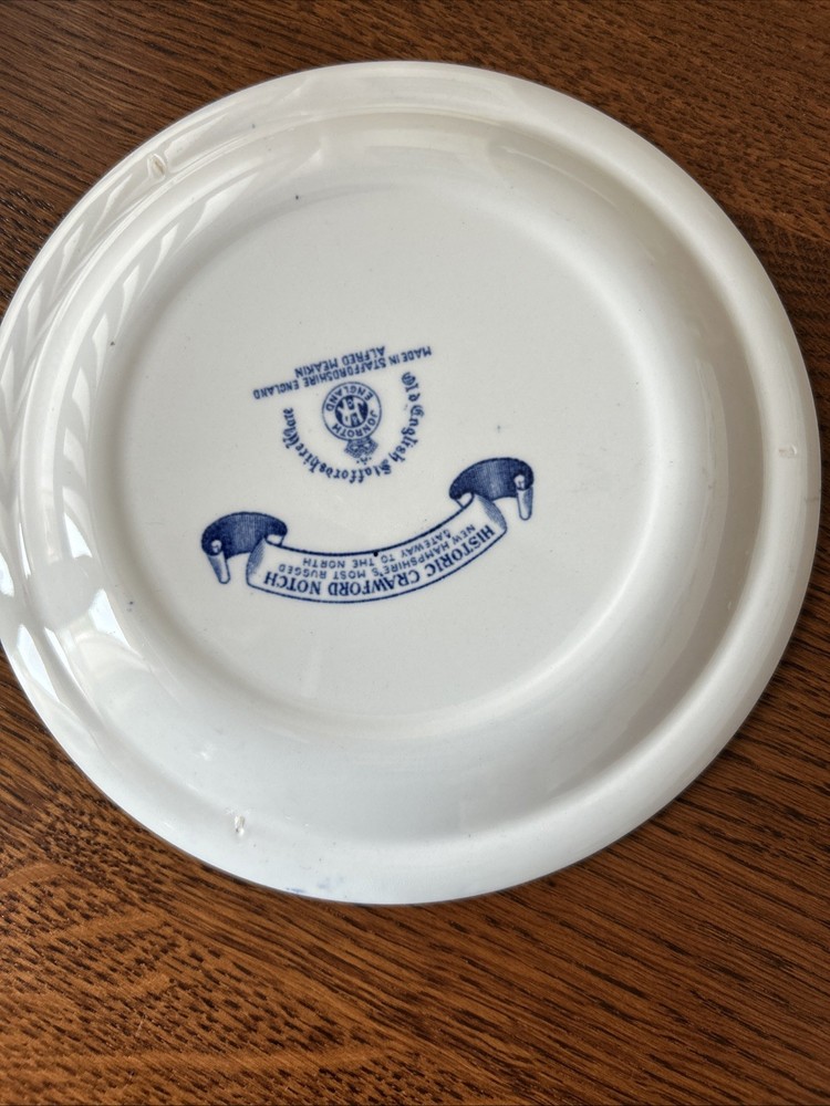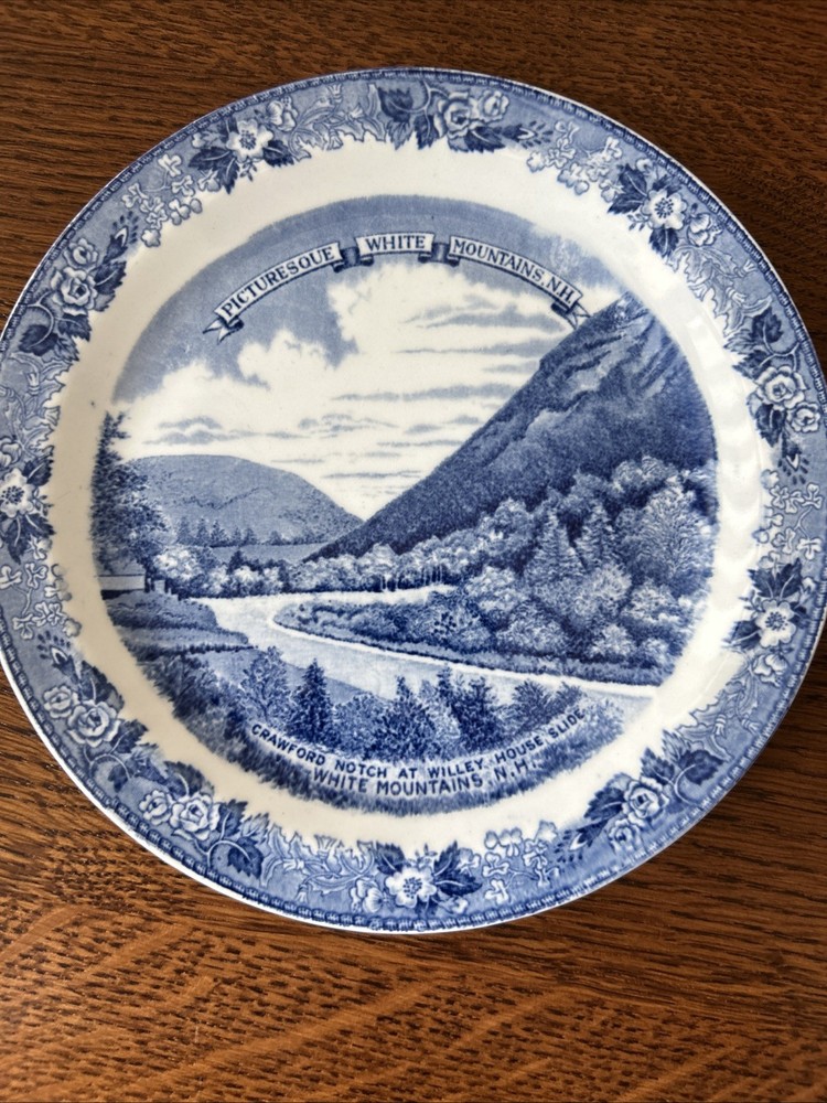The Crawford Notch - White Mountains, N.H. Staffordshire Jonroth England Plate is a vintage collector's display piece made of ceramic. This round plate features a picturesque design depicting the historic Crawford Notch in the White Mountains of New Hampshire, in a mostly blue color scheme. Produced by the Staffordshire brand in the United Kingdom, this art pottery piece is a unique and charming addition to any collection of decorative collectibles, showcasing the beauty of the English culture and craftsmanship.