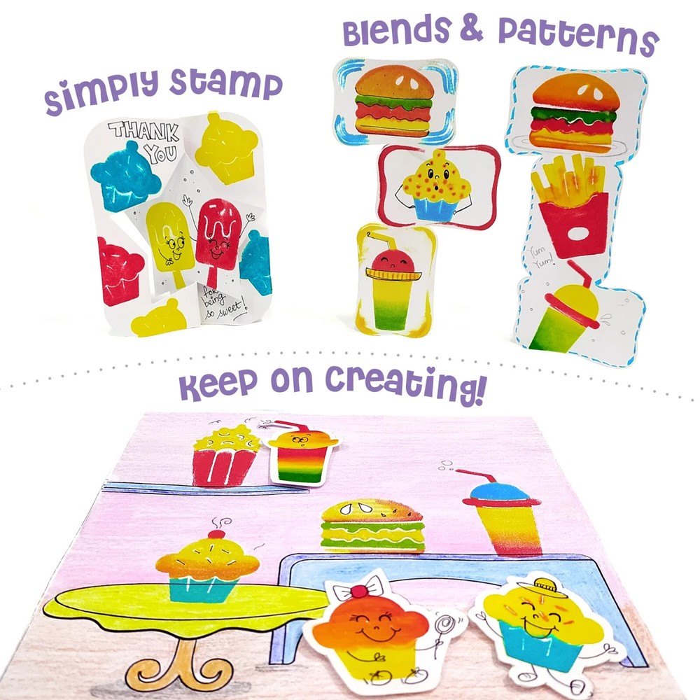 ART DIY SET: Great fun activity kit comes with adorable 6 Stamps, 3 Stamp Pens and 4 Creative Projects - making it a great art set for kids SIMPLY STAMP: Simply swipe the Stamp Pen to effortlessly imprint the yummy food theme designs like ice cream or cupcake. Then just wash and reuse again and again EASY BLENDING: This colours set for kids comes with a combination of stamps and pens that are Easy Blending - now, creating beautiful blends and patterns is child's play MESS FREE CREATIVE PLAY: A new way of stamp art - say goodbye to messy paint with our mess free Stamp Pens ONE STAMP ENDLESS POSSIBILITIES: These stamps can also be used in cool crafts like card making, scrapbooking and lots more AGE - 3 Years and above