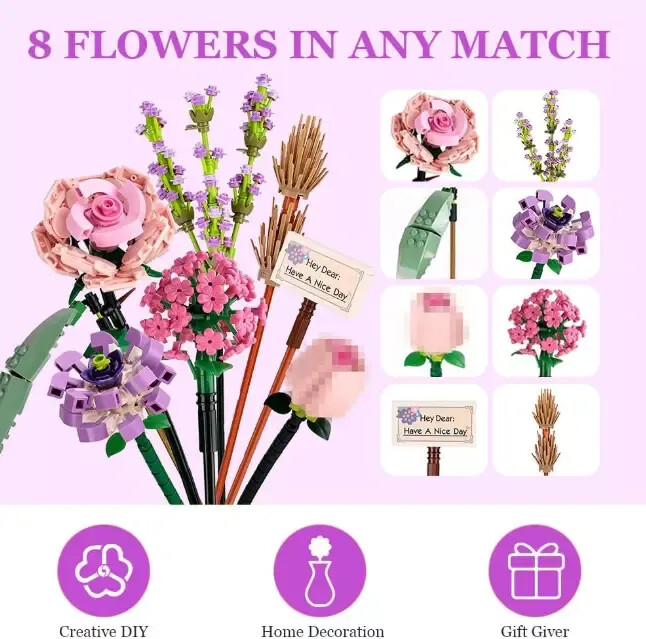 Set Flowers Bouquet Building Set, Creative Artificial Wildflowers Botanical US Warehouse - FREE & FAST Shipping in USA Product Description: 【Pink Roses Bouquet Building Blocks Set】 : Roses eight flower set, lavender, rose, hydrangea, camellia and grass + making manual. Follow our painting manual and you will have a perfectly realistic bouquet. 【High Quality Safe Building Blocks】 : The bouquet building blocks are made of ABS plastic, with precision cutting technology and advanced color treatment, no fading, smooth edges, and will not hurt your hands. The position of the building blocks is accurate, can be disassembled and assembled repeatedly, and the playability is super strong. 【Unique Diy Design】 : Contains 547PCS creative building blocks, each bouquet of flowers has unique characteristics and meanings. You can use your creativity, freely match our other bouquets, create your flower arrangement art, swingable petals and leaves, adjustable stem length, design a meaningful flower for yourself. 【Fun Project】: The flower bouquet building kit can help you release stress and focus, cultivate children's patience/concentration/thinking/hands-on ability in an easy and fun way, learn to decompress, and enjoy assembling toy games. 【Exquisite Gift】: The bouquet set is an ideal gift for family, friends, partner on Valentine's Day, Birthday, Mother's Day, April Fool's Day, Thanksgiving Day and Christmas. Beautiful preserved flower bouquets can express your love and surprise to them. And it can also be used as a home decoration. Feedback: 1.Any question for your order, please contact us in time, we will reply to you within 24-48 hours and give you a satisfactory answer. 2.If you are satisfied with our products and services, hope to take up a little precious time to leave feedback reviews for our products.Thanks! 3.Your satisfaction is our effort. Welcome to order again! Have a great day! Our Policy: 100% Satisfaction Guarantee 30 Days Return and Refund Guarantee Free and Fast Shipping in USA, US Warehouse 15% of restocking fee will be charged for return it