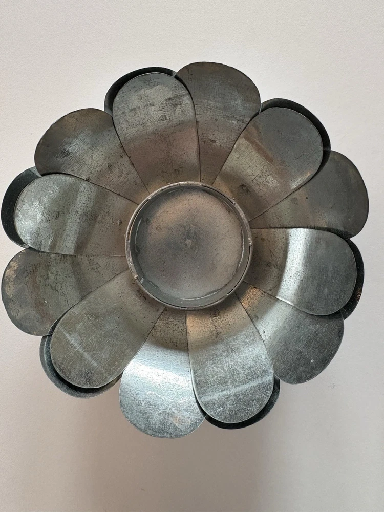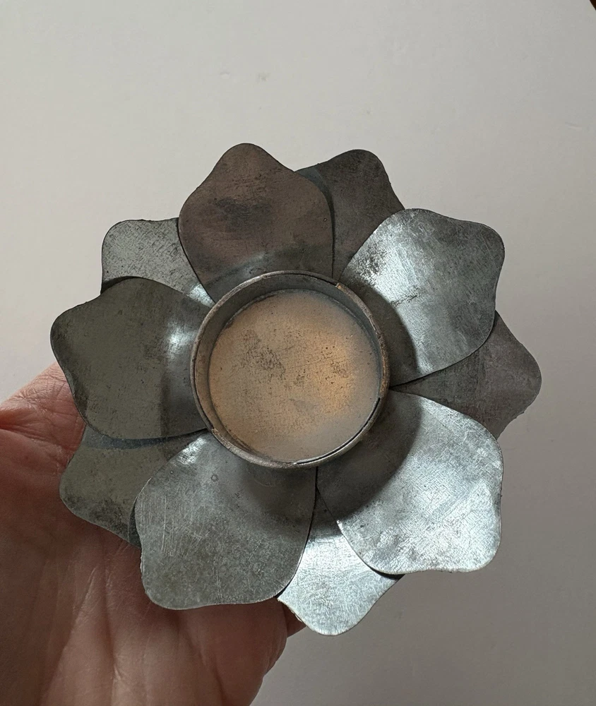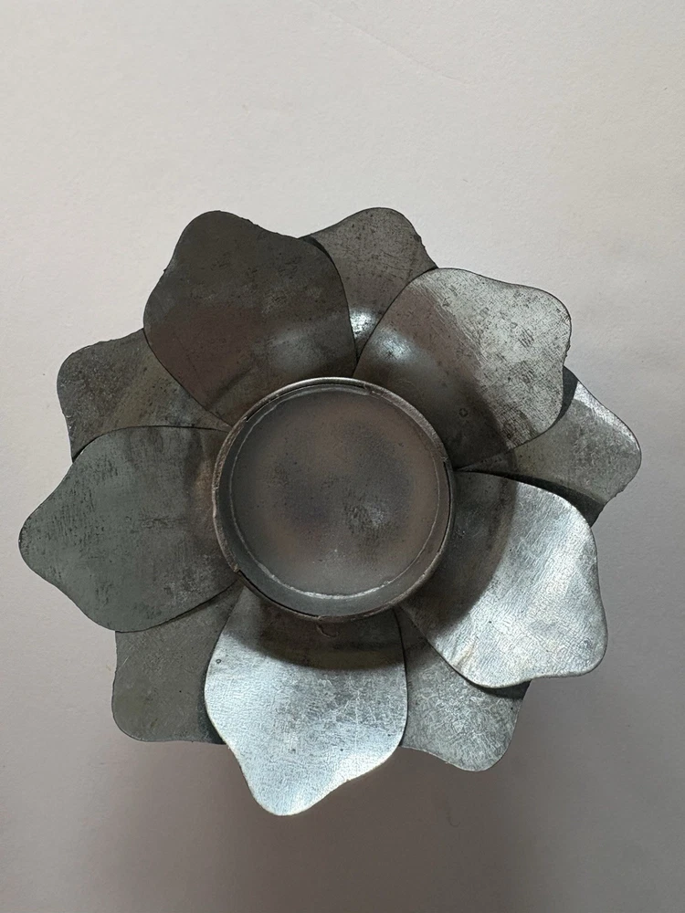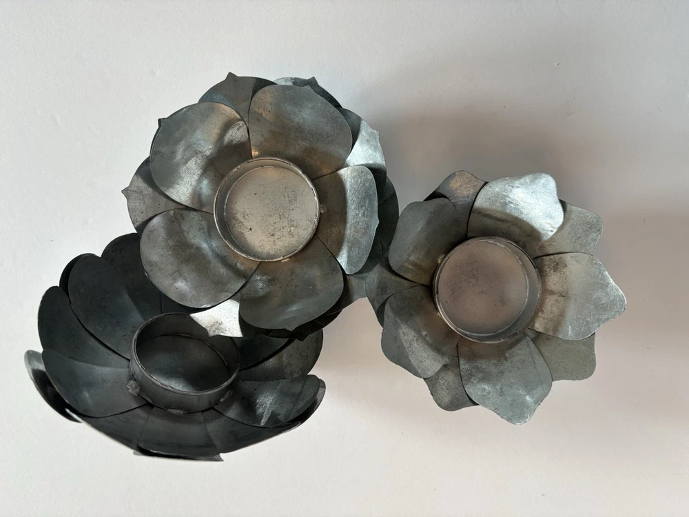 Set of three different styles lotus flower tea-light candle holders made of metal. Base is also metal. Two are the same size and the third one is a little smaller. The larger ones measure approximately 1.5”x 4.5”. Smaller one measures slightly under that measurement. Smoke free home. Excellent condition. BC