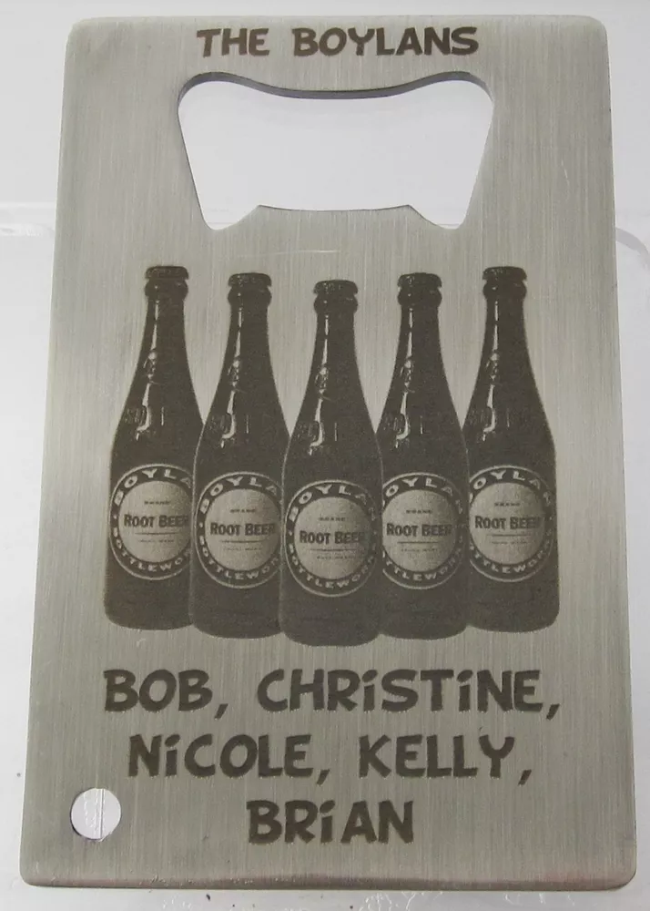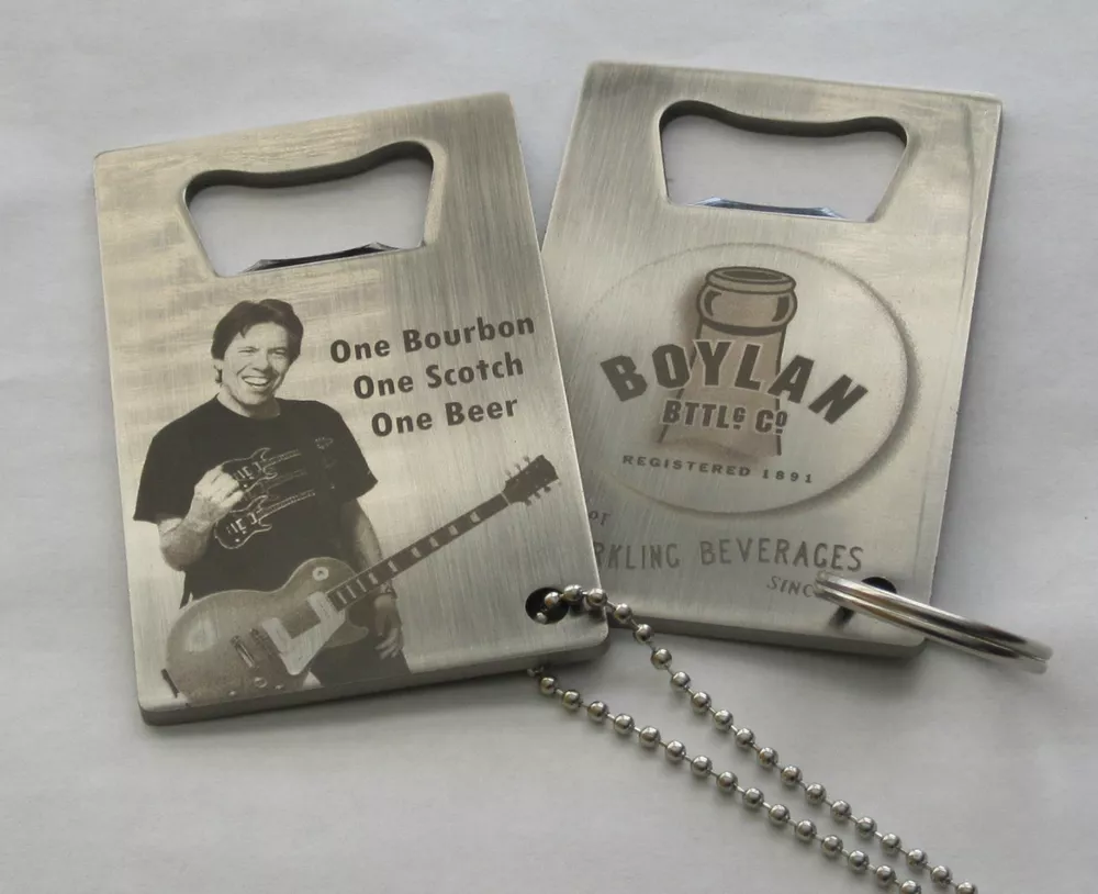 *NEW PRODUCT* Custom Engraved Credit Card Bottle Opener You are purchasing 1 completely customized Credit Card Bottle Opener, with your designs laser engraved. Truly a one-of-a-kind gift, gag, or to commemorate a special event. HOW IT WORKS: After paying, send us your design(s) via email to us (see last auction photo for address) and, if ordering front-and-back engraving, tell us which design is for the front and which design is for the back. We can add text to your designs, but we do not perform graphic design services. The custom bottle opener is usually shipped within 1 business day. WHAT WORKS BEST? Text and graphics work well. Images and photos can work okay, as long as they are very good quality and not too dark. If you're not sure, we will gladly check the quality before you purchase - just send us your designs via email to us (see last auction photo for address) and ask if suitable for a bottle opener. ABOUT THE BOTTLE OPENERS: The bottle openers are sized like a very thick credit card ( about 2-1/8 by 3-3/8 inches and 1/10 inch thick ) and are heavy, weighing about 2-1/2 ounces. They are plated metal with a brushed nickel finish. A hole in the corner makes them easy to hang, or attach to a chain or key ring. ABOUT THE ENGRAVING: Our state-of-the-art laser will etch your design a fraction-of-an-inch into the metal. The design is flat on the surface, not raised. The mark will be a dark brown wherever your design is black. Shades of gray will be shades of brown created with tiny little dots. The engraving is permanent. Click here to see different colored bottle opener auctions ** ENGRAVING ** After checking out, send your designs and instructions to us (see last auction photo for address)