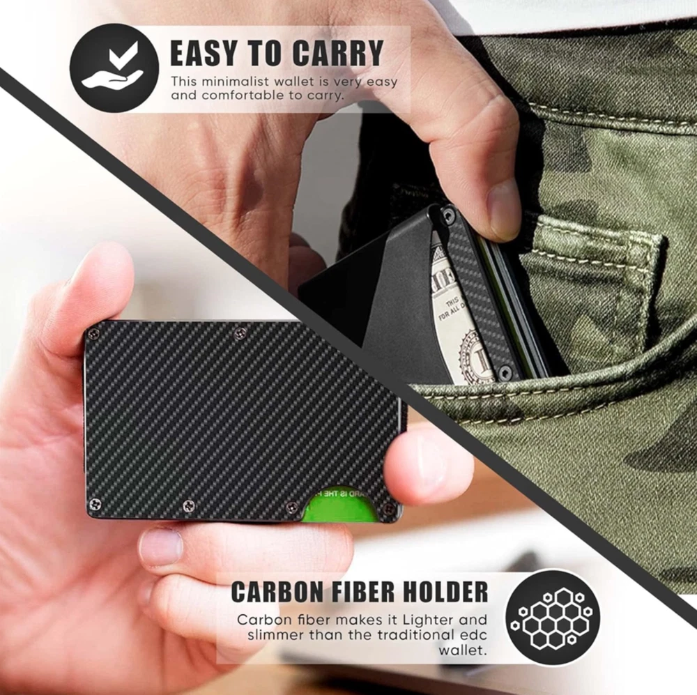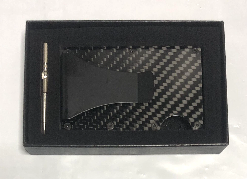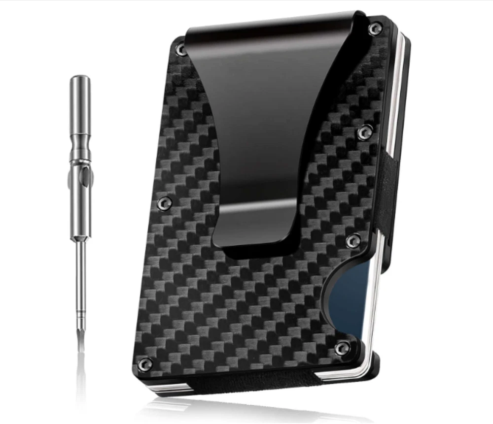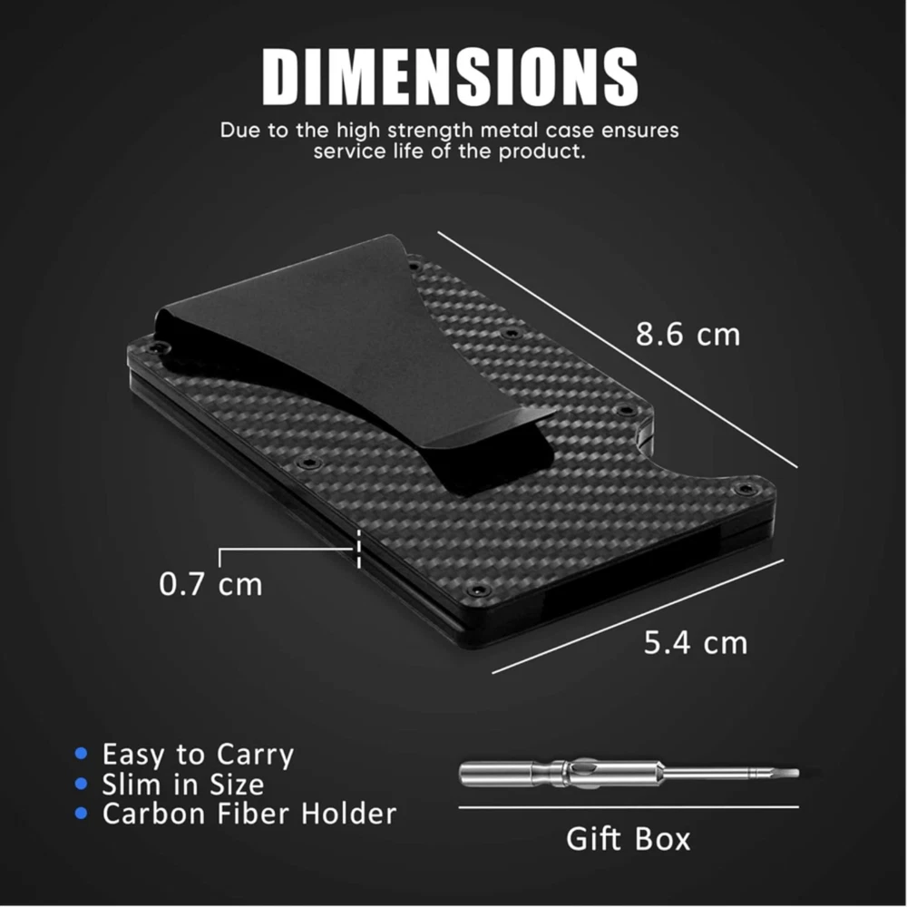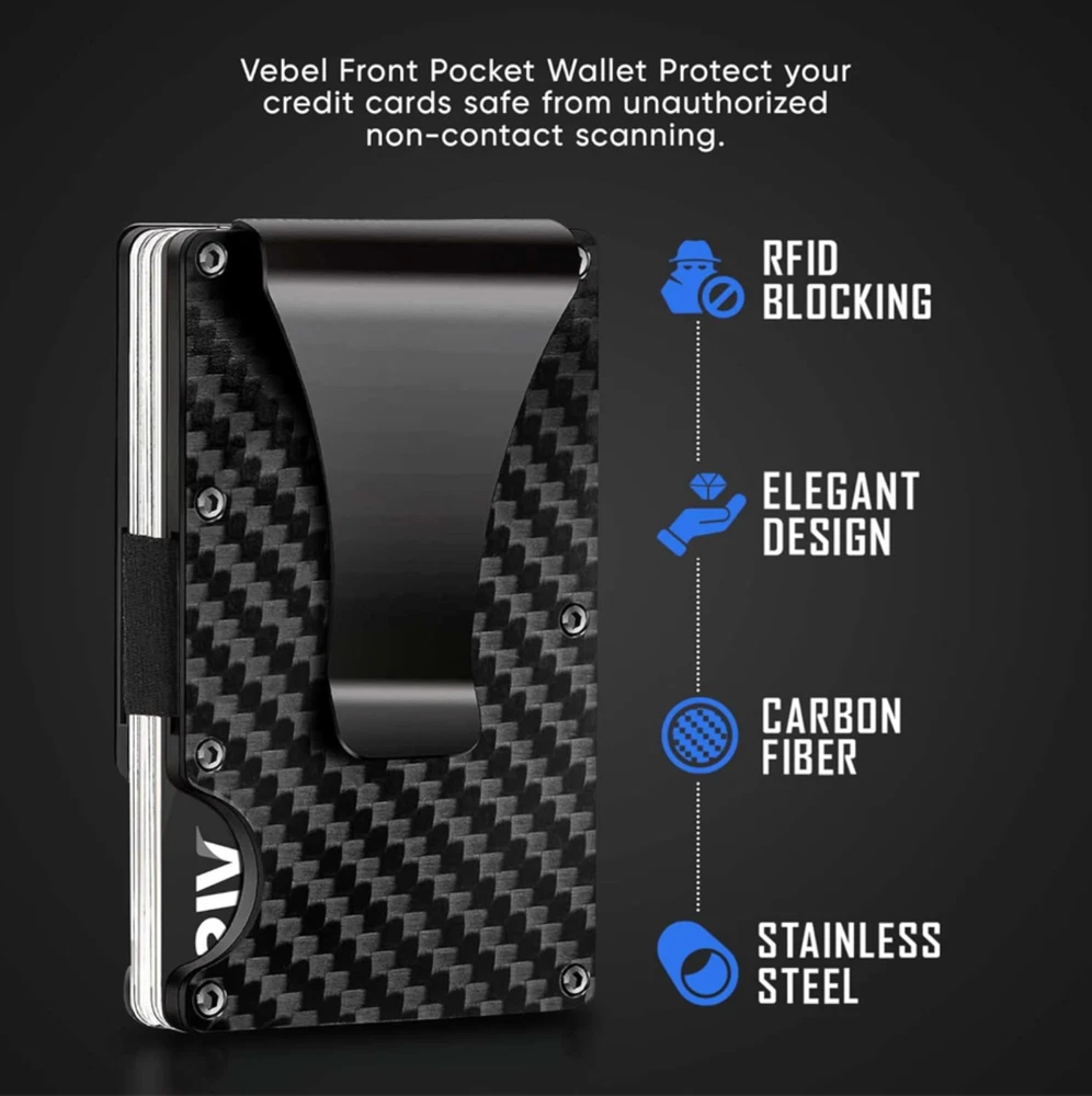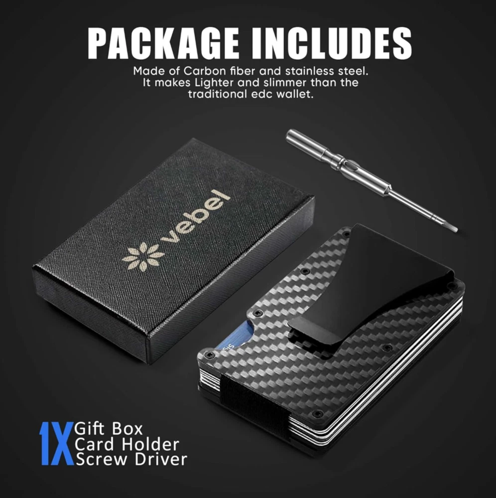 Vebel Credit Card Holder - Carbon Fiber NFC RFID Blocking Wallet Metal with Front Pocket Money Clip Super Slim Case Holders Small Screw Driver Gift Purse for Men, Black Brand Vebel Colour Black Material Carbon Fibre Style Modern Pattern Solid About this item 【 ADD ON 】- A smart “Screw driver” is part of the package to tighten up the screws of not only the card holder but for other things as well, if needed. This is a small little hex. You can also use this to unscrew all the screws on the outside of card for making this more modular or to detach the money stand. 【 New Minimalist Light Metal Elegantly Designed Wallets 】- This professionally designed super slim metal wallets are new trendy and most demanding item for people of all professions. Their light weight trait allows everyone to carry them easily and comfortably than any other ordinary case. The super strong metal surface with slim structural feature is astoundingly durable and reliable. 【 Carbon Fibers and Premium Quality Stainless Steel 】- The premium quality stainless steel at edges and fine carbon fibers of case body give it an amazing look that extends brilliance in quality. The well knotted carbon fibers made of crystalline carbon filaments are strong and stiff with an additional property of chemical and heat tolerant. They are perfect for this century modern metal wallets. 【 Monolithic Money Clip 】- The spring metal money clip of vebel metal wallet keeps your money secure without the risk of falling out during travelling at public places. Additionally, it can also be used as a shopping notes holder for quick reminders. This smart clip can be easily fixed in pockets thus makes holding the money and notes safe and comfortable. 【 Anti-RFID Card Holder with Maximum Holding Capacity】- These men's credit card holders are specially designed to protect your cards from any unauthorized scanning by thieves and keep your credit cards information secure. They have a maximum capacity of holding 15 cards at a time like ID card, credit card, debit card, visiting card or driving card etc. The elastic band keeps cards safe and sturdy without any fear of falling out. 【A Perfect Gift for Your Loved Ones】- This amazing item can serve as a perfect gift for your near and dear ones on special occasions like Birthdays, Christmas, Father's Day, Valentine's and Thanksgiving Day. It comes in an elegant gift box. Your family and friends would definitely love to have this as a lovely gift from your side . Product Description Product information Product Dimensions 4 x 2.8 x 0.4 inches Item Weight 2.12 ounces Department Mens Manufacturer VEBEL Country of Origin China Item model number 001 Item Weight 60 Grams