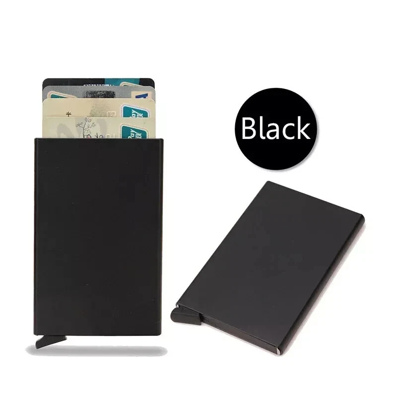 RFID Credit Card ID Holder Thin Slim Mini Wallets Luxury Metal Carteras Choice RFID Blocking Technology : Protects your credit cards from unauthorized scanning and theft. • Slim and Minimalist Design : Slim and compact design fits easily in your pocket or bag. • Luxury Metal Material : Durable and high-quality metal material adds a touch of luxury to your everyday carry. • Multiple Card Slots : Holds up to 6 cards, making it perfect for those who need to carry multiple cards. Materil : 304 stainless steel aviation aluminum Color: Black Size: 9.76cm (3.8 in) / 6.36cm (2.5 in) / 1.12cm (0.44 in) Number : C2304H3 Feature : It can hold 5-6 cards and some paper money This Is Not a Simple Metal Card Wallet It Also Has Anti-theft Function Note: to prevent theft refers to the credit card information being stolen. This is a black metallic minimalist wallet for men, designed as a thin and slim credit card holder with an ID slot. It has a solid pattern and features credit card compartments. The wallet is compact in size, measuring 9.8 inches in length and 6.4 inches in width. It has a luxury metal design and is manufactured in China. The Best gift for Husband , Boy friends and Father ! Size: 10.1cm(4 inch) / 6.9cm(2.7 inch) / 1.7 cm(0.67 inch) Color: Black Feature: It can hold 6 cards and some paper money The Best gift for Husband , Boy friends and Father ! : 1.:10.1*6.9*1.7 cm , : 11.1*7.9*2.7 cm,:12.4*7.8*2.1 cm 2.:90g ,:40g 3.:; 4.:,1,17; 5.:50*40*30cm , 200,23 kg; 6.:; 7. logo ://, 100; 8.7 8.,.
