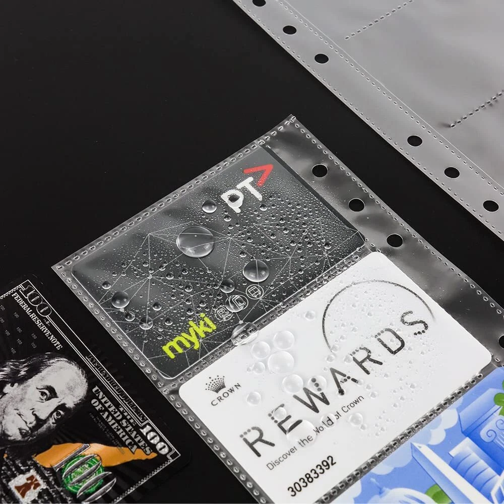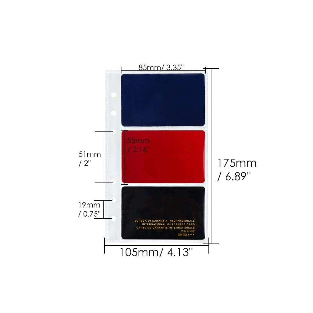 Credit Card Holder Pocket Business Cards Refills Card Binders,6-Ring 25 Sheets Features: đăKeep Precious MomentsăThe size of the binder pocket is specially designed for all kinds of VIPs cards, credit cards, ID card and one pocket can hold 2 universal size card. Better storage so you don't have to look for cards everywhere. The touch is smooth, delicate and comfortable, making memories more tender. Loose-leaf design, flexible collocation, DIY your personal collection. Transparent and intuitive, better protect your memory. đˇă3.35x2.16" Cards ProtectorsăIt's fits standard A6 6-ring cards. Each page can hold 6 cards of size 85mm x 55mm / 3.35" x 2.16" (3 for front and 3 for back); Page layout: horizontal (Landscape). The A6 album binder size: 105mm x 175mm (4.13" x 6.89"); 6-ring clip spacing: 19mm/0.75"; 51mm/2". It is recommended to put cards with chips in a separate pocket â¤ď¸ăCare for MemoriesăThe Card binders is made of environmentally friendly material polypropylene, which is waterproof and can effectively protect the photos from fading and sticking. Cards are inserted laterally from the inside, preventing them from falling out during handling. PP material is transparent and has no odor. Very light, thin, high quality, easy to take and effortless. đăHigh-quality BinderăIt's suit for any A6 standard 6-ring photo sleeves binder. Different inner pages can be selected and matched freely. Ideal for storing credit card, postcards, photos, VIPs, bank cards, airline tickets, documents, cards, coupons, passports, pictures, scrapbooks, collectible cards, seed binders, note cards, flash cards and more. SHIPPING We are always working hard to ensure your package arrives as soon as possible. Please understand that some factors like weather, high postal traffic, and the performance of shipping companies are outside of our control. We offer free shipping to the lower 48 states and ship within 3 business days of payment, usually sooner. We do not accept P.O. Boxes. Please provide a physical address.
