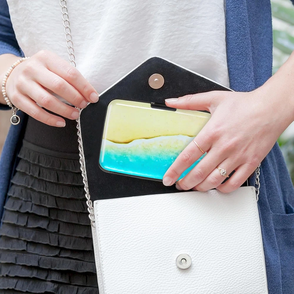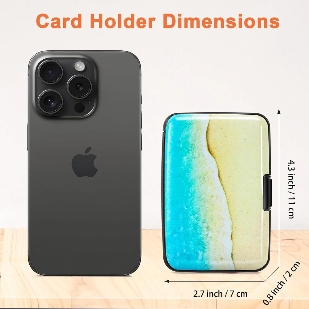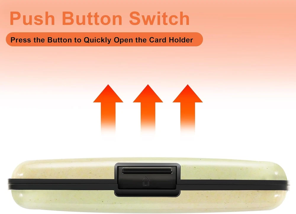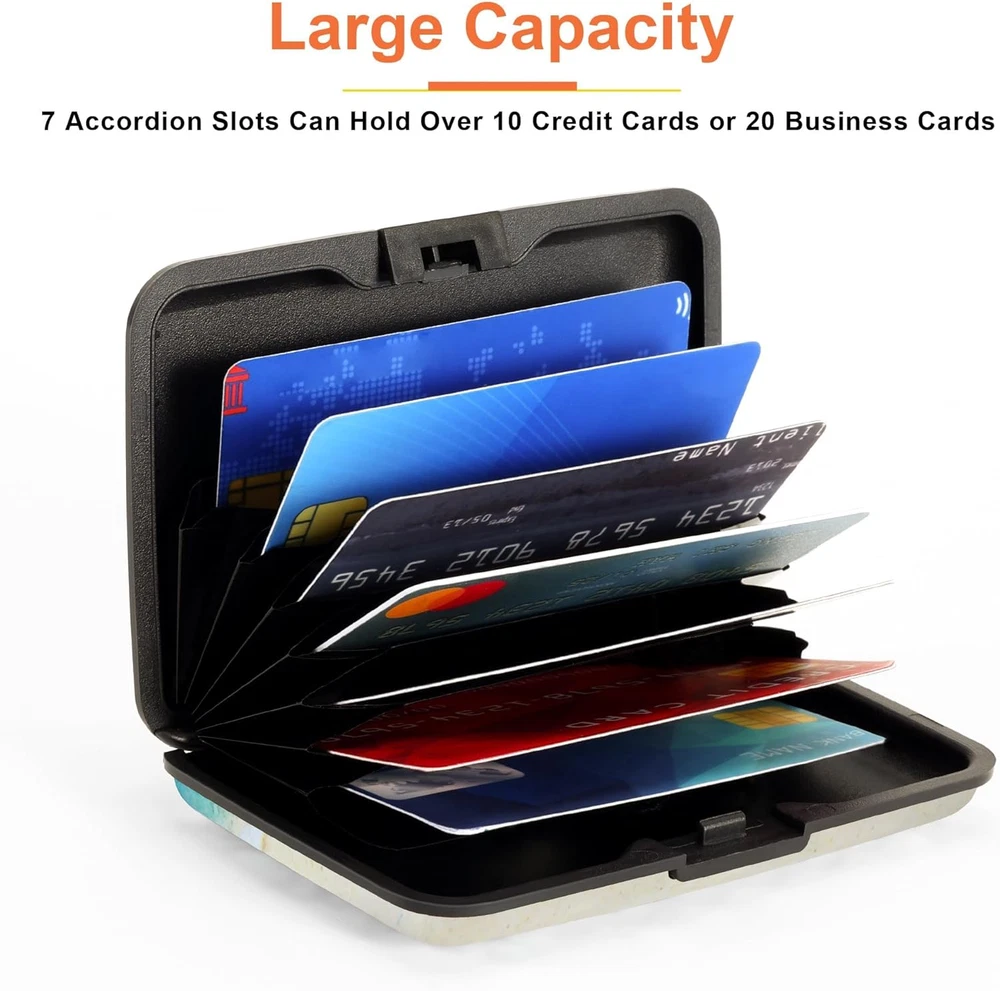 RFID-blocking: Our RFID card holder safeguards your cards from electronic theft, ensuring your personal information stays secure while you travel or go about your day Durable and Secure: Crafted from high-quality Aluminum Alloy, our credit card holder is built to last. Its secure closure ensures your cards are safe from falling out or getting damaged Ample Storage Capacity: With 7 accordion slots, this business card holder conveniently stores credit cards, IDs, and business cards, making it perfect for everyday use or travel Compact Design: This 4.3" X 2.7" X 0.8" credit card holder fits effortlessly into your pocket or bag, providing a minimalist solution that keeps your essentials organized without bulk Stylish and Versatile: Available in a variety of colors and styles, our credit card holder complements any outfit, making it a fashionable accessory for any occasion Product Description Card Holder Features Aluminum Alloy Hard Case Elegant Curved Border One-Touch Press