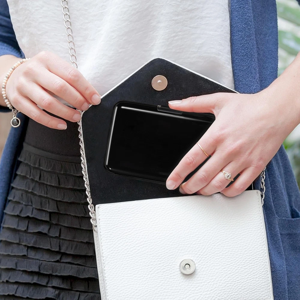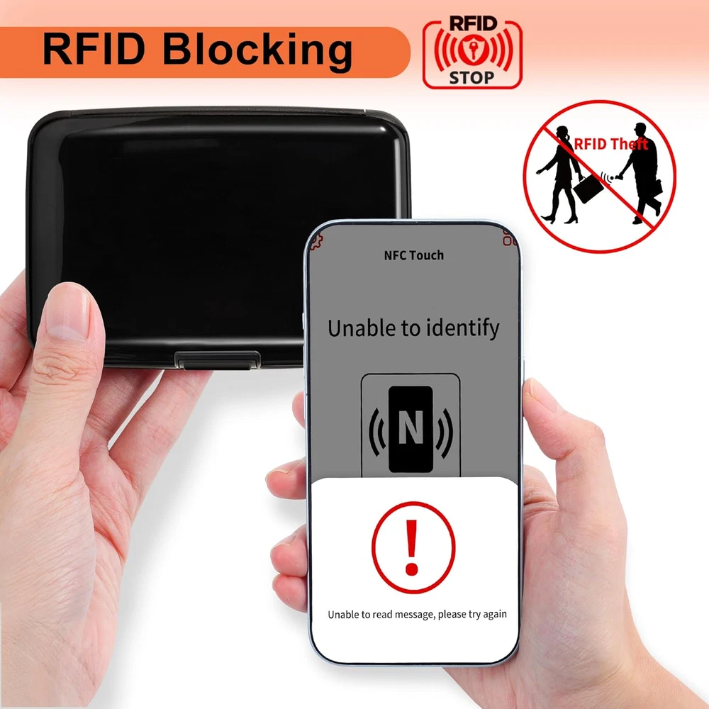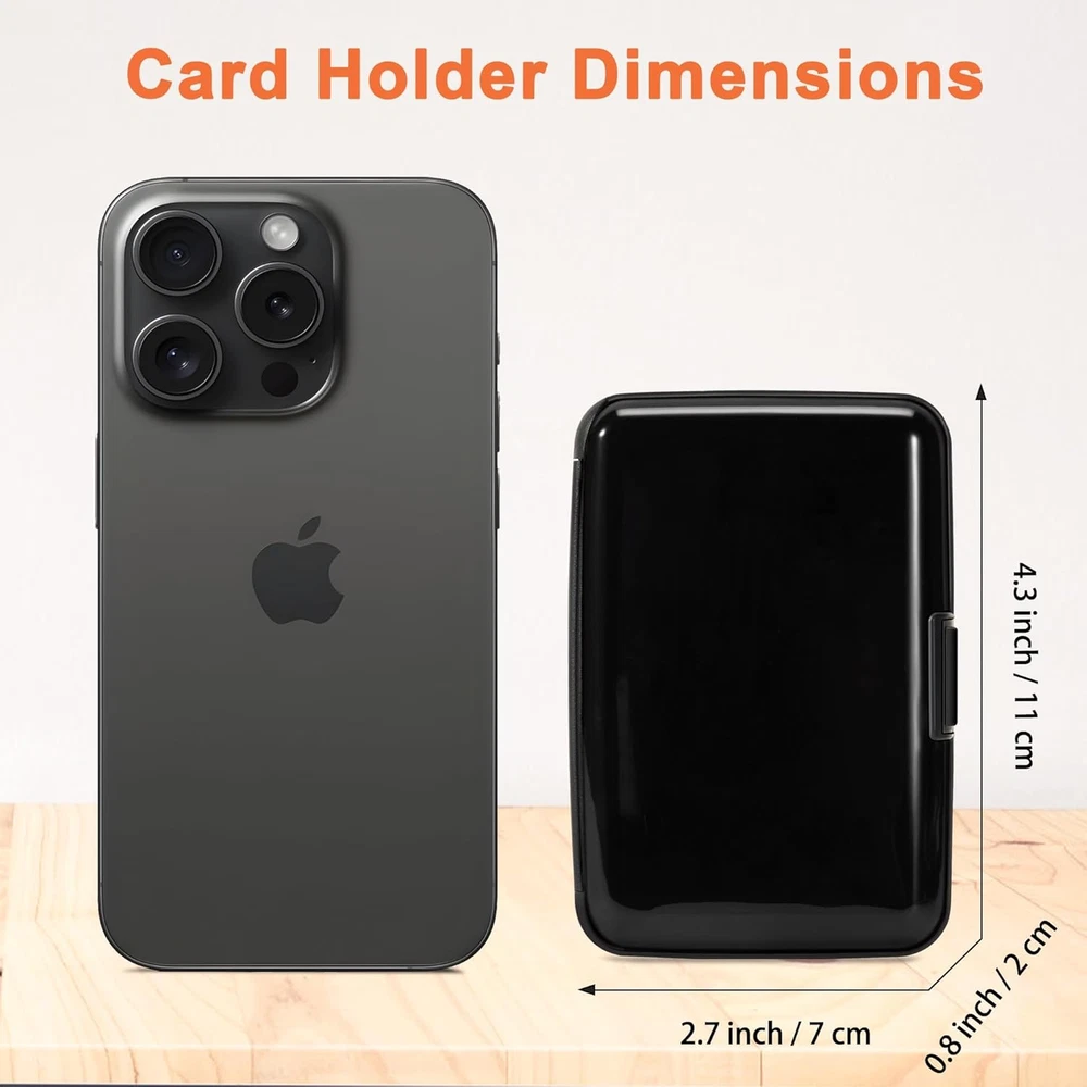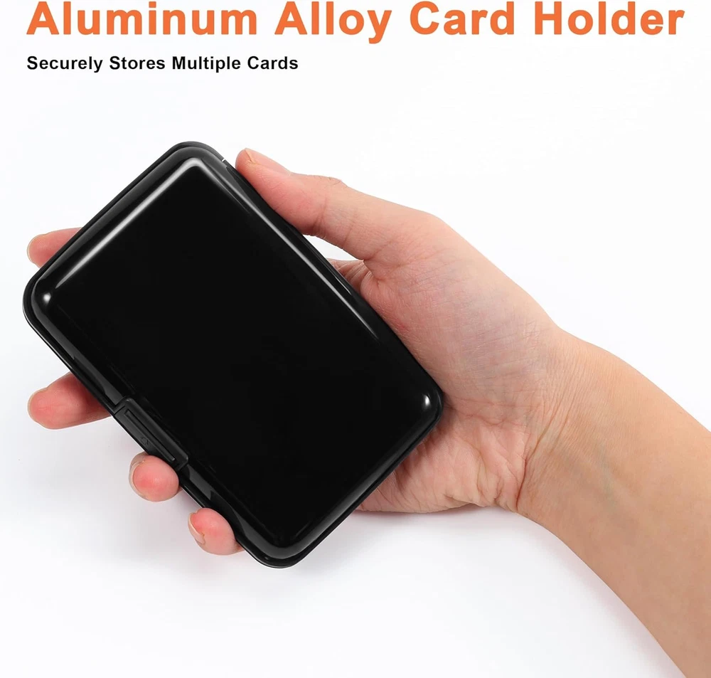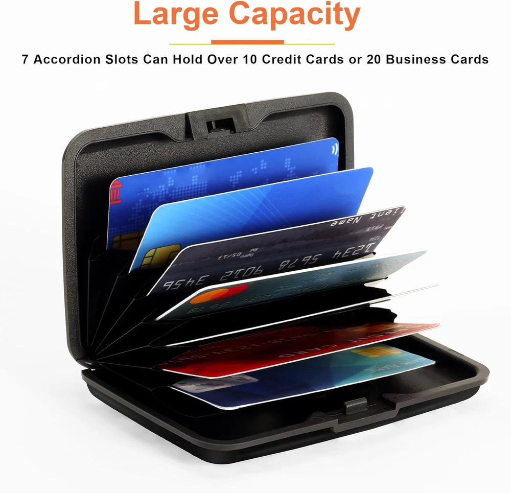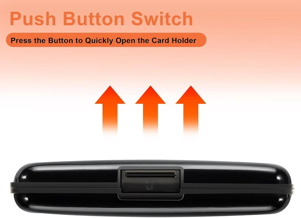 RFID-blocking: Our RFID card holder safeguards your cards from electronic theft, ensuring your personal information stays secure while you travel or go about your day Durable and Secure: Crafted from high-quality Aluminum Alloy, our credit card holder is built to last. Its secure closure ensures your cards are safe from falling out or getting damaged Ample Storage Capacity: With 7 accordion slots, this business card holder conveniently stores credit cards, IDs, and business cards, making it perfect for everyday use or travel Compact Design: This 4.3" X 2.7" X 0.8" credit card holder fits effortlessly into your pocket or bag, providing a minimalist solution that keeps your essentials organized without bulk Stylish and Versatile: Available in a variety of colors and styles, our credit card holder complements any outfit, making it a fashionable accessory for any occasion Product Description Card Holder Features Aluminum Alloy Hard Case Elegant Curved Border One-Touch Press