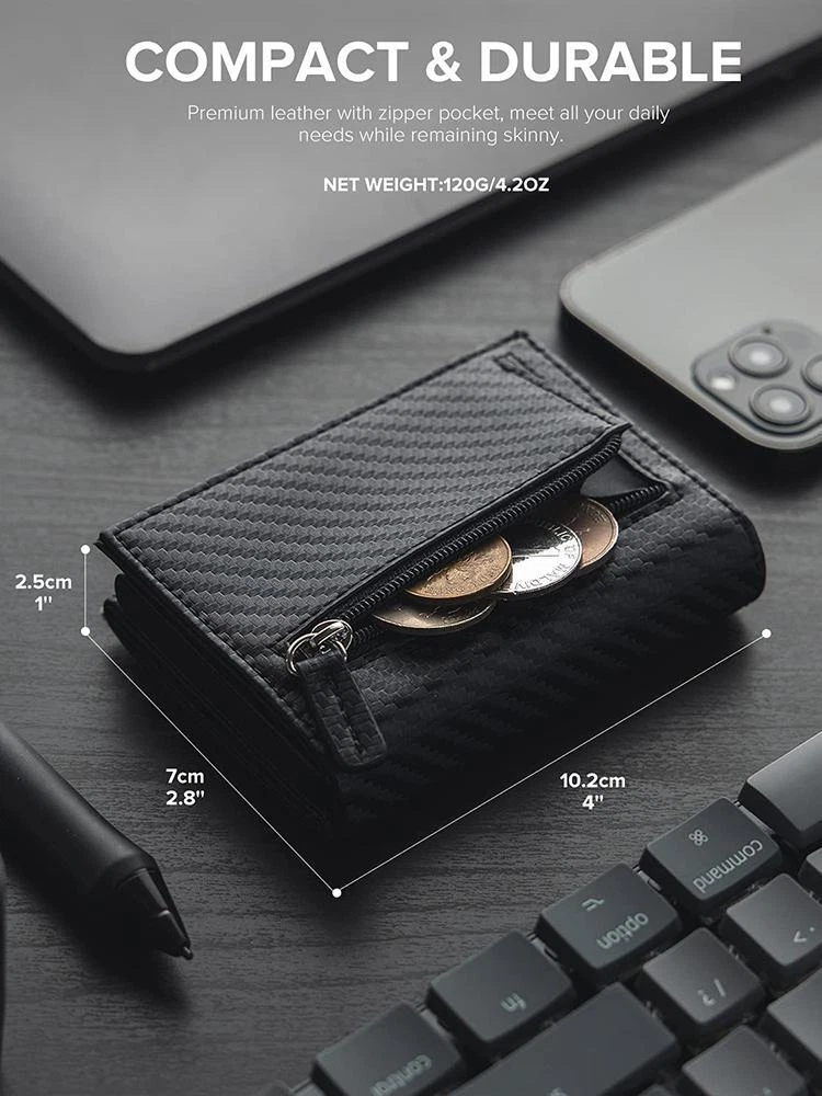 FREE SHIPPING 30 DAYS RETURN EASY PAYMENT via PayPal, PayPal Credit, Credit Card, Google Pay... Credit Card Holder Rfid Blocking Bifold Men's Wallet Coin Compartmen Banknote Multifunctional yet Compact Aluminum card case holds 5 cards, 4 additional card slots and 1 ID window, plus a zippered coin pocket and bill compartment, fits most global currencies such as GBP, EUR, USD, CAD and more. Handcrafted in soft leather with a magnetic strap closure, you can easily open and close the wallet. RFID/NFC Protection Advanced aluminium technology provide your cards best protection away from unauthorized RFID/NFC scans, and secure private property. With magnetic strap closure, you can open and close the wallet easily. SPACIOUS CAPACITY WITH PALM SIZE Size: 10.2 X 7 X 2.5 cm. Weight: 120 grams. There is a zippered coin pocket on the back where you can put some coins, keys and other small things. Quick Access Side slider mechanism allows you one-hand operation, the most efficient way to pop up all cards easily. REVIEWS The product came very well packaged. I'm very happy. thank you for everything. Seller strongly recommended. This is great! I definitely recommend! Product looks amazing Delivery was fast. Excellent seller, great communication. I advise everyone to buy it!
