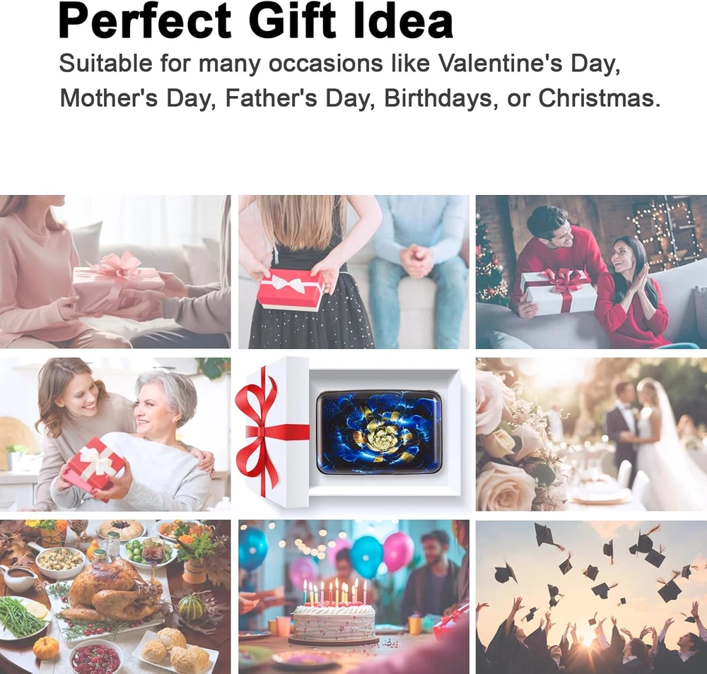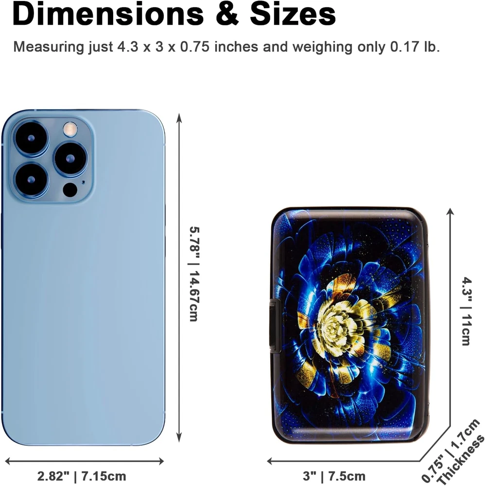 Discover a blend of security and style with the Kaabao wallet holder. This slim, compact, metal card protector encased in hard aluminum and plastic(ABS) shell, safeguards your credit, debit, and ID cards with RFID blocking technology. Its thin, small size of 4.3 x 3 x 0.86 inches slides into your front pocket or purse, ideal for travel. The clasp closure opens to reveal 7 accordion slots, with a capacity to hold 7-10 cards or over 20 business cards, keeping them safe, secure, and organized. The aluma shell, adorned with artistic prints, reflects a minimalist yet protective design, making it a perfect gift for both men and women. Experience a safe, anti-theft pocket organizer that doesn't compromise on aesthetic appeal.