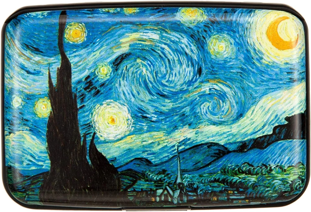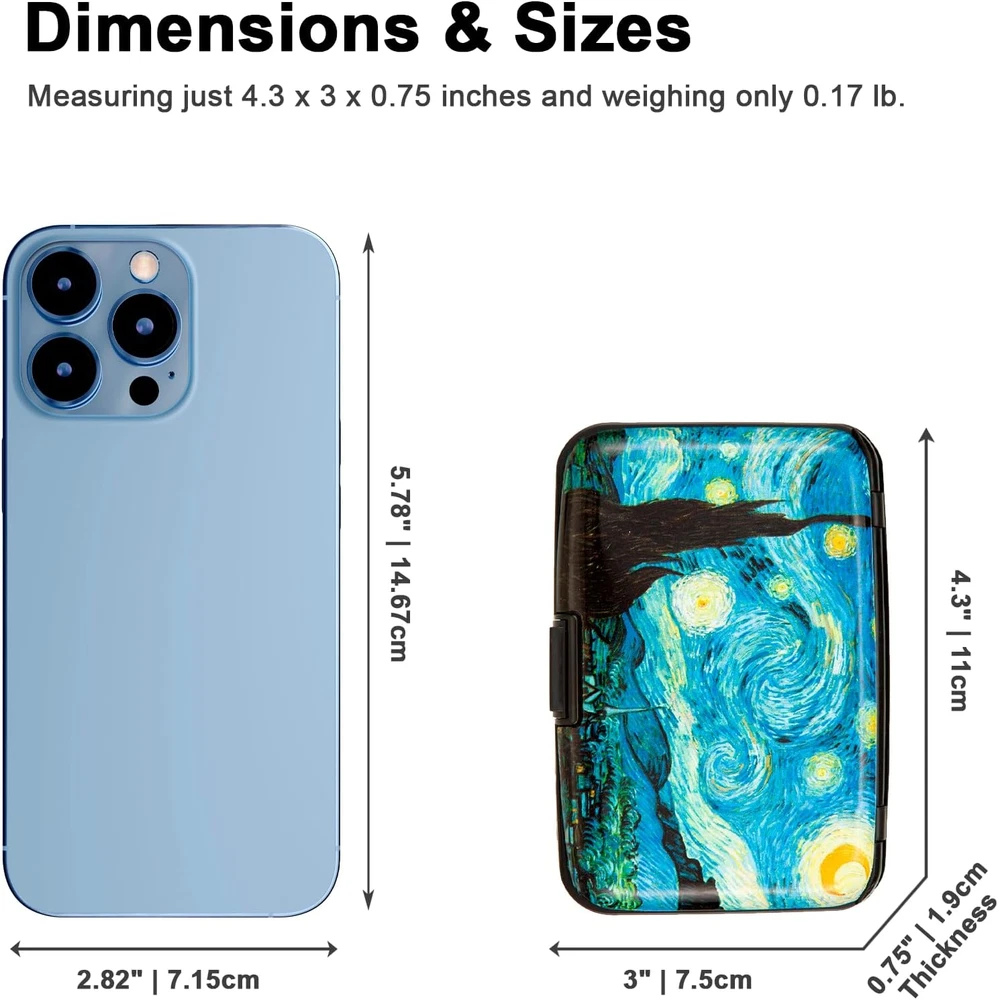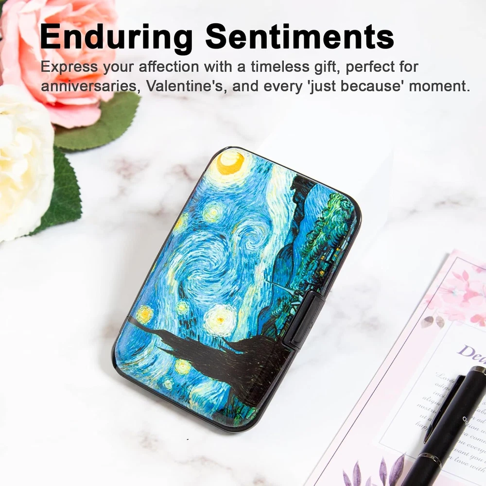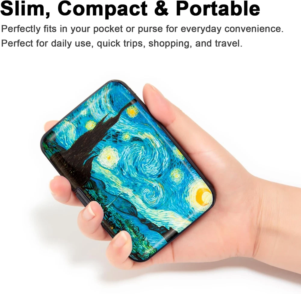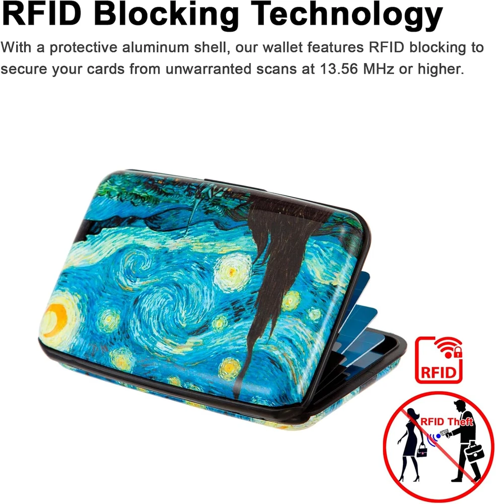 Discover a blend of security and style with the Kaabao wallet holder. This slim, compact, metal card protector encased in hard aluminum and plastic(ABS) shell, safeguards your credit, debit, and ID cards with RFID blocking technology. Its thin, small size of 4.3 x 3 x 0.86 inches slides into your front pocket or purse, ideal for travel. The clasp closure opens to reveal 7 accordion slots, with a capacity to hold 7-10 cards or over 20 business cards, keeping them safe, secure, and organized. The aluma shell, adorned with artistic prints, reflects a minimalist yet protective design, making it a perfect gift for both men and women. Experience a safe, anti-theft pocket organizer that doesn't compromise on aesthetic appeal.