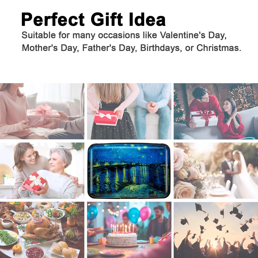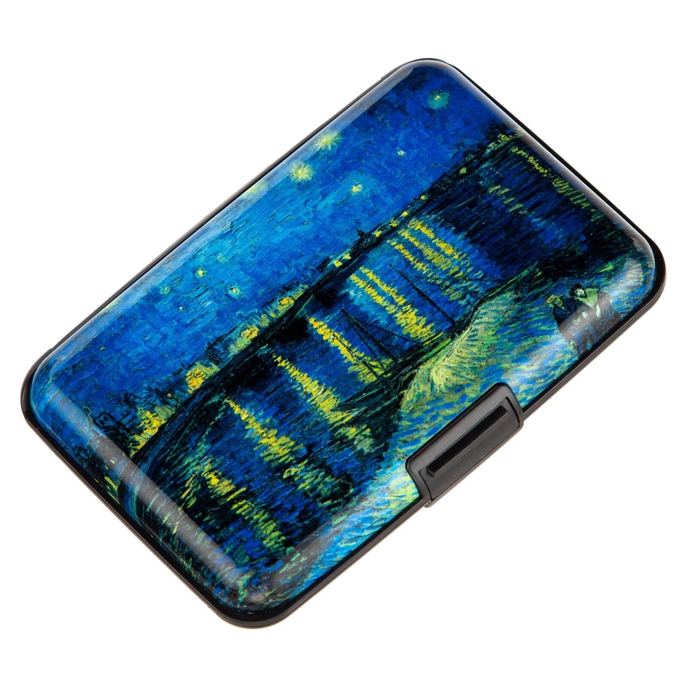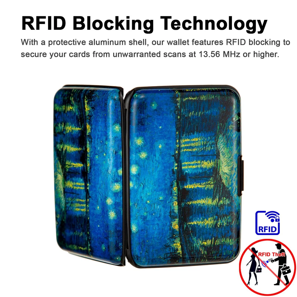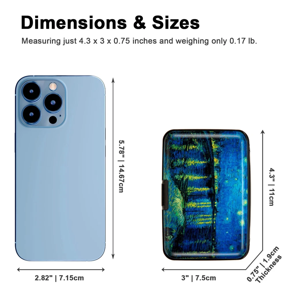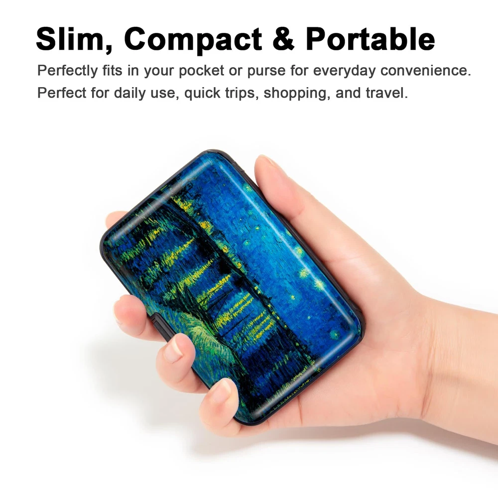 Description Discover a blend of security and style with the wallet holder. This slim, compact, metal card protector encased in hard aluminum and plastic(ABS) shell, safeguards your credit, debit, and ID cards with RFID blocking technology. Its thin, small size of 4.3 x 3 x 0.86 inches slides into your front pocket or purse, ideal for travel. The clasp closure opens to reveal 7 accordion slots, with a capacity to hold 7-10 cards or over 20 business cards, keeping them safe, secure, and organized. The aluma shell, adorned with artistic prints, reflects a minimalist yet protective design, making it a perfect gift for both men and women. Experience a safe, anti-theft pocket organizer that doesn't compromise on aesthetic appeal.
