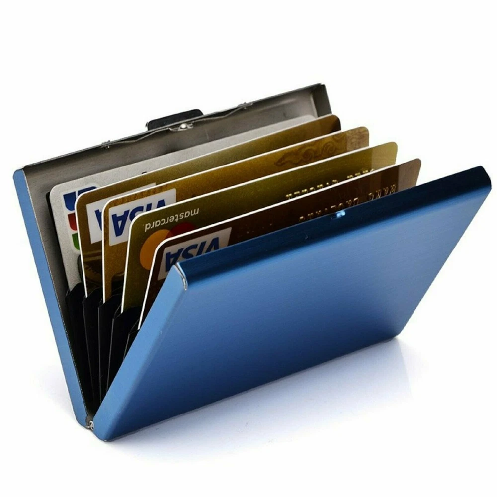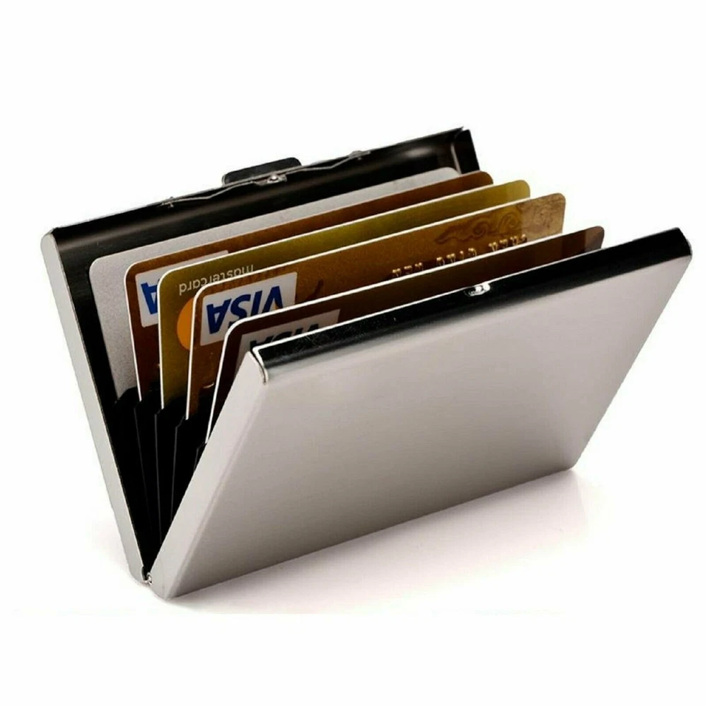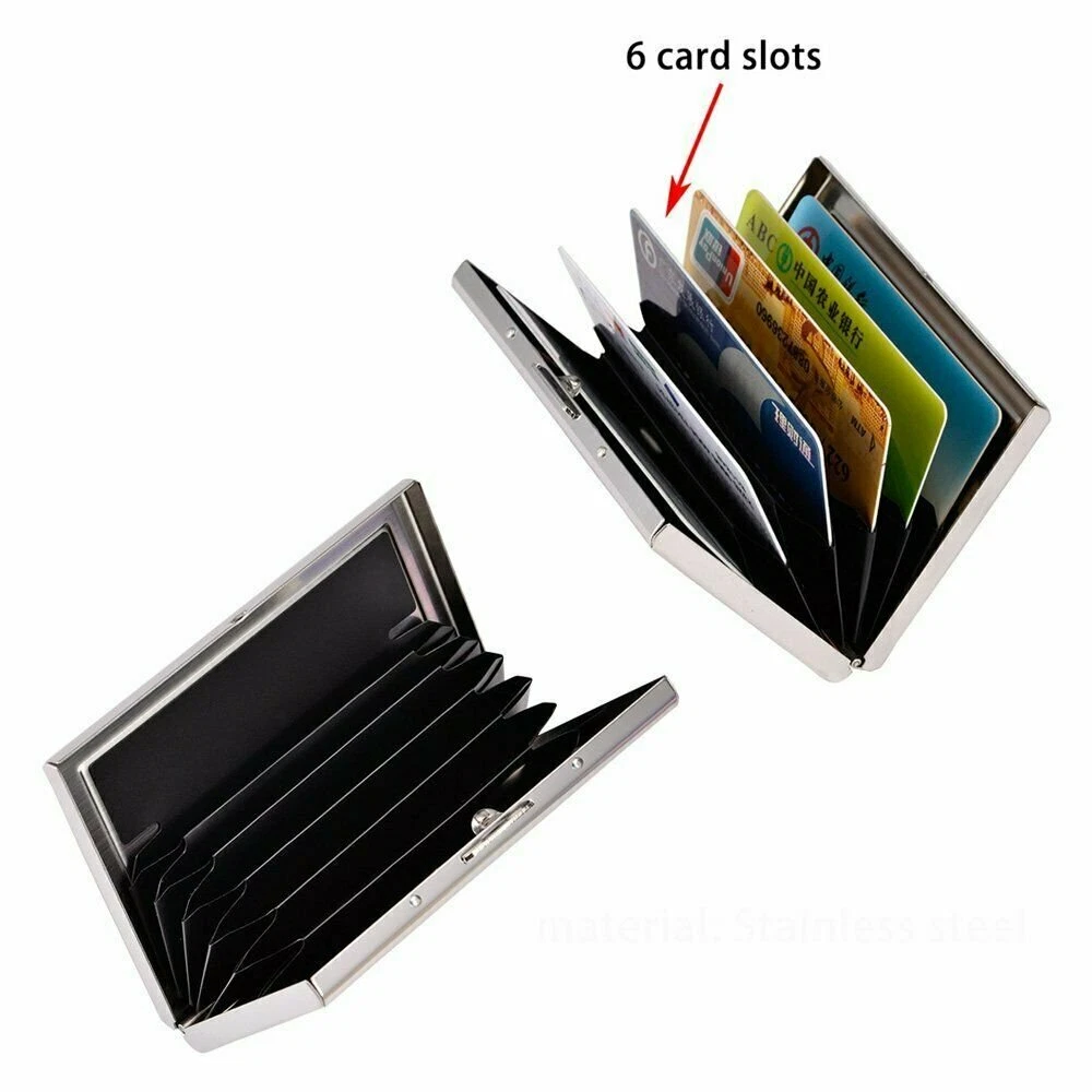 Stainless Steel RFID Blocking Credit Card ID Holder Slim Money Travel Wallet High-quality with smooth to the touch stainless steel Enough space to protect up to six cards Safe wallet blocks the invasive RFID signals from crooks' scanners Stainless Steel Card Holder Case for Travel and Work, Steel Metal Slim Wallet , Credit Card Case for Business Cards, Credit Cards, and Driver License. Security latch locks up tight to keep your cards safe from water, weather & scanning thieves.