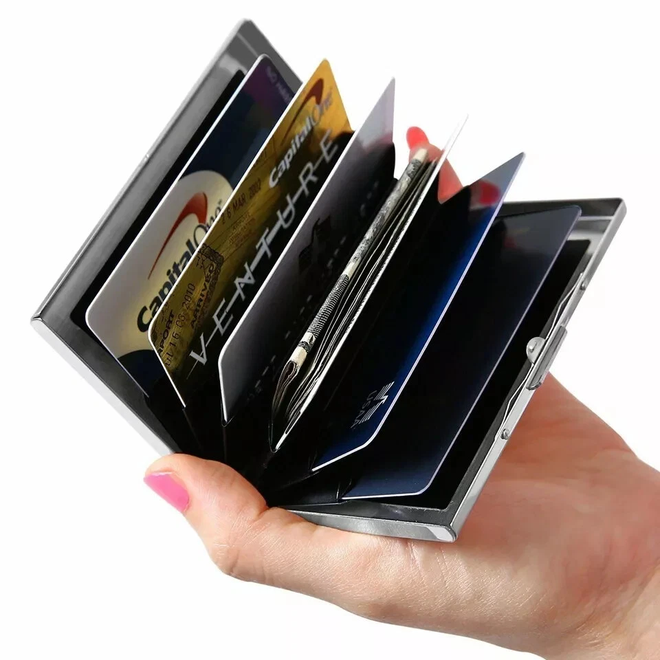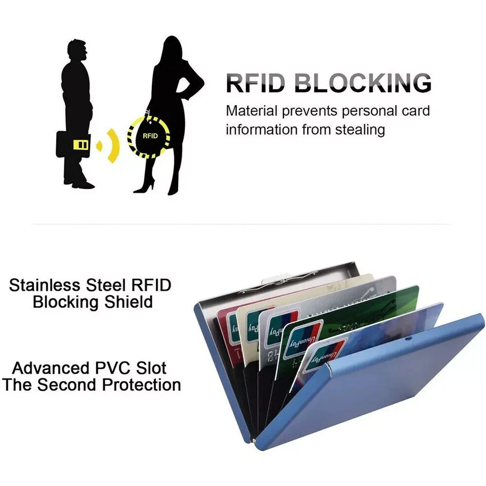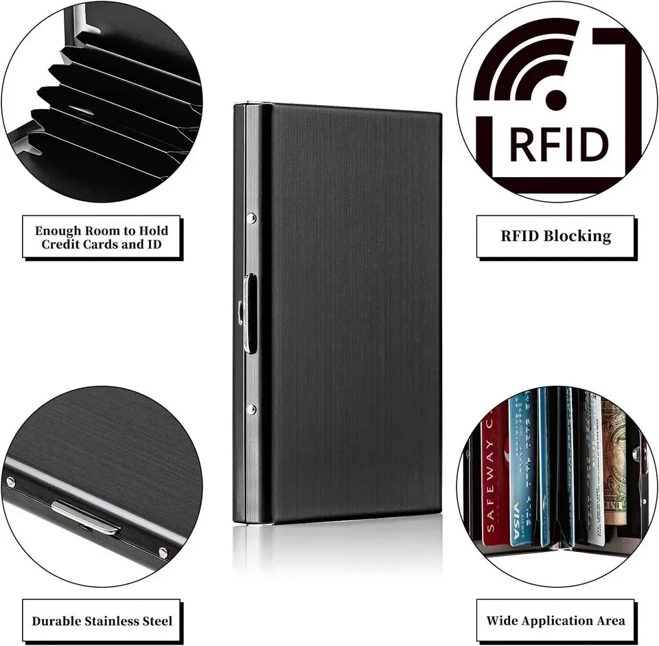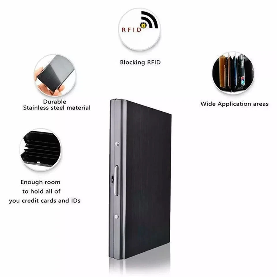 Men Stainless Steel RFID Blocking Credit Card ID Holder Slim Money Travel Wallet Fast And Free Shipping USA Seller Same Day Dispatched Credit Card ID Holder Slim Money Travel Wallet Men Stainless Steel RFID Blocking About this product High-quality with smooth to the touch stainless steel. RFID Blocking Credit Card Holders are enough space to protect up to six cards. This RFID Blocking Credit Card Holder has Security latch locks up tight to keep your cards safe from water, weather & scanning thieves. Safe wallet blocks the invasive RFID signals from crooks' scanners while maintaining a smart-looking stainless steel finish. Stainless Steel Card Holder Case for Travel and Work, Steel Metal Slim Wallet , Credit Card Case for Business Cards, Credit Cards, and Driver License. Description Credit Card ID Holder Slim Money Travel Wallet Men Stainless Steel RFID Blocking - US ShippingProduct Specifications:Item Type: Card & ID HoldersItem Weight: 2.68ozCapacity: Can hold up to 6 Standard Credit Cards/IDsMain Material: MetallicGender: UnisexUse: Credit CardItem Width: 6.5 cmPattern Type: SolidShape: Box Material Composition: stainless steelItem Length: 9.5 cmProduct Detail:RFID Blocking Credit Card Holder High-quality with smooth to the touch stainless steel.RFID Blocking Credit Card Holder are enough space to protect up to six cards.This RFID Blocking Credit Card Holder has Security latch locks up tight to keep your cards safe from water, weather & scanning thieves.Safe wallet blocks the invasive RFID signals from crooks' scanners while maintaining a smart-looking stainless steel finish.Stainless Steel Card Holder Case for Travel and Work, Steel Metal Slim Wallet , Credit Card Case for Business Cards, Credit Cards, and Driver License. Slim Stainless Steel Credit Card Holder RFID Wallet for Men and Women Best RFID Blocking Wallet for Men and Women. Stainless Steel Metal Cover to protect cards against water, rain, dust, scratches. High-quality, smooth-to-the-touch stainless steel, Fashion Glassy Black Metal finish. Top Stainless Steel Metal Slim Wallets, Security latch locks up tight to keep your cards safe from water, weather & scanning thieves. Safe and Secure Protection for Travel and Work, Includes Inserts for credit cards, business cards, and driver's license, Security in your pocket. RFID Blocking Credit Card Holder Travel Wallet, Snap closure, Stainless Steel Fast and Free US Shipping with Tracking: After cleared payment, most orders are shipped within one business day from Cape Coral, FL USA, (excludes weekends and holidays) with standard shipping and tracking number. Tracking information will be automatically uploaded as soon as the item has been shipped. Please make sure to provide the correct shipping address during checkout, as the address cannot be changed after checkout. Contact us: Customer satisfaction is very important to us, we are always about providing quick and efficient service.If you have any questions or concerns, please feel free to ask questions we are always happy to answer. Men Stainless Steel RFID Blocking Credit Card ID Holder Slim Money Travel Wallet