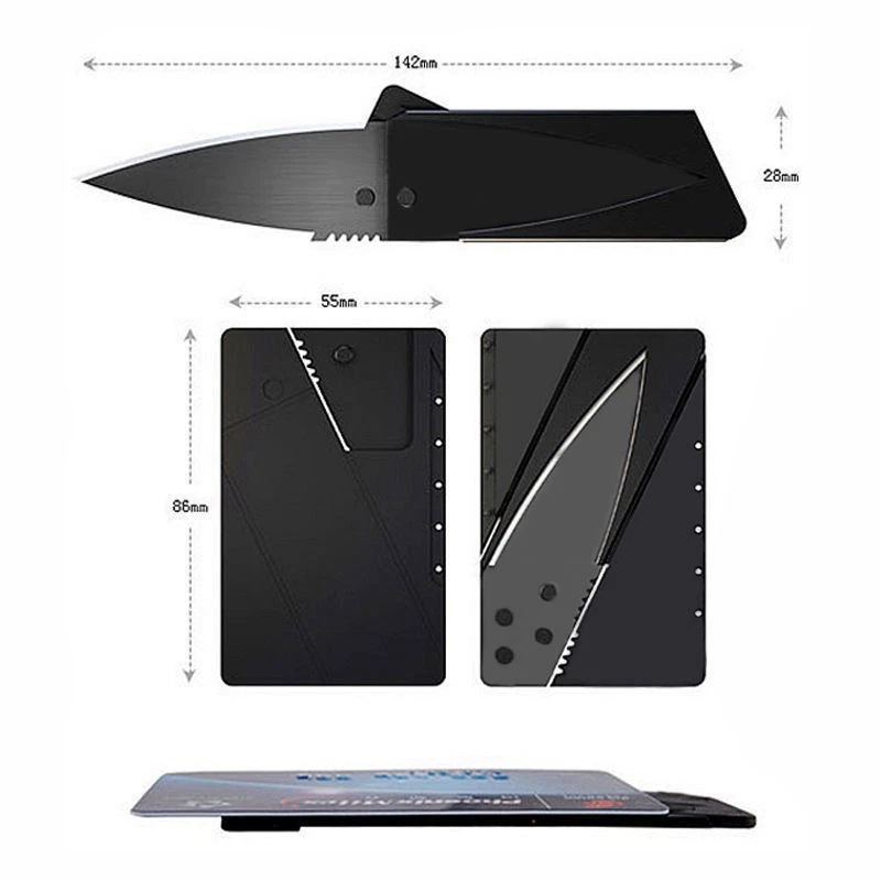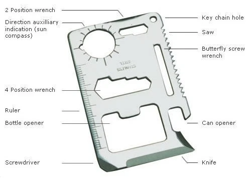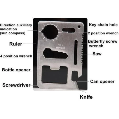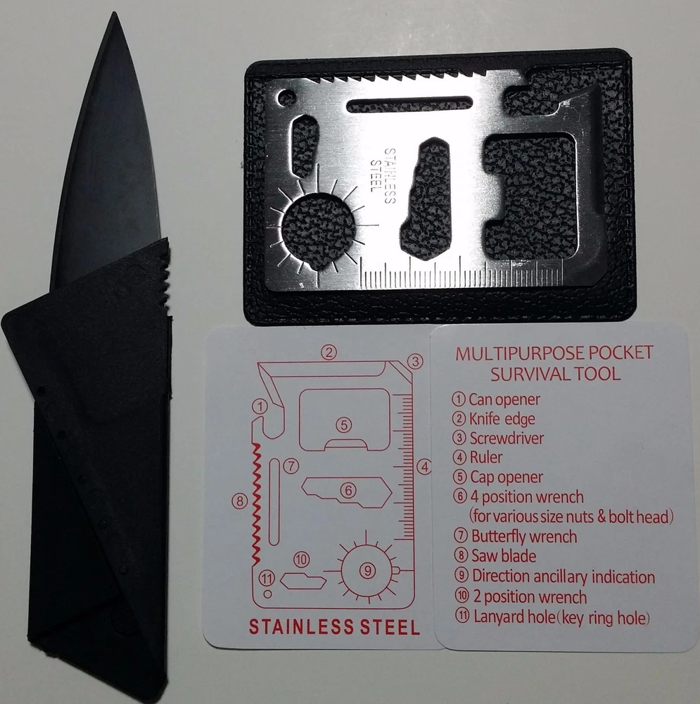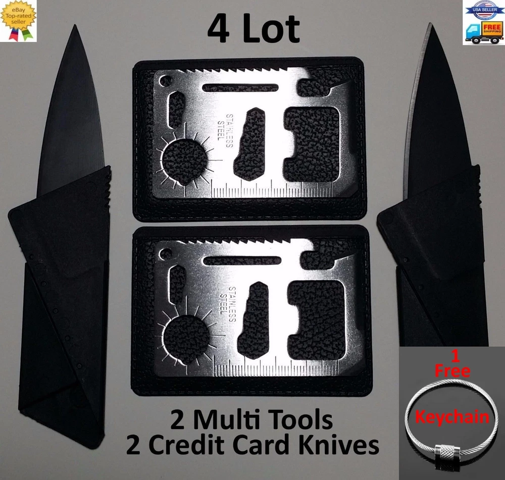 Credit Card Knives Knife Kit Includes: (2) black folding Credit Card Knives, (2) 11in1 Multi Tools and (1) FREE Stainless Steel Key Ring. (2) Piece Credit Card Knives : New and improved super-lightweight and super-sharp. Each knife comes individually wrapped for retail sales. This little knife fits neatly inside your wallet, purse, backpack, tackle box, and emergency kits. Never be without a knife again. (2) Piece 11 in 1 multi tools , 11 functions in one card tool. This little stainless steel tool is a bit smaller than a credit card and includes a black carrying pouch. Great carry for your wallet, purse, or pocket. Great tool to keep in your car, truck, boat, tackle box, atv, office desk, and kitchen. (1) Free Stainless Steel Key ring. 11 IN 1 MULTI TOOL BOTTLE OPENER BUTTERFLY SCREW WRENCH KEY CHAIN HOLE KNIFE EDGE RULER SCREWDRIVER CAN OPENER POSITION WRENCH SAW BLADE DIRECTIONAL AUXILIARY INDICATOR 2 POSITION WRENCH SHIPS THE SAME BUSINESS DAY US SELLER FREE SHIPPING Please see my store for Bulk Quantity/Wholesale Listings THANK YOU.