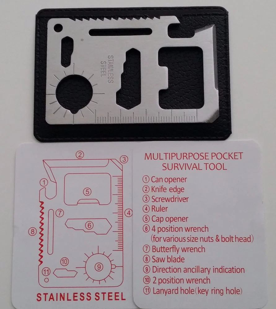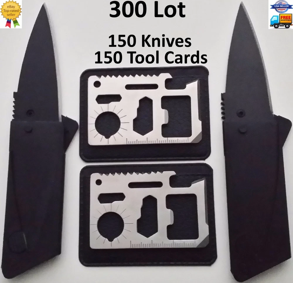 Credit Card Knives 11 in 1 Multi Tool 300 LOT. Includes (150) Pieces folding credit card knives and (150) Pieces 11 in 1 Tools. (150) Piece Credit Card Knives: New and improved super-lightweight and super-sharp. Each knife comes individually wrapped for retail sales.This little knife fits neatly inside your wallet, purse, backpack, tackle box, and emergency kits. Never be without a knife again. THESE KNIVES ARE OF GOOD QUALITY. LOWER PRICE CAN MEAN LOWER QUALITY, I DO NOT SELL THE LOW QUALITY ONES. (150) Piece 11 in 1 multi tools: 11 functions in one card tool. This little stainless steel tool is a bit smaller than a credit card and includes a black carrying pouch. Great carry for your wallet, purse, or pocket. Great tool to keep in your car, truck, boat, tackle box, atv, office desk, and kitchen. TOTAL OF 300 PIECE Lot which includes 150 Knives and 150 Multi Tools. 11 IN 1 MULTI TOOL BOTTLE OPENER BUTTERFLY SCREW WRENCH KEY CHAIN HOLE KNIFE EDGE RULER SCREWDRIVER CAN OPENER POSITION WRENCH SAW BLADE DIRECTIONAL AUXILIARY INDICATOR 2 POSITION WRENCH Ships same day from Birmingham Al. if purchased on business days by 1:00 PM ~ Eastern Standard Time SHIPS THE SAME BUSINESS DAY US SELLER FREE SHIPPING THANK YOU.