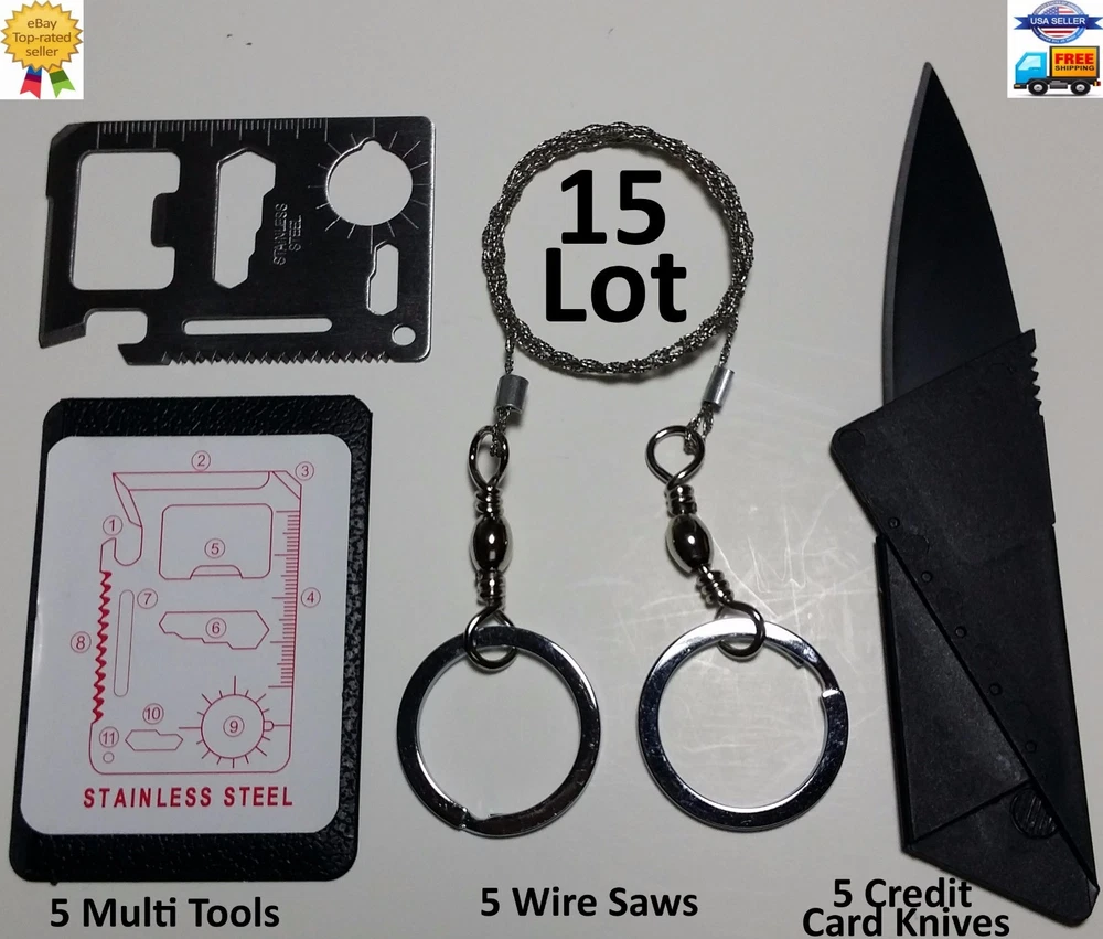 Credit Card Knives 11 in 1 Multi tools Wire Saw wallet thin pocket survival micro Kit. 15 Piece Lot Includes: (5) Piece Credit Card Knifes. New and improved super-lightweight. Knife comes individually wrapped for Retail Sales. This little knife fits neatly inside your wallet, purse, backpack, tackle box, office desk, and emergency kit. Great around the house for cooking, gardening, and opening packages. Never be without a knife again. (5) Piece 11 in 1 Multi Tool Cards (5) Piece Stainless Steel Wire Saws SHIPS THE SAME BUSINESS DAY. US SELLER FREE SHIPPING. THANK YOU.