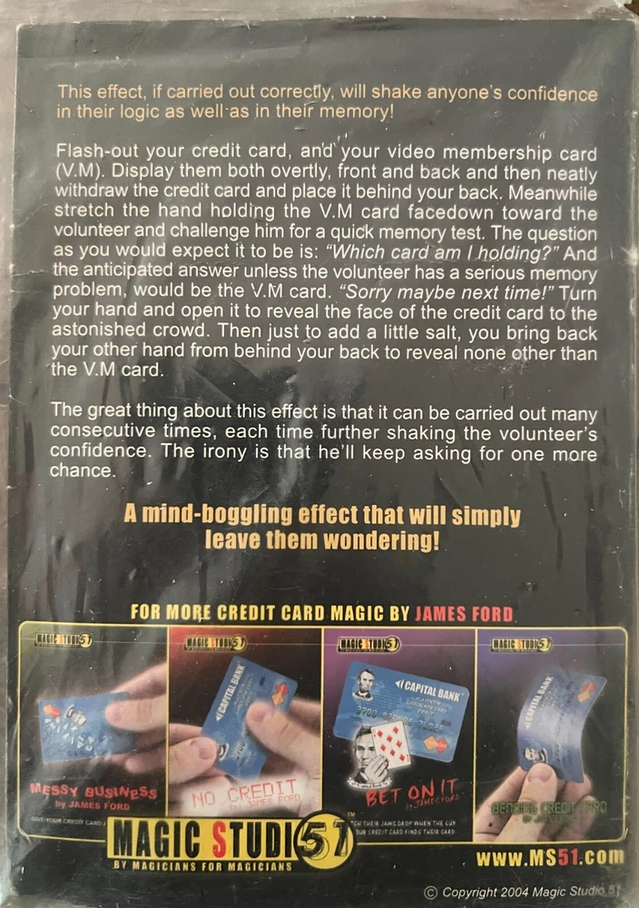 Effect This effect, if carried out correctly, will shake anyone's confidence in their logic as well as in their memory! Flash-out your credit card, and your video membership card(V.M.) Display them both overtly, front and back and then neatly withdraw the credit card and place it behind your back. Meanwhile stretch the hand holding the V.M. card facedown toward the volunteer and challenge him for a quick memory test. The question is as you would expect it to be is;"Which Card am I holding?" And the anticipated answer unless the volunteer has a serious memory problem, would be the V.M. card. "Sorry maybe next time!" Turn your hand and open it to reveal the face of the credit card to the astonished crowd. Then just to add a little salt, you bring back your other hand from behind your back to reveal none other than the V.M. card. The great thing about this effect is that it can be carried out many consecutive times, each time further shaking the volunteer's confidence. The irony is that he'll keep asking for one more chance. This item has long been out of print and an excellent wallet/pocket miracle.