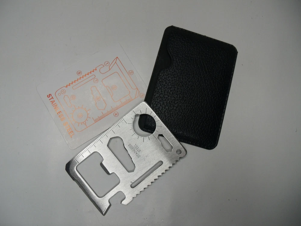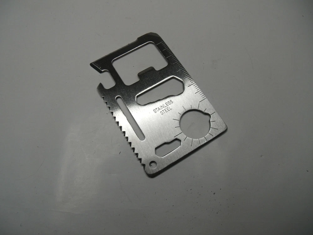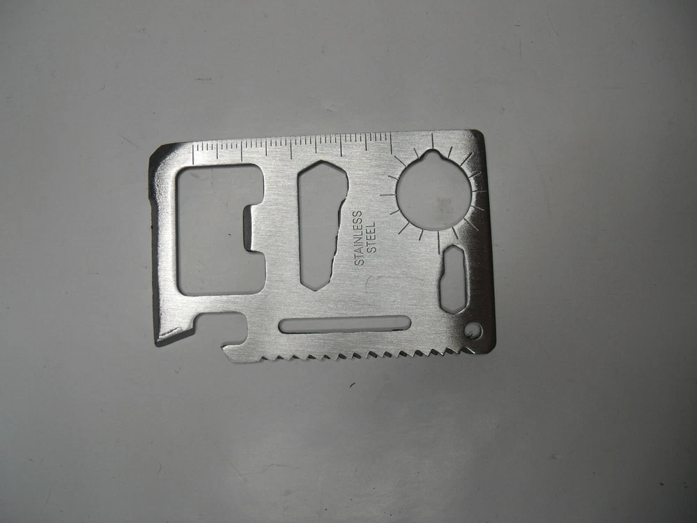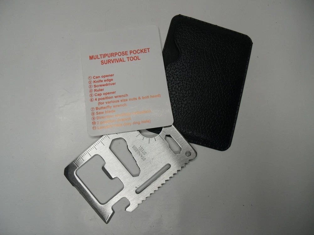 Stainless Steel Multi-Tool 10 tools in One Fits in your wallet (Don’t try to take on an airplane) Measures 2.75” x 1.75” Can opener Knife edge Screwdriver Ruler Cap opener 4 Position wrench Butterfly wrench Saw blade Direction ancillary indication 2 position wrench Lanyard hole (key ring hole) Vinyl pouch Data sheet 21103 6b3