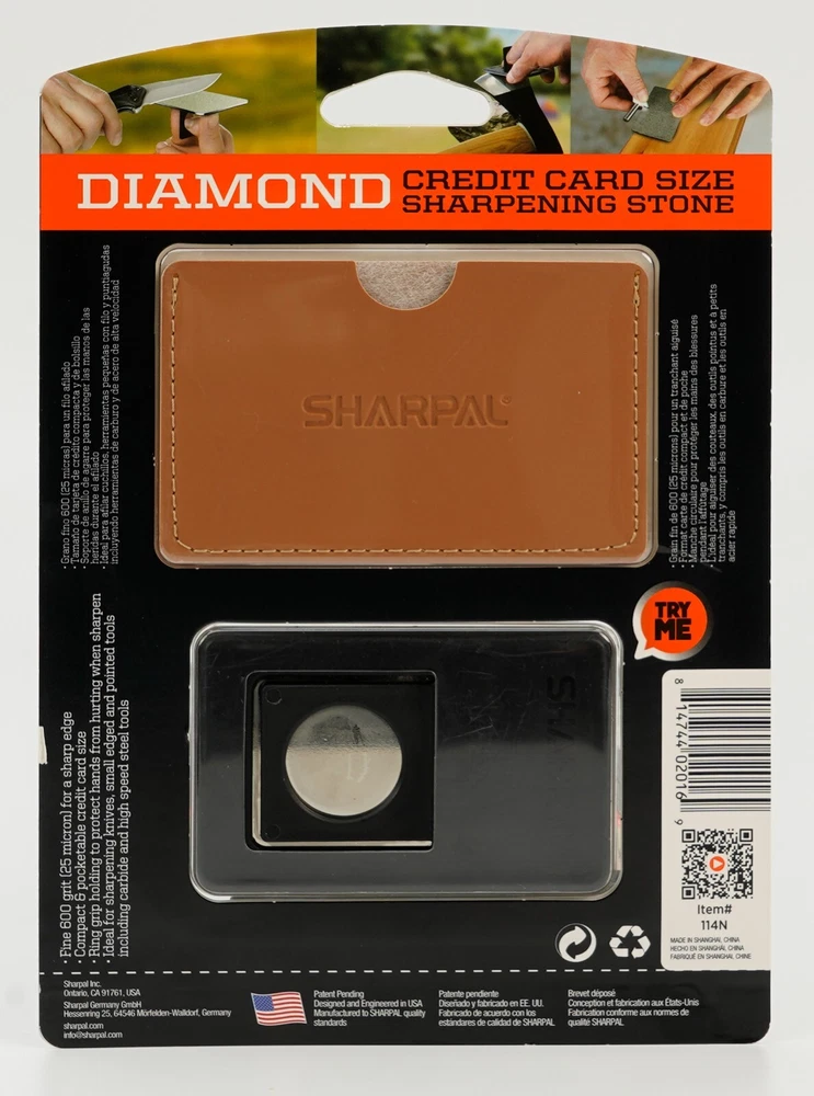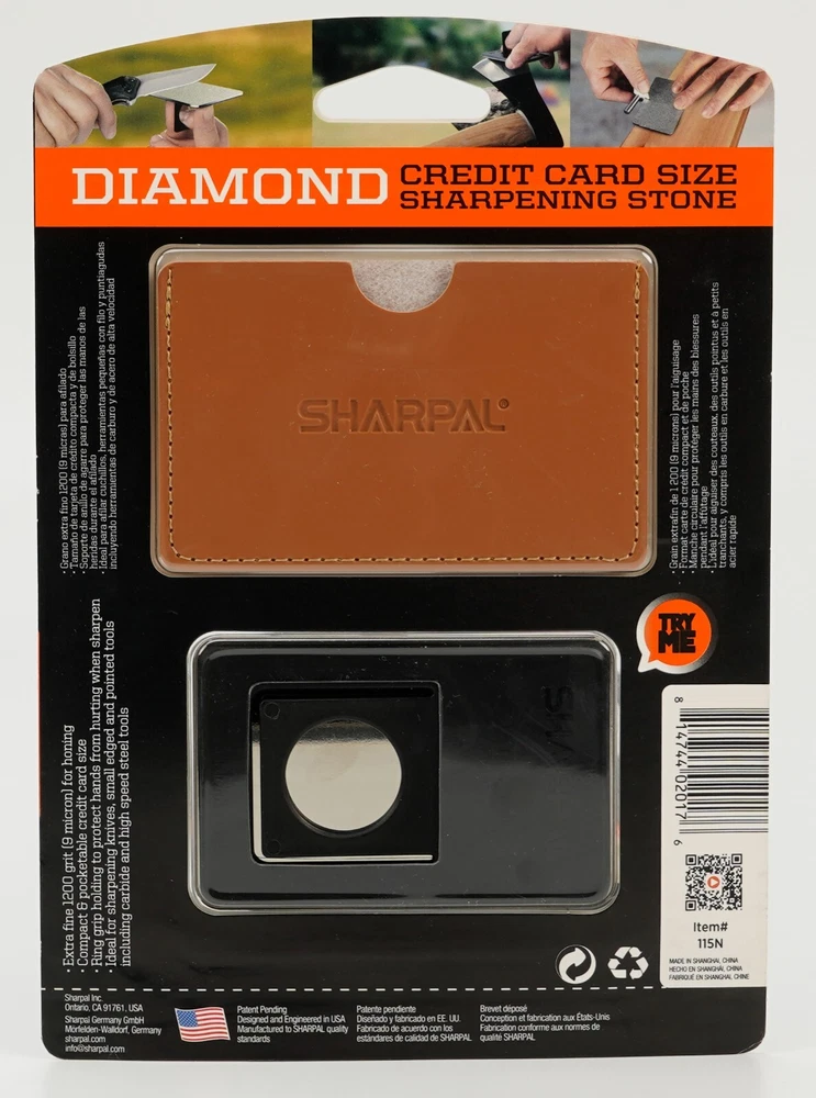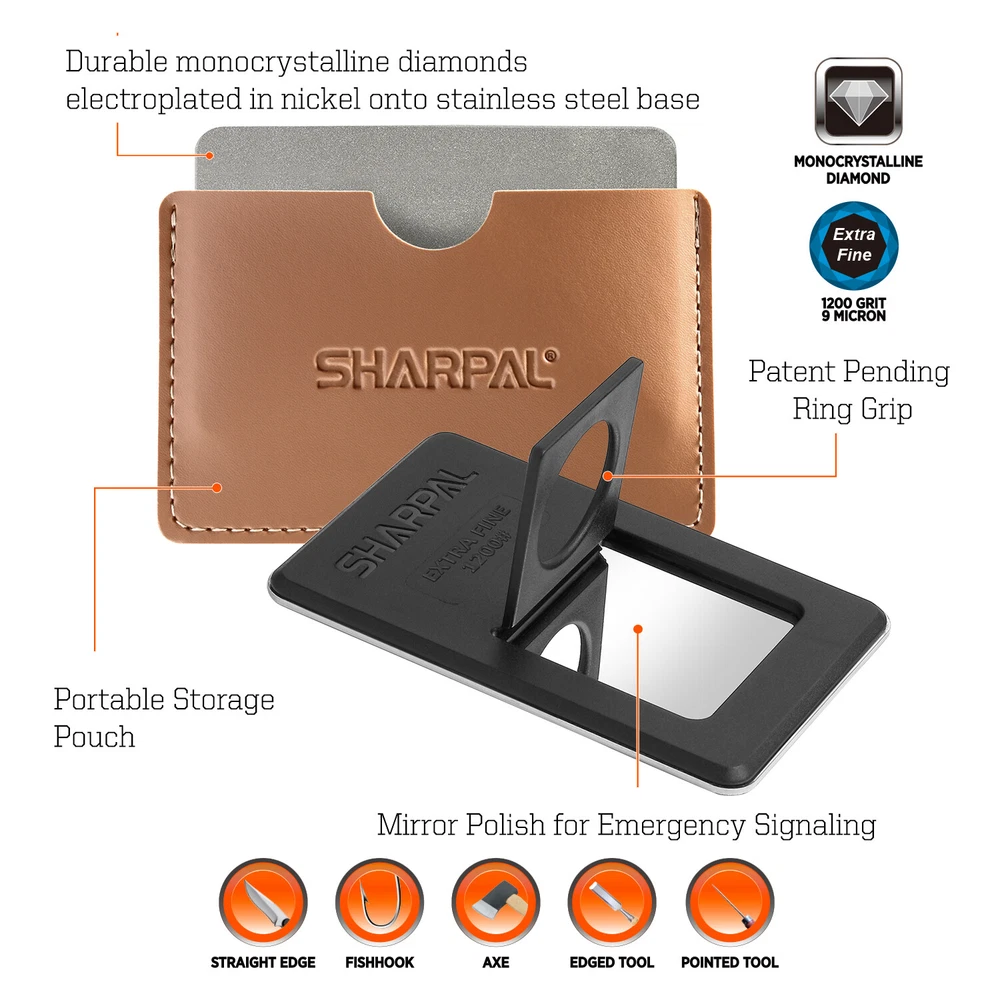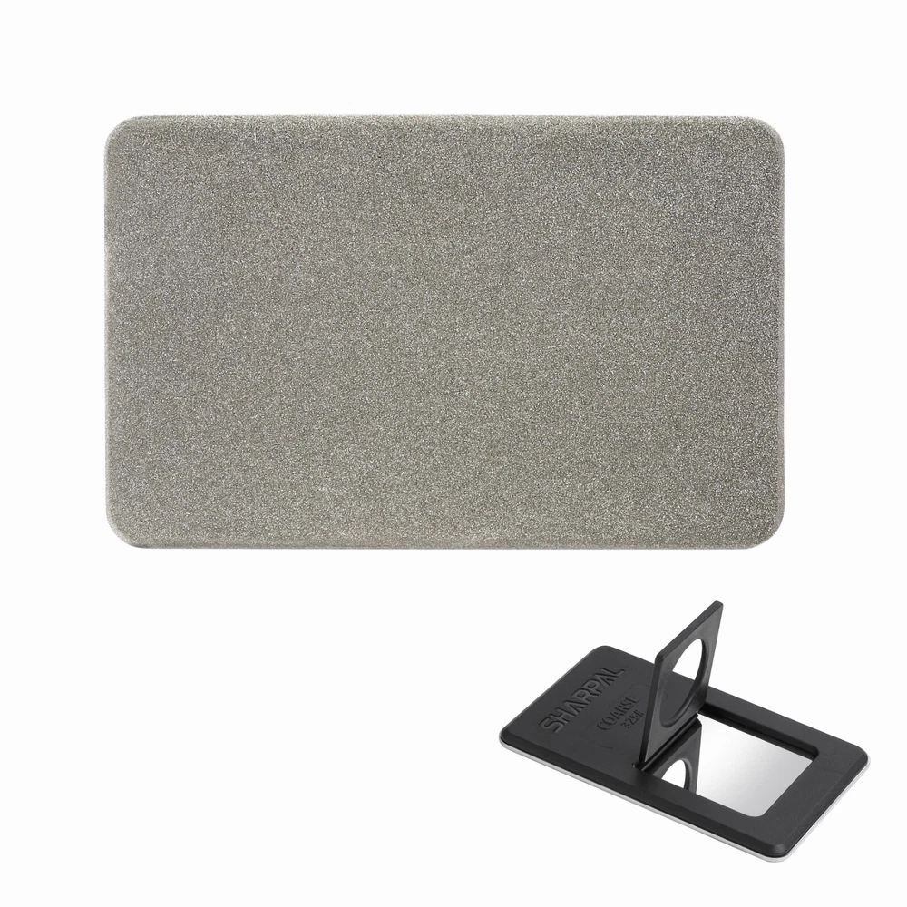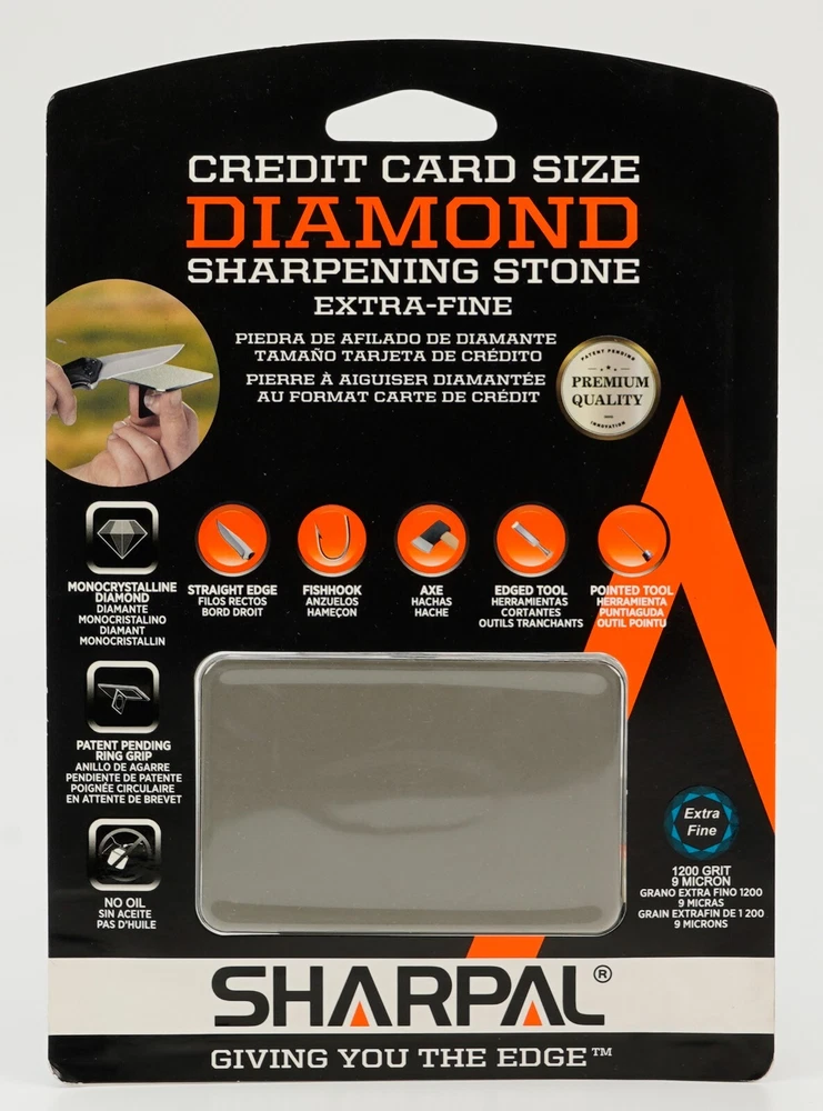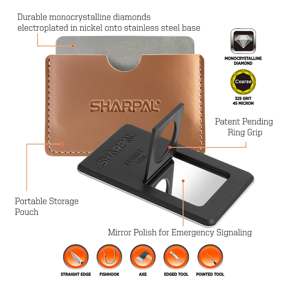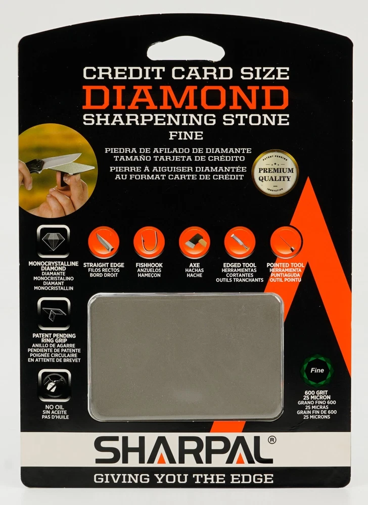 Product Description About SHARPAL Sharpal Inc. is a leading manufacturer of professional and patented multifunction knife and tool sharpeners for the outdoor and sports, garden and workshop, and culinary and kitchen industries. For more than 24 years we have been passionately researching and developing quality products, which provide consumers with an easy and cost-effective way to obtain a sharp edge. SHARPAL Diamond Sharpener-the fastest and most effective way to sharpen an edge! Use and Care There is a ‘break-in’ period for diamond sharpeners. When first use, the surface will appear to be especially rough. This roughness is due to the final manufacturing process and will be removed over time without impacting performance. As the diamond surface wears down, more and more diamond grits are exposed and the sharpener cuts faster. Sharpen dry. No messy oil needed Initial break-in Coarse 325 grit (45 micron) for quick edge setting Fine 600 grit (25 micron) for a sharp edge Extra fine 1200 grit (9 micron) for honing Clean surface and wipe DRY after use Store DRY Key Features Patent Pending Ring Grip Ring grip holding to protect hands from hurting when sharpen Credit Card Size It measures L 3 1/4-inch x W 2 1/8-inch x D .14-inch. and it weighs only 2.2 ounce. Storage Pouch Each with storage pouch for easy carrying. Stainless Steel Body Durable stainless steel construction for years of dependable use. Varied Uses Straight Knife Edge (Including Ceramic Knife) Pocket Knives Hunting Knives Fillet Knives Tactical Knives Chef’s Knives Camp and Garden Tools Axe Hatchet Machete Mower Blade Spade Shears Fishhooks Varied size of hooks Other Edged Tools and Pointed Tools Chisels Router Bit Drills Carbide, high speed steel, titanium, ceramics and most of super hard material