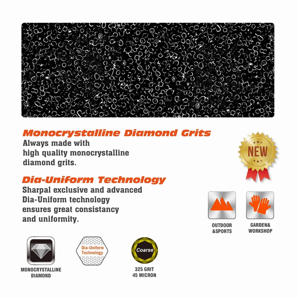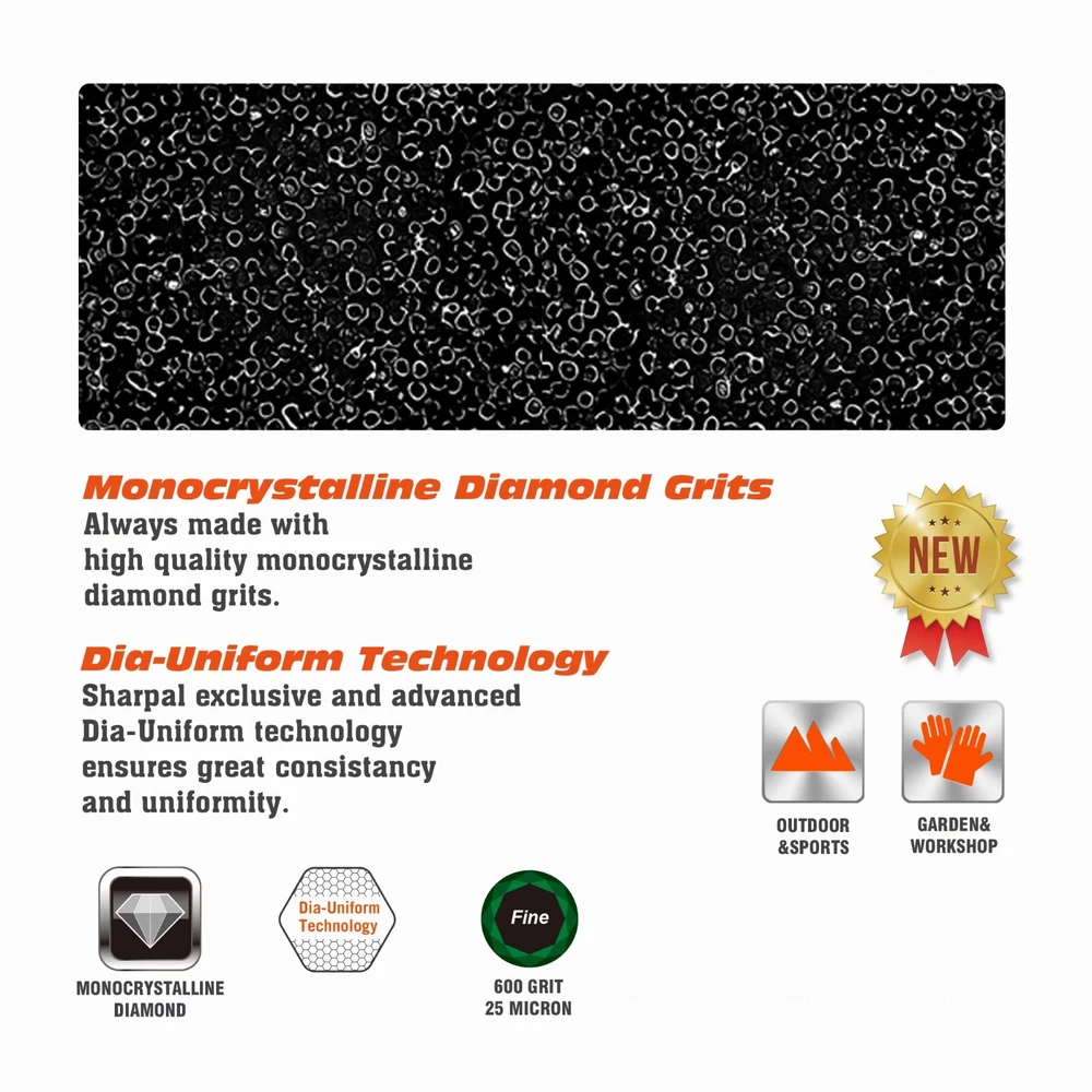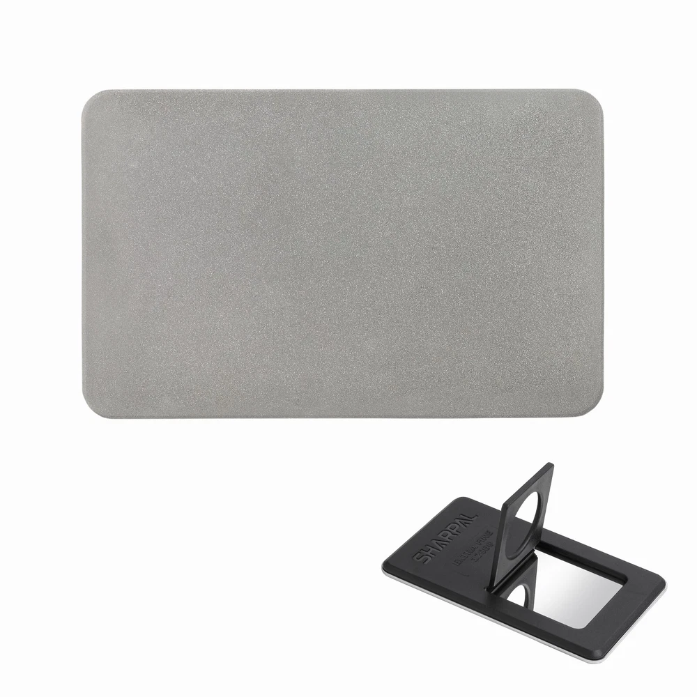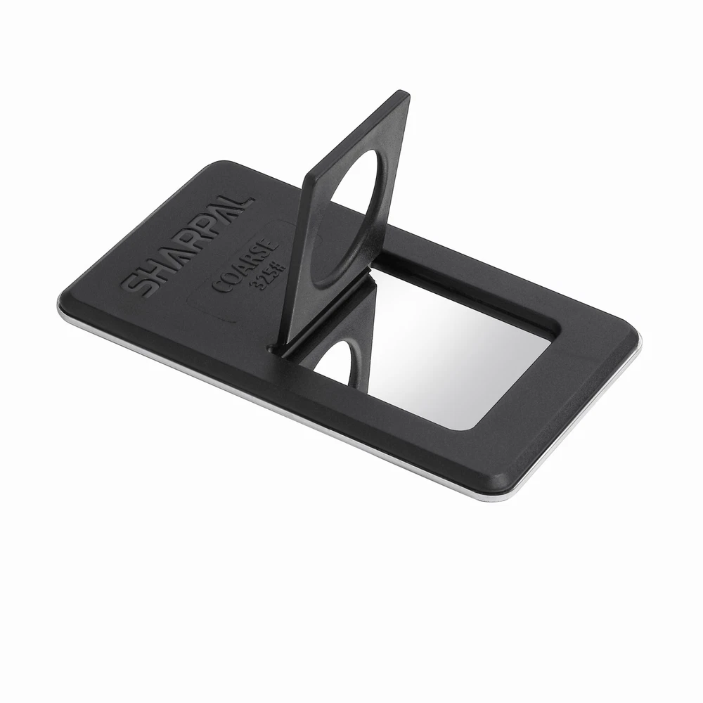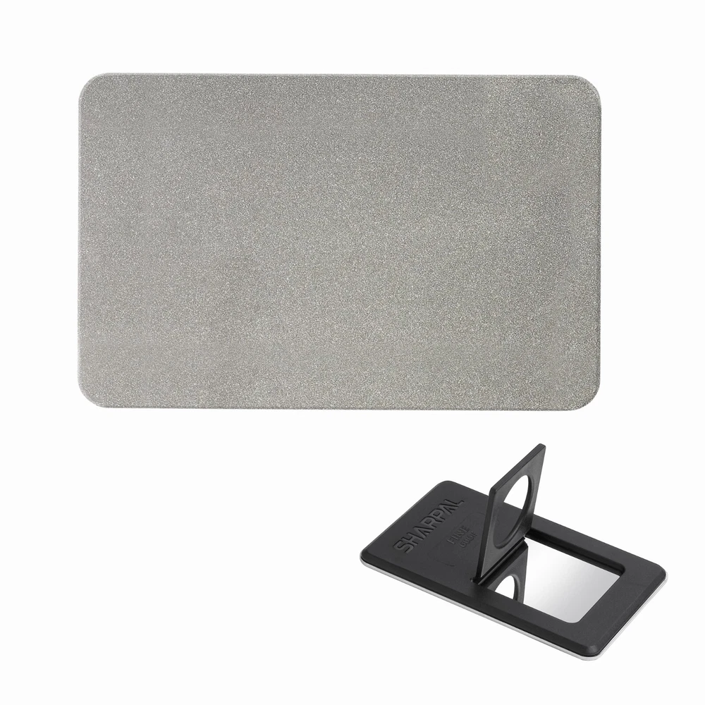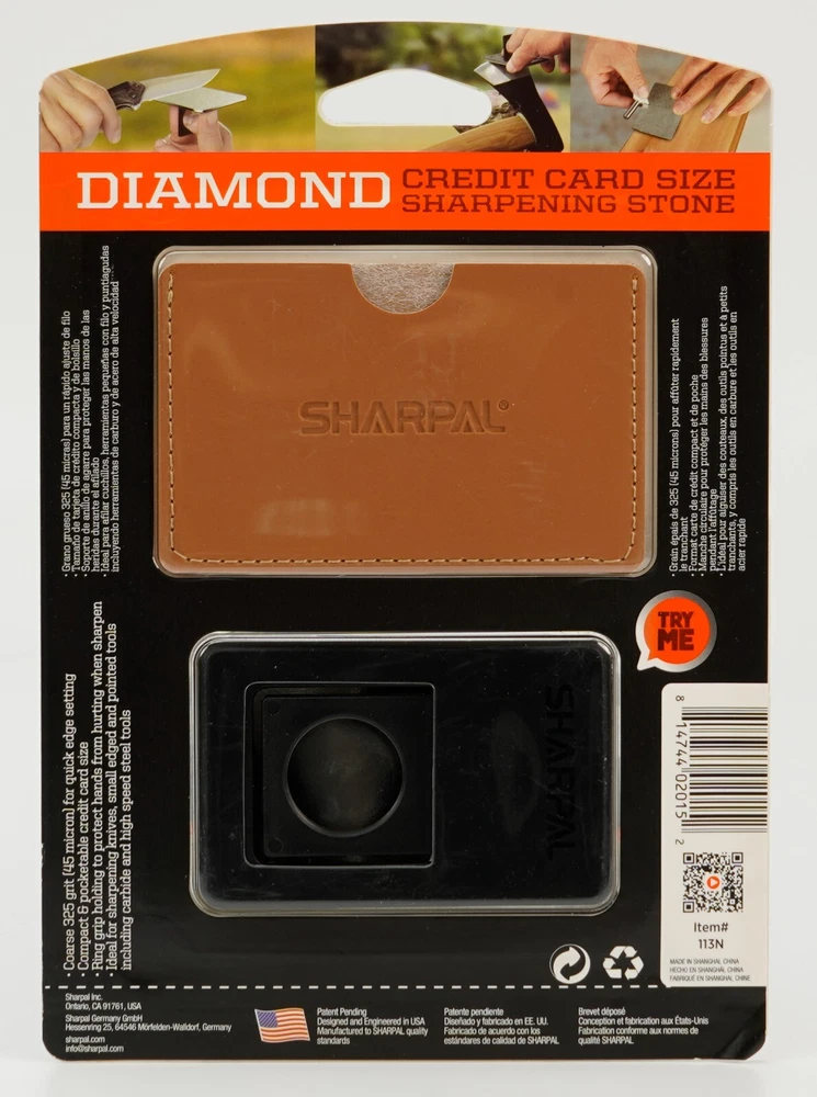 Product Description About SHARPAL Sharpal Inc. is a leading manufacturer of professional and patented multifunction knife and tool sharpeners for the outdoor and sports, garden and workshop, and culinary and kitchen industries. For more than 24 years we have been passionately researching and developing quality products, which provide consumers with an easy and cost-effective way to obtain a sharp edge. SHARPAL Diamond Sharpener-the fastest and most effective way to sharpen an edge! Use and Care There is a ‘break-in’ period for diamond sharpeners. When first use, the surface will appear to be especially rough. This roughness is due to the final manufacturing process and will be removed over time without impacting performance. As the diamond surface wears down, more and more diamond grits are exposed and the sharpener cuts faster. Sharpen dry. No messy oil needed Initial break-in Coarse 325 grit (45 micron) for quick edge setting Fine 600 grit (25 micron) for a sharp edge Extra fine 1200 grit (9 micron) for honing Clean surface and wipe DRY after use Store DRY Key Features Patent Pending Ring Grip Ring grip holding to protect hands from hurting when sharpen Credit Card Size It measures L 3 1/4-inch x W 2 1/8-inch x D .14-inch. and it weighs only 2.2 ounce. Storage Pouch Each with storage pouch for easy carrying. Stainless Steel Body Durable stainless steel construction for years of dependable use. Varied Uses Straight Knife Edge (Including Ceramic Knife) Pocket Knives Hunting Knives Fillet Knives Tactical Knives Chef’s Knives Camp and Garden Tools Axe Hatchet Machete Mower Blade Spade Shears Fishhooks Varied size of hooks Other Edged Tools and Pointed Tools Chisels Router Bit Drills Carbide, high speed steel, titanium, ceramics and most of super hard material